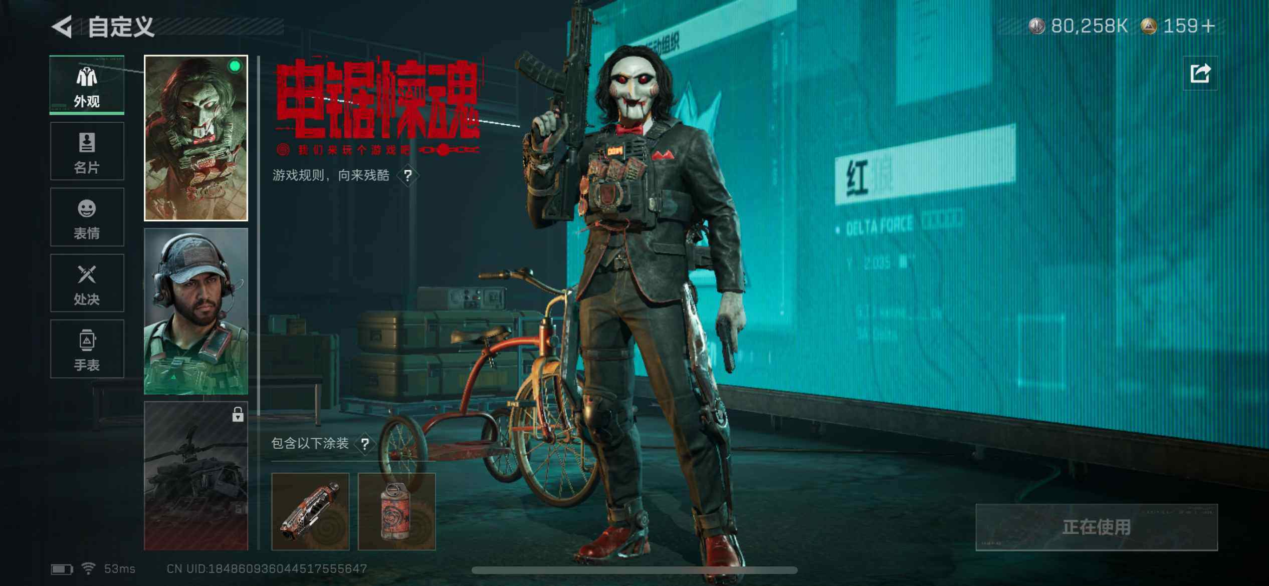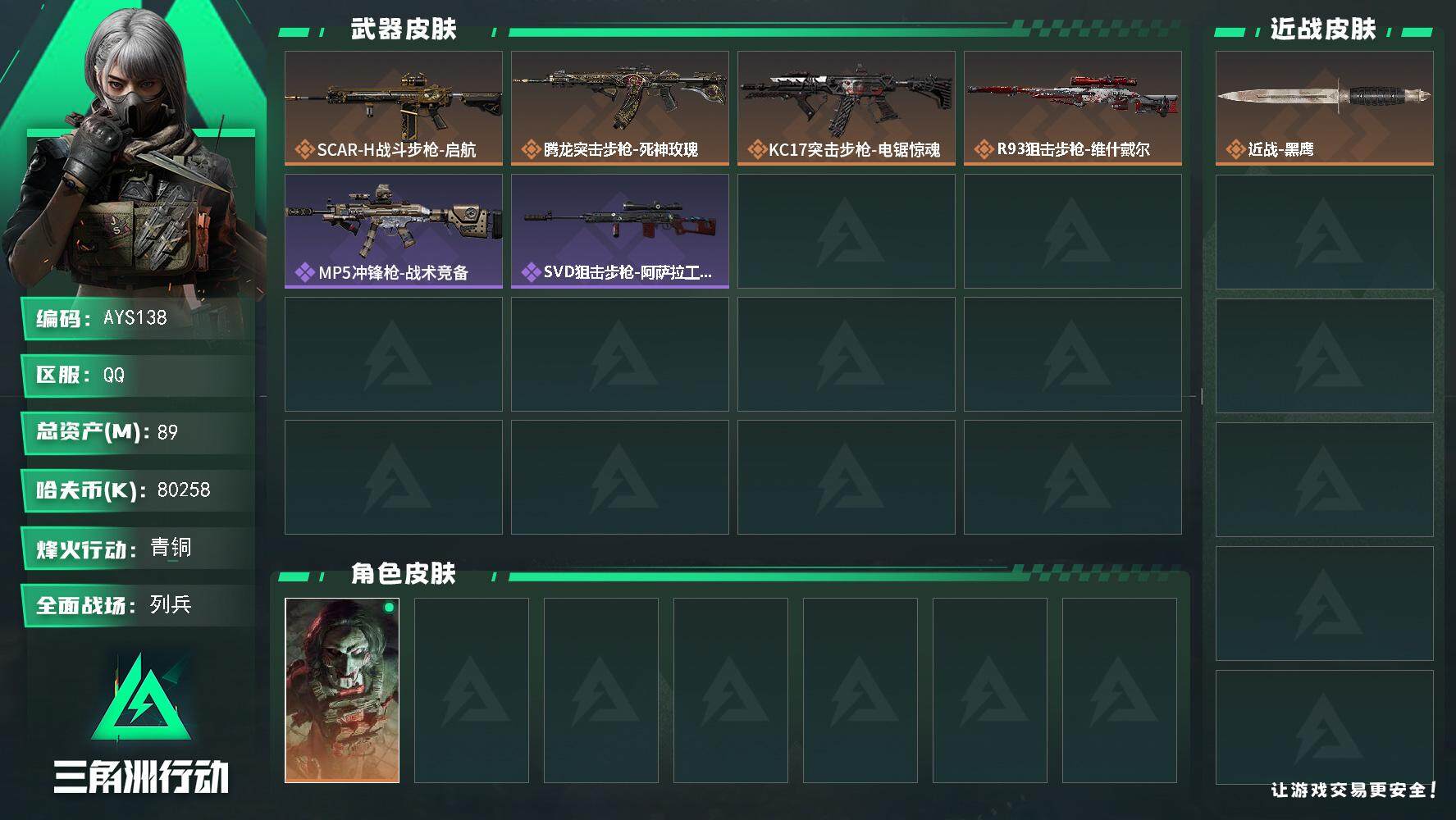 [14511657]【店主推荐捡漏号!可直接换绑】 总资产89m 80258k哈伏币-86m流动资产-43烽火等级-青铜-8战场等级-列兵 【干员外观】:红狼-电锯惊魂 【近战皮肤】:近战-黑鹰 【传说外观】:SCAR-H战斗步枪-启航,腾龙突击步枪-死神玫瑰,KC17突击步枪-电锯惊魂,R93狙击步枪-维什戴尔 【史诗外观】:MP5冲锋枪-战术竞备,SVD狙击步枪-阿萨拉工艺 【稀有外观】:M7战斗步枪-捣蛋鬼,SCAR-H战斗步枪-荣耀列队,MP5冲锋枪-哈夫克卫队,P90冲锋枪-捣蛋鬼,Vector冲锋枪-先锋,UZI冲锋枪-亚特兰蒂斯,QJB201轻机枪-哈夫克卫队,Mini-14射手步枪-荣耀列队 【普通外观】:M4A1突击步枪-高雅黑,M4A1突击步枪-海色,QBZ95-1突击步枪-海浪,K416突击步枪-几何迷彩,K416突击步枪-高雅黑,野牛冲锋枪-高雅黑,M250通用机枪-条纹,SVD狙击步枪-高雅黑,SV-98狙击步枪-红色涂装,QSZ92G-条纹 【载具外观】:轮式突击炮-荣耀 【军牌】:军牌-幸福国,军牌-信誉优秀 【挂饰】:挂饰-维什戴尔,挂饰-诡影狙击兵,挂饰-诡影喷火兵,挂饰-启程
