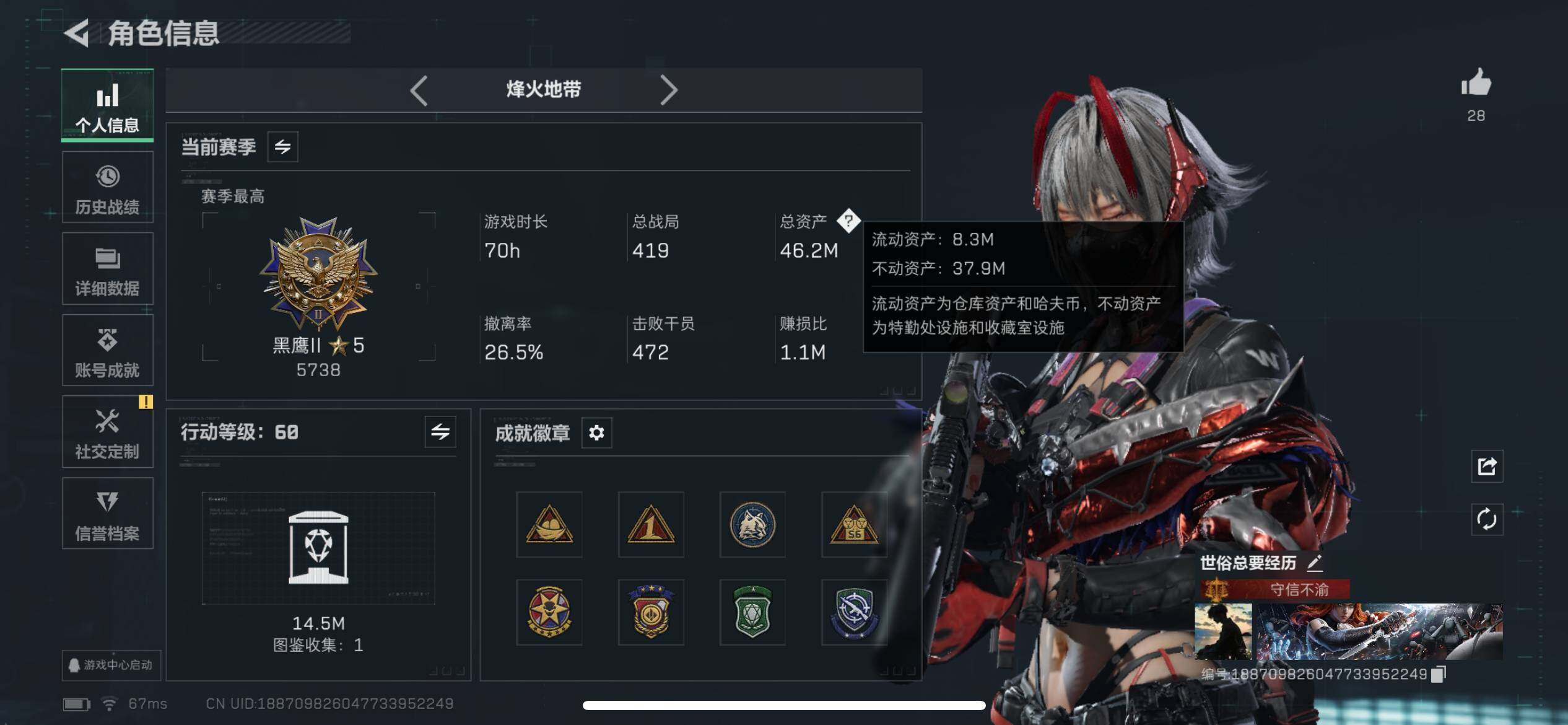 2217k哈伏币-8m流动资产-60烽火等级-黑鹰-15战场等级-上等兵