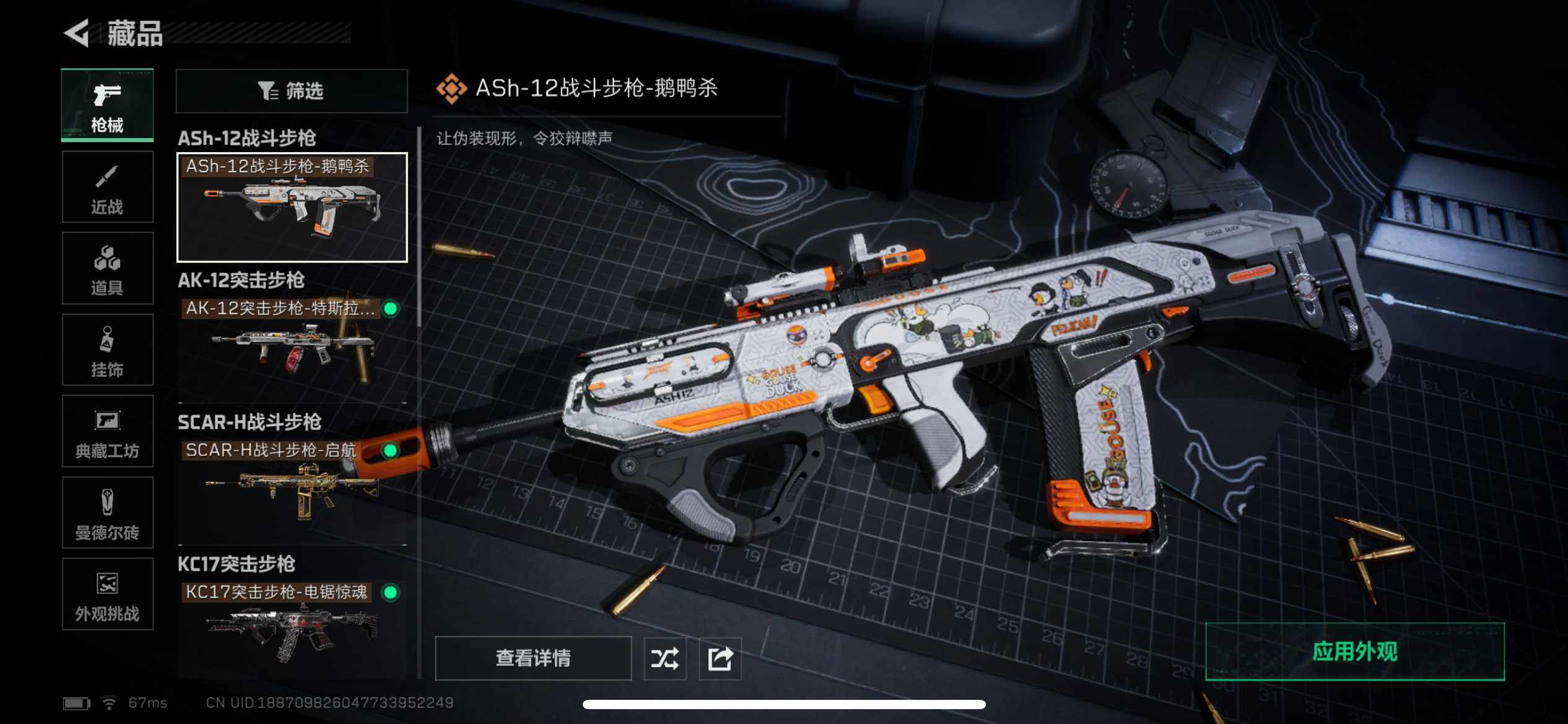 【传说外观】:ASh-12战斗步枪-鹅鸭杀,AK-12突击步枪-特斯拉线圈,SCAR-H战斗步枪-启航,KC17突击步枪-电锯惊魂,P90冲锋枪-信条,UZI冲锋枪-特斯拉线圈,SR-3M紧凑突击步枪-特斯拉线圈,勇士冲锋枪-能天使-午夜邮差,QCQ171冲锋枪-鹅鸭杀,M250通用机枪-骑士之心,QJB201轻机枪-鹅鸭杀,SR-25射手步枪-信条,R93狙击步枪-维什戴尔
