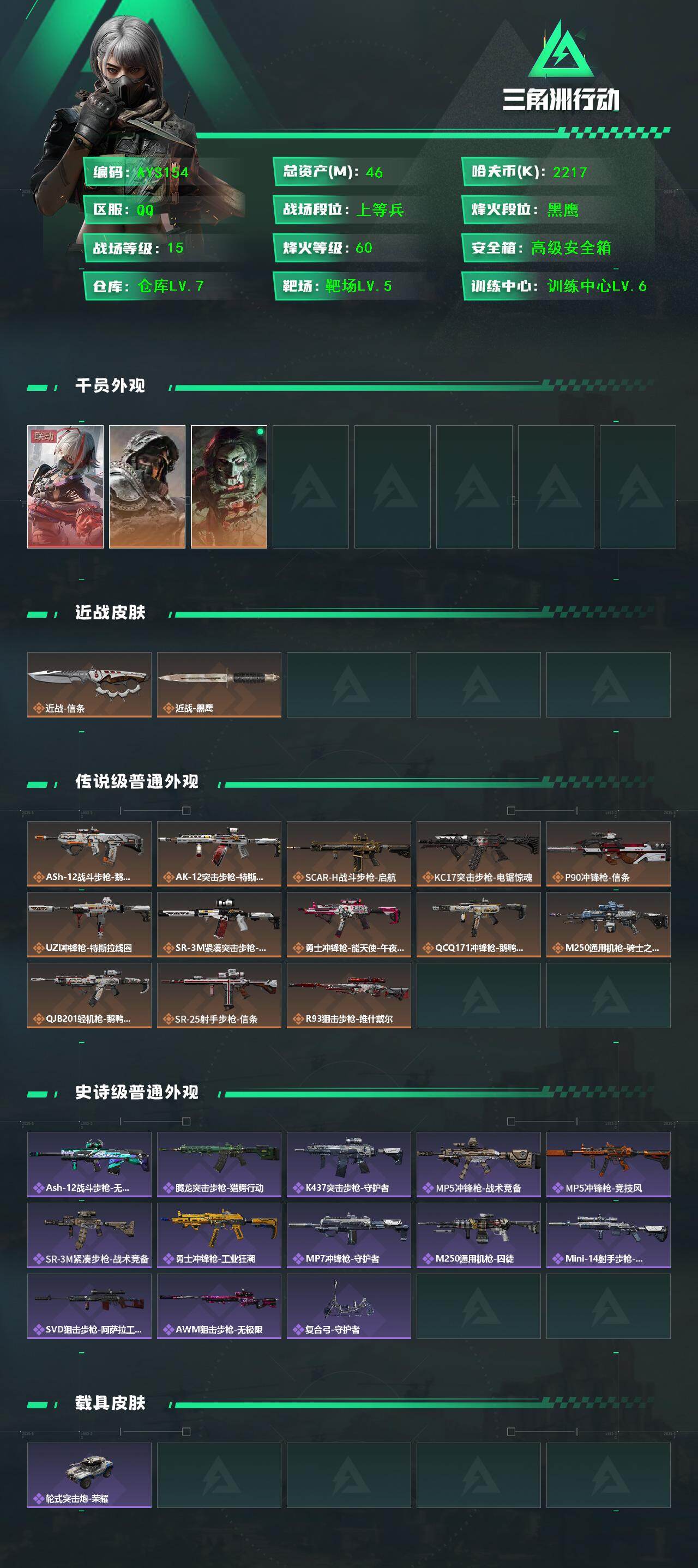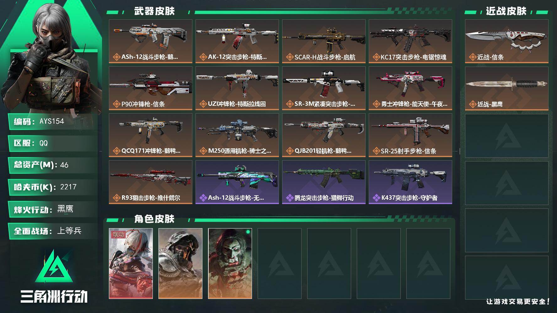 [14512246]【店主推荐捡漏号!可直接换绑】 2217k哈伏币-8m流动资产-60烽火等级-黑鹰-15战场等级-上等兵 【干员外观】:骇爪-维什戴尔,深蓝-不破誓约,红狼-电锯惊魂 【近战皮肤】:近战-信条,近战-黑鹰 【传说外观】:ASh-12战斗步枪-鹅鸭杀,AK-12突击步枪-特斯拉线圈,SCAR-H战斗步枪-启航,KC17突击步枪-电锯惊魂,P90冲锋枪-信条,UZI冲锋枪-特斯拉线圈,SR-3M紧凑突击步枪-特斯拉线圈,勇士冲锋枪-能天使-午夜邮差,QCQ171冲锋枪-鹅鸭杀,M250通用机枪-骑士之心,QJB201轻机枪-鹅鸭杀,SR-25射手步枪-信条,R93狙击步枪-维什戴尔 【史诗外观】:ASh-12战斗步枪-无极限,腾龙突击步枪-猎鳄行动,K437突击步枪-守护者,MP5冲锋枪-战术竞备,MP5冲锋枪-竞技风,SR-3M紧凑突击步枪-战术竞备,勇士冲锋枪-工业狂潮,MP7冲锋枪-守护者,M250通用机枪-囚徒,Mini-14射手步枪-守护者,SVD狙击步枪-阿萨拉工艺,AWM狙击步枪-无极限,复合弓-守护者 【稀有外观】:M4A1突击步枪-战术小队,M4A1突击步枪-零点,M4A1突击步枪-蜂窝科技,AKM突击步枪-战术演练,AKM突击步枪-肃杀,QBZ95-1突击步枪-公平竞技,QBZ95-1突击步枪-精英联盟,K416突击步枪-碳纤维,M7战斗步枪-精英联盟,M7战斗步枪-捣蛋鬼,SCAR-H战斗步枪-荣耀列队,SCAR-H战斗步枪-黄昏,G3战斗步枪-战术演练,G3战斗步枪-主宰,腾龙突击步枪-精英联盟,腾龙突击步枪-冰天雪地,MP5冲锋枪-弄臣,MP5冲锋枪-哈夫克卫队,P90冲锋枪-黄昏,P90冲锋枪-捣蛋鬼,Vector冲锋枪-街头涂鸦,UZI冲锋枪-亚特兰蒂斯,SMG-45冲锋枪-哈夫克卫队,SMG-45-行动开启,SMG-45冲锋枪-幻影结构,勇士冲锋枪-冰天雪地,M1014霰弹枪-幻影结构,S12K霰弹枪-战术演练,QJB201轻机枪-黄昏,QJB201轻机枪-哈夫克卫队,Mini-14射手步枪-荣耀列队,SVD狙击步枪-战术行动,SR-25射手步枪-开拓,SV-98狙击步枪-星链科技,SV-98狙击步枪-哈夫克航天,SV-98狙击步枪-精英联盟,G18-星链科技,G18-哈夫克航天 【普通外观】:M700狙击步枪-蝴蝶,AUG突击步枪-猛