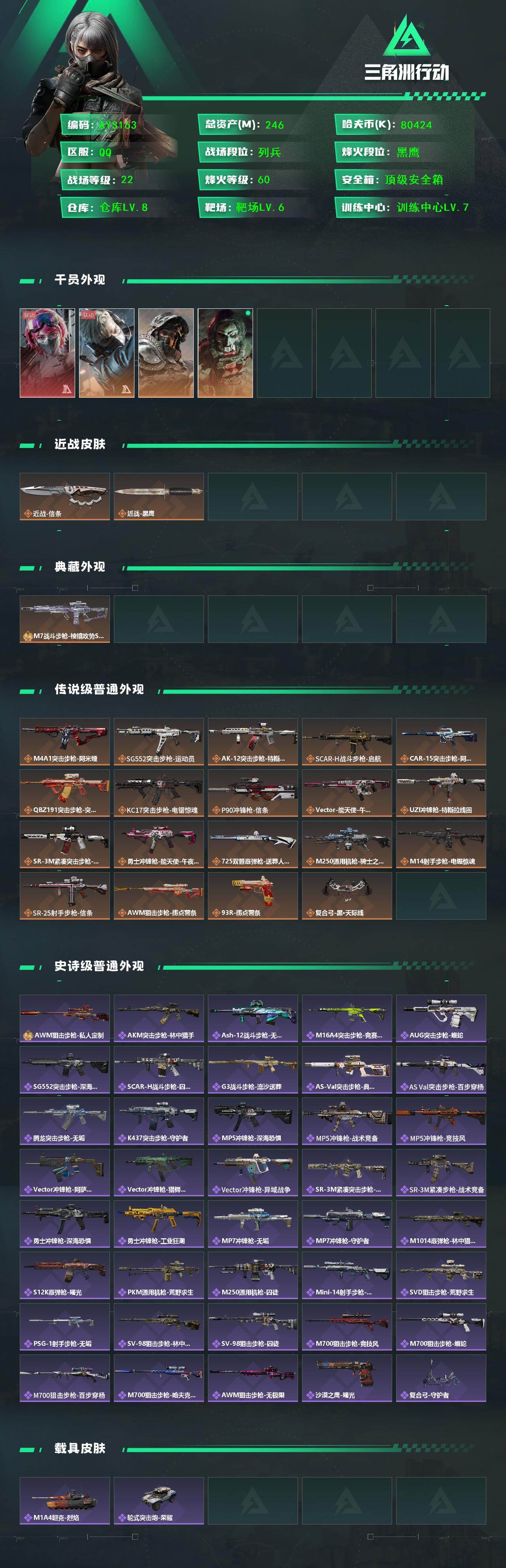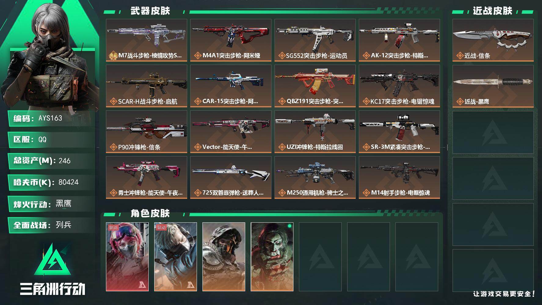 [14512275]【店主推荐捡漏号!可直接换绑】 80424k哈伏币-212m流动资产-60烽火等级-黑鹰-22战场等级-列兵 【干员外观】:蛊-能天使午夜邮差,蜂医-送葬人·无题密令,深蓝-不破誓约,红狼-电锯惊魂 【近战皮肤】:近战-信条,近战-黑鹰 【典藏外观】:M7战斗步枪-棱镜攻势S2 【传说外观】:M4A1突击步枪-阿米娅,SG552突击步枪-运动员,AK-12突击步枪-特斯拉线圈,SCAR-H战斗步枪-启航,CAR-15突击步枪-阿米娅,腾龙突击步枪-捞点薯条,KC17突击步枪-电锯惊魂,P90冲锋枪-信条,Vector冲锋枪-能天使-午夜邮差,UZI冲锋枪-特斯拉线圈,SR-3M紧凑突击步枪-特斯拉线圈,勇士冲锋枪-能天使-午夜邮差,725双管霰弹枪-送葬人-无题密令,M250通用机枪-骑士之心,M14射手步枪-电锯惊魂,SR-25射手步枪-信条,AWM狙击步枪-捞点薯条,93R-捞点薯条,复合弓-黑·天际线 【史诗外观】:AWM狙击步枪-私人定制,AKM突击步枪-林中猎手,ASh-12战斗步枪-无极限,M16A4突击步枪-竞赛选手,AUG突击步枪-蝮蛇,SG552突击步枪-深海恐惧,SCAR-H战斗步枪-囚徒,G3战斗步枪-流沙送葬,AS Val突击步枪-典狱官,AS Val突击步枪-百步穿杨,腾龙突击步枪-无垢,K437突击步枪-守护者,MP5冲锋枪-深海恐惧,MP5冲锋枪-战术竞备,MP5冲锋枪-竞技风,Vector冲锋枪-阿萨拉文明,Vector冲锋枪-猎鳄行动,Vector冲锋枪-异域战争,SR-3M紧凑突击步枪-荒野求生,SR-3M紧凑突击步枪-战术竞备,勇士冲锋枪-深海恐惧,勇士冲锋枪-工业狂潮,MP7冲锋枪-无垢,MP7冲锋枪-守护者,M1014霰弹枪-林中猎手,S12K霰弹枪-曙光,PKM通用机枪-荒野求生,M250通用机枪-囚徒,Mini-14射手步枪-守护者,SVD狙击步枪-荒野求生,PSG-1射手步枪-无垢,SV-98狙击步枪-林中猎手,SV-98狙击步枪-囚徒,M700狙击步枪-竞技风,M700狙击步枪-蝮蛇,M700狙击步枪-百步穿杨,M700狙击步枪-哈夫克警备,AWM狙击步枪-无极限,沙漠之鹰-曙光,复合弓-守护者 【稀有外观】:M14射手步枪-天际线,R93狙击步枪-地平线,AUG突击步枪-旧梦,M4A1突击步枪-繁盛,AKM突击步