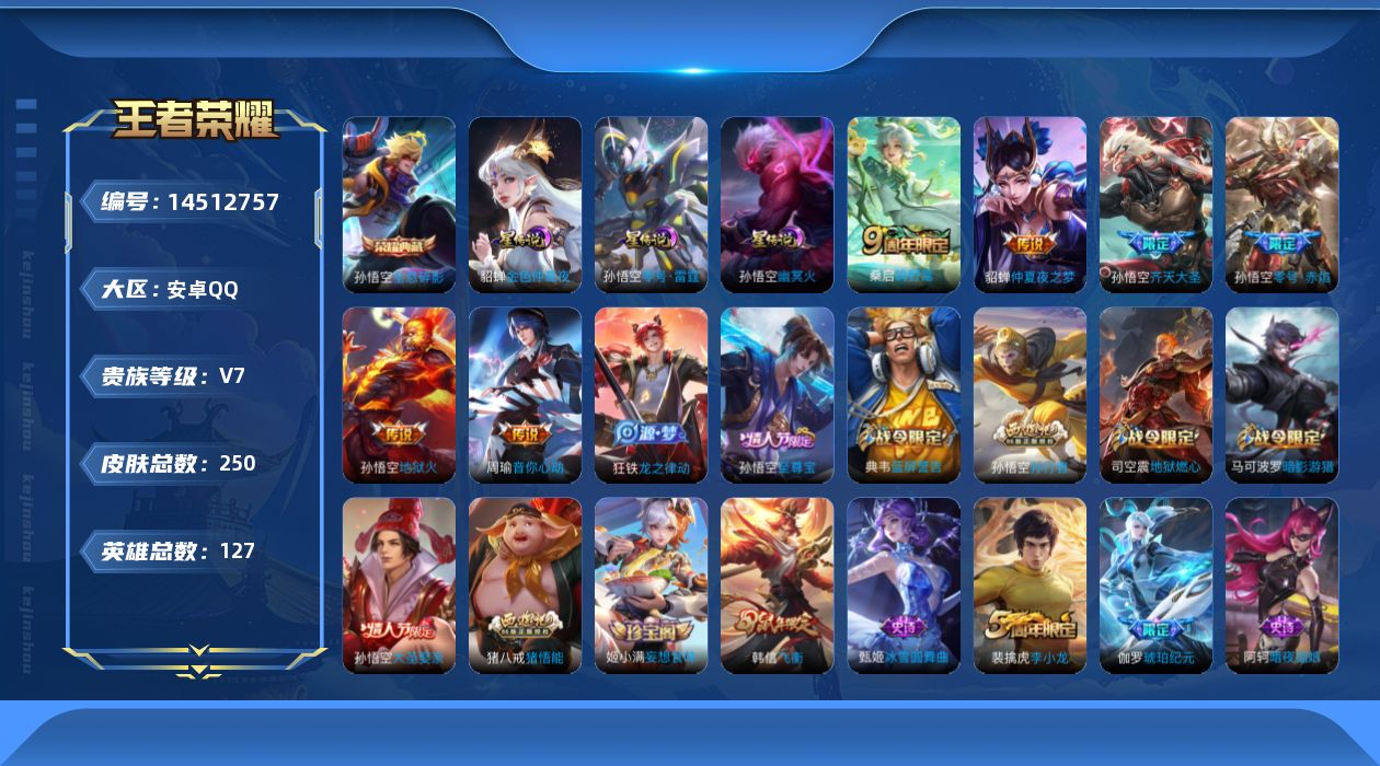 [14512757]【店主推荐捡漏号!可直接换绑】安卓Q-V7-至尊星耀I段位-127英雄-250皮肤-1典藏皮肤-6传说-69史诗 【英雄全皮】:猪八戒全皮 【荣耀典藏】:孙悟空全息碎影 【传说皮肤】:桑启鸣野蒿,孙悟空齐天大圣,周瑜音你心动,孙悟空零号赤焰,貂蝉仲夏夜之梦,孙悟空地狱火 【限定皮肤】:姜子牙天穹之誓,狄仁杰阴阳师,赵云皇家上将,嬴政白昼王子,孙尚香蔷薇恋人,鲁班七号狮舞东方,庄周高山流水,钟无艳王者之锤,芈月重明,吕布猎兽之王,夏侯惇朔风刀,甄姬游园惊梦,曹操烛龙,典韦穷奇,典韦蓝屏警告,马可波罗暗影游猎,狄仁杰魔术师,狄仁杰万华元夜,达摩沙漠行僧,项羽海滩派对,老夫子醍醐杖,程咬金演武夺筹,韩信飞衡,兰陵王金庭之子,孙悟空至尊宝,孙悟空大圣娶亲,孙悟空零号赤焰,孙悟空孙行者,孙悟空齐天大圣,牛魔御旌,李元芳银河之约,李元芳云中旅人,钟馗神迹守卫,钟馗驱傩正仪,女娲朔望之晖,雅典娜黎明之约,鬼谷子原初探秘者,鬼谷子五谷丰年,苏烈千军破阵,百里玄策原初追逐者,弈星混沌棋,梦奇顽趣,沈梦溪星空之诺,沈梦溪大漠名商,明世隐疑决卦,裴擒虎李小龙,裴擒虎擒涛扼浪,狂铁御狮,米莱狄御霄,云中君纤云弄巧,盾山御銮,猪八戒西部大镖客,猪八戒猪悟能,上官婉儿梁祝,鲁班大师探海日志,桑启海盐诗旅,艾琳女武神,艾琳流音漫舞,司空震地狱燃心,阿古朵江河有灵,张良古海寻踪,蒙犽百解令,蒙恬荣光圣徽,高渐离燃音魔法,妲己灵卜魔法,鬼谷子天穹祈灯,伽罗琥珀纪元,姬小满妄想食味,沈梦溪龙舞盛年,鲁班七号蔬乡物语,李元芳蔬乡物语,刘邦剑破天穹,程咬金群星魔术团,周瑜熔金海岸 【年限皮肤】:韩信飞衡 【赛季限定】:芈月重明,夏侯惇朔风刀,曹操烛龙,典韦穷奇,狄仁杰万华元夜,达摩沙漠行僧,老夫子醍醐杖,程咬金演武夺筹,兰陵王金庭之子,张良古海寻踪,牛魔御旌,李元芳云中旅人,钟馗驱傩正仪,雅典娜黎明之约,鬼谷子原初探秘者,苏烈千军破阵,百里玄策原初追逐者,弈星混沌棋,梦奇顽趣,沈梦溪大漠名商,明世隐疑决卦,裴擒虎擒涛扼浪,狂铁御狮,米莱狄御霄,盾山御銮,鲁班大师探海日志,桑启海盐诗旅,鬼谷子天穹祈灯,蒙恬荣光圣徽,刘邦剑破天穹,姜子牙天穹之誓 【战令限定】:嬴政白昼王子,鲁班七号狮舞东方,吕布猎兽之王,典韦蓝屏警告,马可波罗暗影游猎,艾琳流音漫舞,李元芳银河之约,钟馗神迹守卫,女娲朔望之晖,沈梦溪星空之