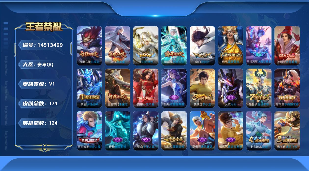- [12936478]安卓Q-V7-至尊星耀IV段位-125英雄-262皮肤-1典藏-0珍品无双-0无双-0珍品传说-6传说-78史诗 【英雄全皮】:鬼谷子全皮,狂铁全皮,司空震全皮 【荣耀典藏】:花木兰九霄神辉 【传说皮肤】:司空震愿照山河定,澜愿照九州拓,云缨幻光神枪,镜炽阳神光,孙尚香末日机甲,宫本武藏地狱之眼 【限定皮肤】:白起狰,狄仁杰阴阳师,虞姬凯尔特女王,赵云皇家上将,嬴政白昼王子,鲁班七号狮舞东方,庄周蜃楼王,高渐离死亡摇滚,高渐离玩趣恶龙,钟无艳超时空战士,孙膑妖精王,扁鹊炼金王,芈月重明,吕布猎兽之王,周瑜赤莲之焰,元歌云间偶戏,元歌无心,夏侯惇朔风刀,甄姬落雪兰心,曹操烛龙,曹操天狼征服者,典韦穷奇,典韦蓝屏警告,马可波罗暗影游猎,狄仁杰魔术师,狄仁杰万华元夜,达摩星际陆战队,达摩沙漠行僧,项羽海滩派对,老夫子醍醐杖,关羽冰锋战神,程咬金演武夺筹,刘邦夺宝奇兵,王昭君午后时光,兰陵王驯魔猎人,兰陵王金庭之子,亚瑟潮玩骑士王,孙悟空至尊宝,牛魔御旌,李元芳银河之约,李元芳云中旅人,钟馗神迹守卫,钟馗驱傩正仪,杨玉环遇见飞天,女娲朔望之晖,雅典娜单词大作战,雅典娜黎明之约,蔡文姬繁星吟游,太乙真人饕餮,太乙真人华丽摇滚,鬼谷子原初探秘者,鬼谷子五谷丰年,苏烈千军破阵,百里玄策原初追逐者,弈星混沌棋,梦奇顽趣,沈梦溪星空之诺,沈梦溪大漠名商,明世隐疑决卦,裴擒虎李小龙,裴擒虎擒涛扼浪,狂铁御狮,狂铁电玩高手,米莱狄御霄,米莱狄胡桃异想国,云中君纤云弄巧,盾山御銮,猪八戒西部大镖客,上官婉儿梁祝,蒙犽狂想玩偶喵,鲁班大师探海日志,艾琳流音漫舞,赵怀真鹤归松栖,司空震地狱燃心,阿古朵江河有灵,张良古海寻踪,鬼谷子天穹祈灯,刘邦剑破天穹 【赛季限定】:庄周蜃楼王,孙膑妖精王,扁鹊炼金王,白起狰,芈月重明,夏侯惇朔风刀,曹操烛龙,典韦穷奇,狄仁杰万华元夜,达摩沙漠行僧,老夫子醍醐杖,程咬金演武夺筹,兰陵王金庭之子,张良古海寻踪,牛魔御旌,李元芳云中旅人,虞姬凯尔特女王,钟馗驱傩正仪,雅典娜黎明之约,太乙真人饕餮,鬼谷子原初探秘者,苏烈千军破阵,百里玄策原初追逐者,弈星混沌棋,梦奇顽趣,沈梦溪大漠名商,明世隐疑决卦,裴擒虎擒涛扼浪,狂铁御狮,米莱狄御霄,盾山御銮,鲁班大师探海日志,鬼谷子天穹祈灯,刘邦剑破天穹 【战令限定】:嬴政白昼王子,鲁班七号狮舞东方,钟无艳超时空战士,吕布猎