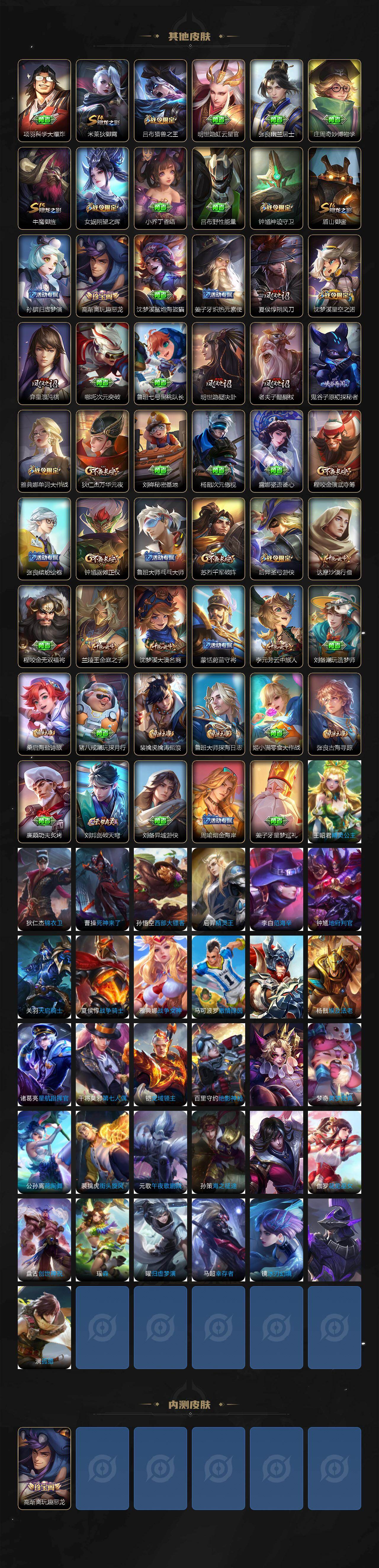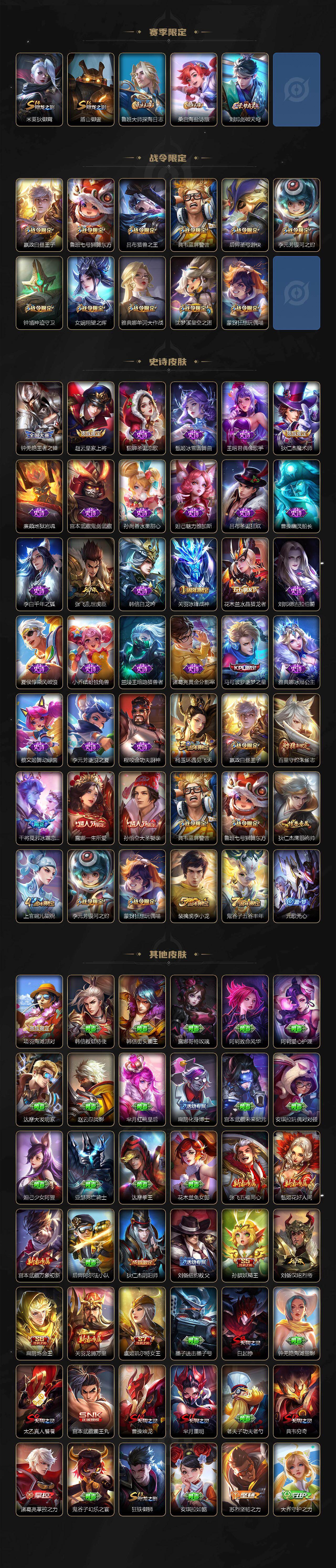 【赛季限定】:孙膑妖精王,扁鹊炼金王,白起狰,芈月重明,夏侯惇朔风刀,曹操烛龙,典韦穷奇,狄仁杰万华元夜,达摩沙漠行僧,老夫子醍醐杖,程咬金演武夺筹,兰陵王金庭之子,张良古海寻踪,牛魔御旌,李元芳云中旅人,虞姬凯尔特女王,钟馗驱傩正仪,太乙真人饕餮,鬼谷子原初探秘者,苏烈千军破阵,弈星混沌棋,沈梦溪大漠名商,明世隐疑决卦,裴擒虎擒涛扼浪,狂铁御狮,米莱狄御霄,盾山御銮,鲁班大师探海日志,桑启海盐诗旅,刘邦剑破天穹
