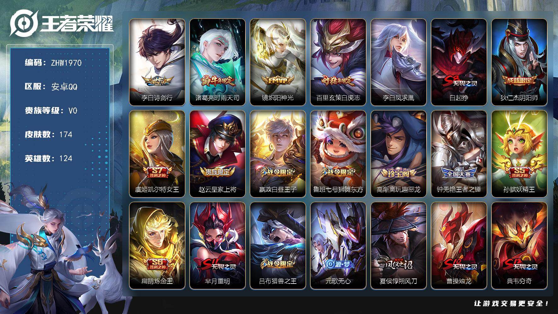 [14513499]【店主推荐捡漏号!可直接换绑/六千一市6狄仁杰/市100梦奇/五千一星币可兑换星元皮肤】:安卓Q-V7-永恒钻石IV段位-124英雄-174皮肤-5传说-42史诗 【传说皮肤】:李白诗剑行,诸葛亮时雨天司,镜炽阳神光,百里玄策白虎志,李白凤求凰 【限定皮肤】:白起狰,狄仁杰阴阳师,虞姬凯尔特女王,赵云皇家上将,嬴政白昼王子,鲁班七号狮舞东方,高渐离玩趣恶龙,钟无艳王者之锤,孙膑妖精王,扁鹊炼金王,芈月重明,吕布猎兽之王,元歌无心,夏侯惇朔风刀,曹操烛龙,典韦穷奇,典韦蓝屏警告,马可波罗逐梦之星,狄仁杰魔术师,狄仁杰万华元夜,达摩沙漠行僧,项羽海滩派对,老夫子醍醐杖,关羽冰锋战神,程咬金演武夺筹,露娜一生所爱,兰陵王金庭之子,孙悟空大圣娶亲,牛魔御旌,后羿圣弓游侠,李元芳银河之约,李元芳云中旅人,钟馗神迹守卫,钟馗驱傩正仪,杨玉环遇见飞天,女娲朔望之晖,干将莫邪冰霜恋舞曲,雅典娜单词大作战,太乙真人饕餮,鬼谷子原初探秘者,鬼谷子五谷丰年,诸葛亮时雨天司,苏烈千军破阵,百里玄策白虎志,百里守约朱雀志,弈星混沌棋,沈梦溪星空之诺,沈梦溪大漠名商,明世隐疑决卦,裴擒虎李小龙,裴擒虎擒涛扼浪,狂铁御狮,米莱狄御霄,盾山御銮,上官婉儿梁祝,蒙犽狂想玩偶喵,鲁班大师探海日志,桑启海盐诗旅,张良古海寻踪,刘邦剑破天穹,刘备异域游侠,周瑜熔金海岸 【年限皮肤】:百里玄策白虎志,百里守约朱雀志,李白凤求凰,诸葛亮时雨天司 【赛季限定】:孙膑妖精王,扁鹊炼金王,白起狰,芈月重明,夏侯惇朔风刀,曹操烛龙,典韦穷奇,狄仁杰万华元夜,达摩沙漠行僧,老夫子醍醐杖,程咬金演武夺筹,兰陵王金庭之子,张良古海寻踪,牛魔御旌,李元芳云中旅人,虞姬凯尔特女王,钟馗驱傩正仪,太乙真人饕餮,鬼谷子原初探秘者,苏烈千军破阵,弈星混沌棋,沈梦溪大漠名商,明世隐疑决卦,裴擒虎擒涛扼浪,狂铁御狮,米莱狄御霄,盾山御銮,鲁班大师探海日志,桑启海盐诗旅,刘邦剑破天穹 【战令限定】:嬴政白昼王子,鲁班七号狮舞东方,吕布猎兽之王,典韦蓝屏警告,后羿圣弓游侠,李元芳银河之约,钟馗神迹守卫,女娲朔望之晖,雅典娜单词大作战,沈梦溪星空之诺,蒙犽狂想玩偶喵 【史诗皮肤】:钟无艳王者之锤,赵云皇家上将,貂蝉圣诞恋歌,甄姬冰雪圆舞曲,王昭君偶像歌手,狄仁杰魔术师,廉颇地狱岩魂,宫本武藏鬼剑武藏,孙尚香水果甜心,妲己魅力维加斯,吕布圣诞