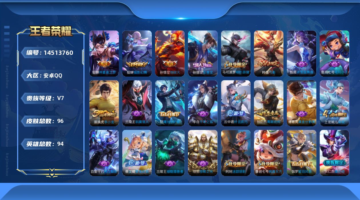 [14513760]【店主推荐捡漏号!可直接换绑】安卓Q-V7-至尊星耀I段位-94英雄-96皮肤-3传说-26史诗