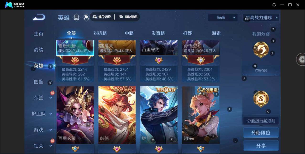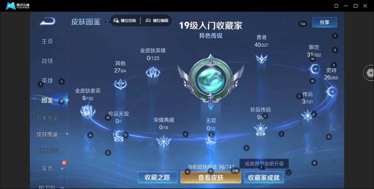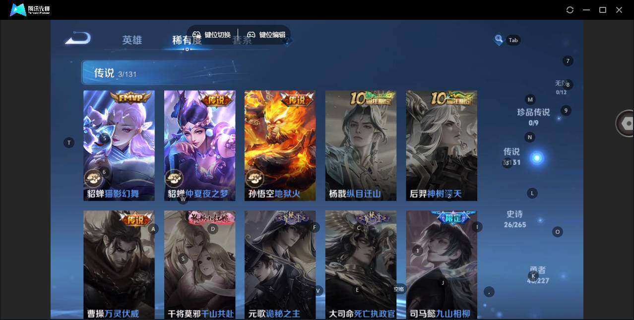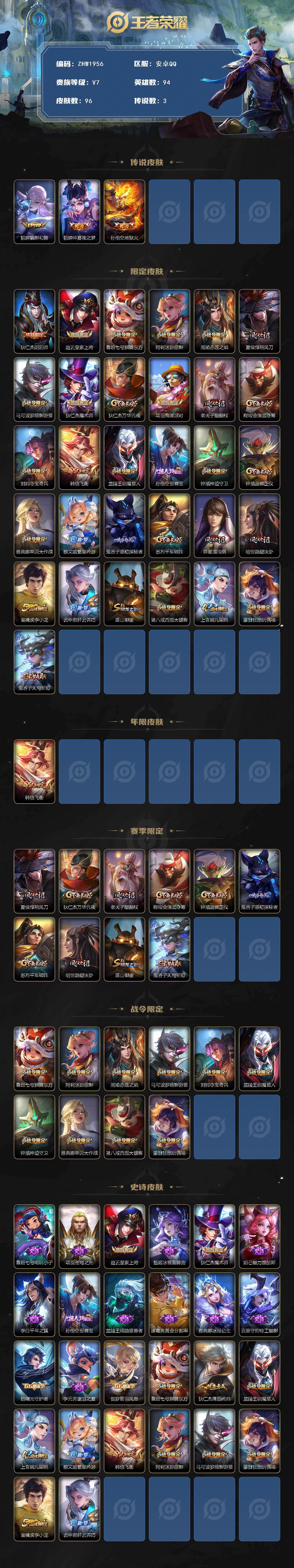 - PX_2081174-贵族等级: V4 英雄数: 121 皮肤数: 158 传说皮: 无双飞将,山海·炽霜斩,山海·苍雷引,幻光神枪 限定皮: 梁祝,引擎之心,飞衡,天狼狩猎者,孙行者,五谷丰年,诗剑行,山海·玄木吟,鸣野蒿,愿照·九州拓