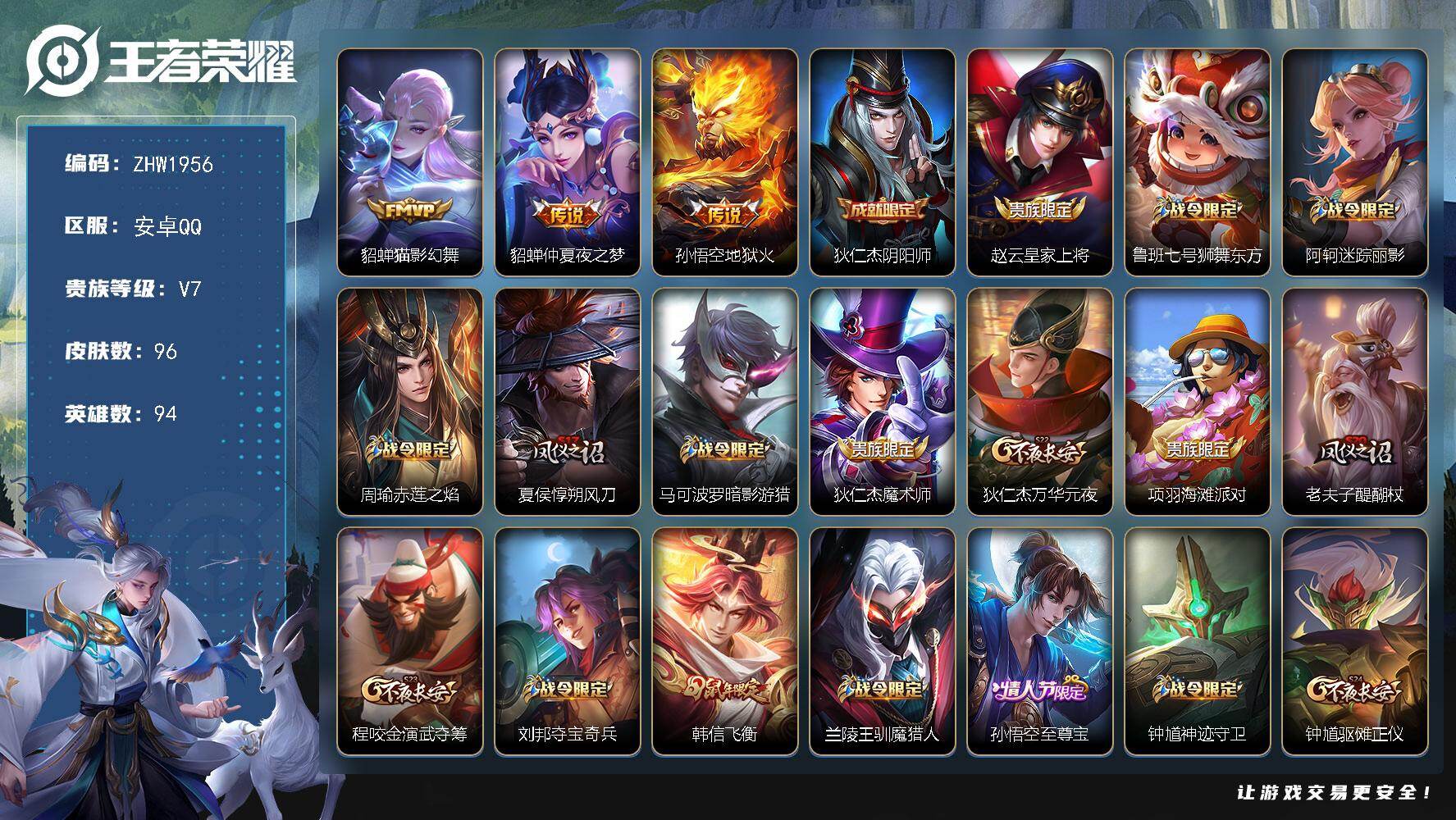[14513760]【店主推荐捡漏号!可直接换绑】安卓Q-V7-至尊星耀I段位-94英雄-96皮肤-3传说-26史诗 【传说皮肤】:貂蝉猫影幻舞,貂蝉仲夏夜之梦,孙悟空地狱火 【限定皮肤】:狄仁杰阴阳师,赵云皇家上将,鲁班七号狮舞东方,阿轲迷踪丽影,周瑜赤莲之焰,夏侯惇朔风刀,马可波罗暗影游猎,狄仁杰魔术师,狄仁杰万华元夜,项羽海滩派对,老夫子醍醐杖,程咬金演武夺筹,刘邦夺宝奇兵,韩信飞衡,兰陵王驯魔猎人,孙悟空至尊宝,钟馗神迹守卫,钟馗驱傩正仪,雅典娜单词大作战,蔡文姬繁星吟游,鬼谷子原初探秘者,苏烈千军破阵,弈星混沌棋,明世隐疑决卦,裴擒虎李小龙,云中君纤云弄巧,盾山御銮,猪八戒西部大镖客,上官婉儿梁祝,蒙犽狂想玩偶喵,鬼谷子天穹祈灯 【年限皮肤】:韩信飞衡 【赛季限定】:夏侯惇朔风刀,狄仁杰万华元夜,老夫子醍醐杖,程咬金演武夺筹,钟馗驱傩正仪,鬼谷子原初探秘者,苏烈千军破阵,弈星混沌棋,明世隐疑决卦,盾山御銮,鬼谷子天穹祈灯 【战令限定】:鲁班七号狮舞东方,阿轲迷踪丽影,周瑜赤莲之焰,马可波罗暗影游猎,刘邦夺宝奇兵,兰陵王驯魔猎人,钟馗神迹守卫,雅典娜单词大作战,猪八戒西部大镖客,蒙犽狂想玩偶喵 【史诗皮肤】:鲁班七号电玩小子,项羽苍穹之光,赵云皇家上将,甄姬冰雪圆舞曲,狄仁杰魔术师,妲己魅力维加斯,李白千年之狐,孙悟空至尊宝,兰陵王暗隐猎兽者,诸葛亮黄金分割率,雅典娜冰冠公主,百里守约特工魅影,铠曙光守护者,李元芳逐浪之夏,伽罗箭羽风息,鲁班七号狮舞东方,狄仁杰鹰眼统帅,兰陵王驯魔猎人,上官婉儿梁祝,蔡文姬繁星吟游,韩信飞衡,阿轲迷踪丽影,马可波罗暗影游猎,蒙犽狂想玩偶喵,裴擒虎李小龙,云中君纤云弄巧 【其他皮肤】:项羽海滩派对,韩信教廷特使,露娜哥特玫瑰,达摩大发明家,程咬金爱与正义,扁鹊化身博士,宫本武藏未来纪元,安琪拉玩偶对对碰,妲己少女阿狸,典韦黄金武士,亚瑟死亡骑士,花木兰兔女郎,狄仁杰阴阳师,钟无艳海滩丽影,宫本武藏霸王丸,孙尚香沉稳之力,诸葛亮掌控之力,吕布野性能量,钟馗神迹守卫,盾山御銮,夏侯惇朔风刀,周瑜赤莲之焰,弈星混沌棋,鲁班七号黑桃队长,明世隐疑决卦,刘邦夺宝奇兵,盾山圆桌骑士,老夫子醍醐杖,猪八戒西部大镖客,鬼谷子原初探秘者,雅典娜单词大作战,狄仁杰万华元夜,刘禅秘密基地,露娜瓷语鉴心,程咬金演武夺筹,钟馗驱傩正仪,鲁班大师乓乓大师,苏烈千军破阵,鬼