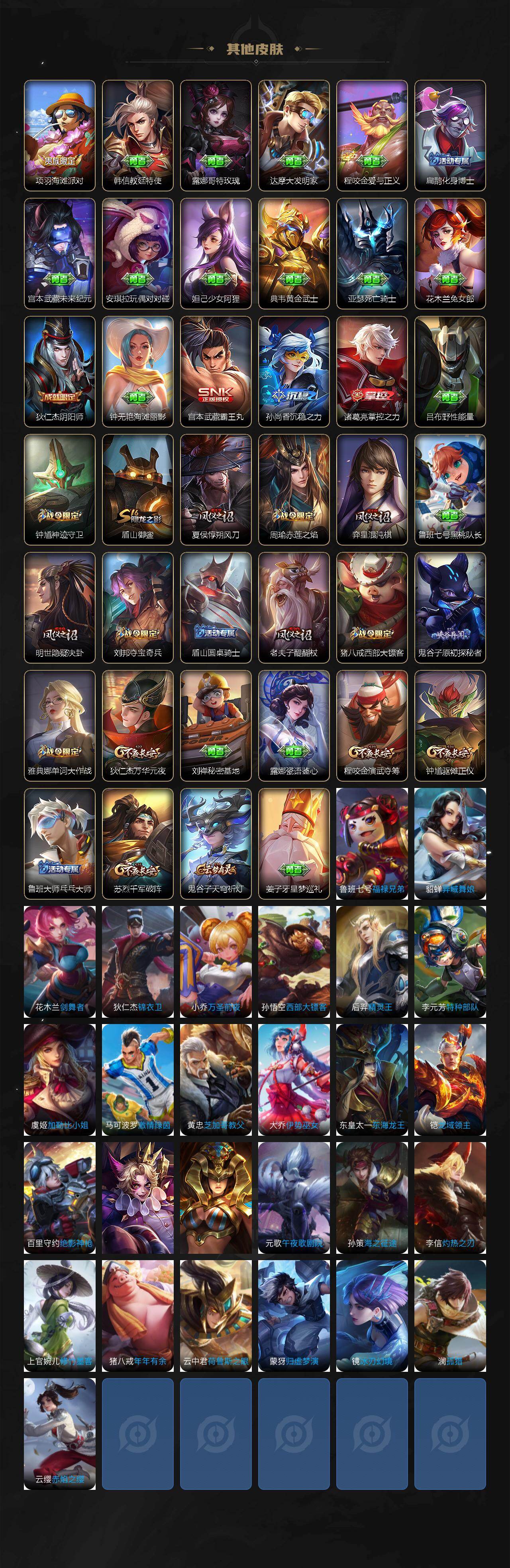 【其他皮肤】:项羽海滩派对,韩信教廷特使,露娜哥特玫瑰,达摩大发明家,程咬金爱与正义,扁鹊化身博士,宫本武藏未来纪元,安琪拉玩偶对对碰,妲己少女阿狸,典韦黄金武士,亚瑟死亡骑士,花木兰兔女郎,狄仁杰阴阳师,钟无艳海滩丽影,宫本武藏霸王丸,孙尚香沉稳之力,诸葛亮掌控之力,吕布野性能量,钟馗神迹守卫,盾山御銮,夏侯惇朔风刀,周瑜赤莲之焰,弈星混沌棋,鲁班七号黑桃队长,明世隐疑决卦,刘邦夺宝奇兵,盾山圆桌骑士,老夫子醍醐杖,猪八戒西部大镖客,鬼谷子原初探秘者,雅典娜单词大作战,狄仁杰万华元夜,刘禅秘密基地,露娜瓷语鉴心,程咬金演武夺筹,钟馗驱傩正仪,鲁班大师乓乓大师,苏烈千军破阵,鬼