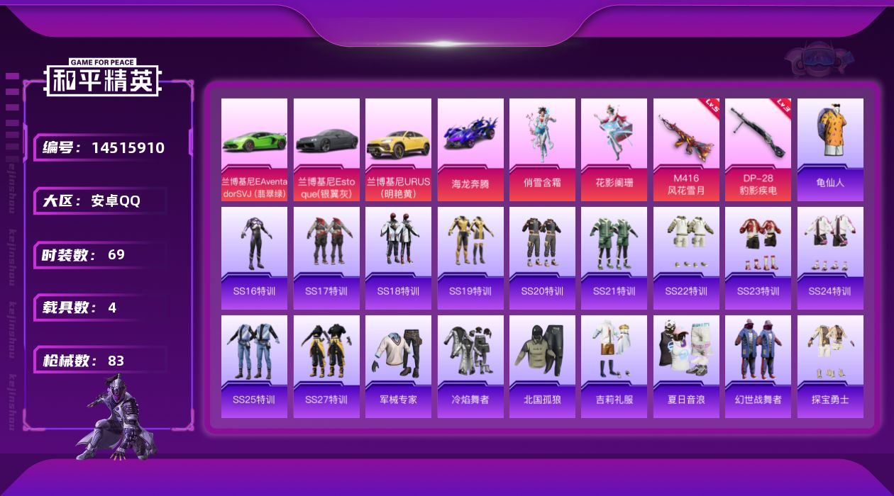 [14515910]可二次【店主推荐捡漏号!可直接换绑】 安卓 手Q-2粉装-2特效枪-4载具-2.9w热力值-2王牌印记-69套装-83枪皮【热门品类】:套装-龟仙人【粉色载具】:兰博基尼Aventador SVJ(翡翠绿),兰博基尼Estoque(银翼灰),兰博基尼URUS(明艳黄),海龙奔腾【粉色套装】:粉装-花影阑珊,粉装-俏雪含霜【粉色枪皮等级】:M416-风花雪月(五级),DP-28-豹影疾电(三级)
