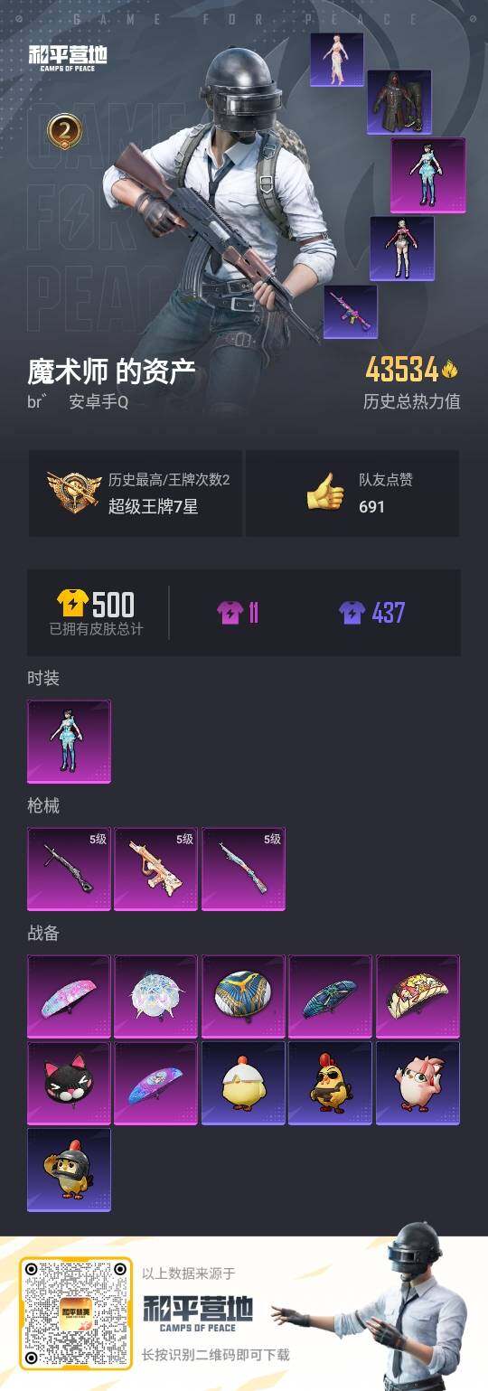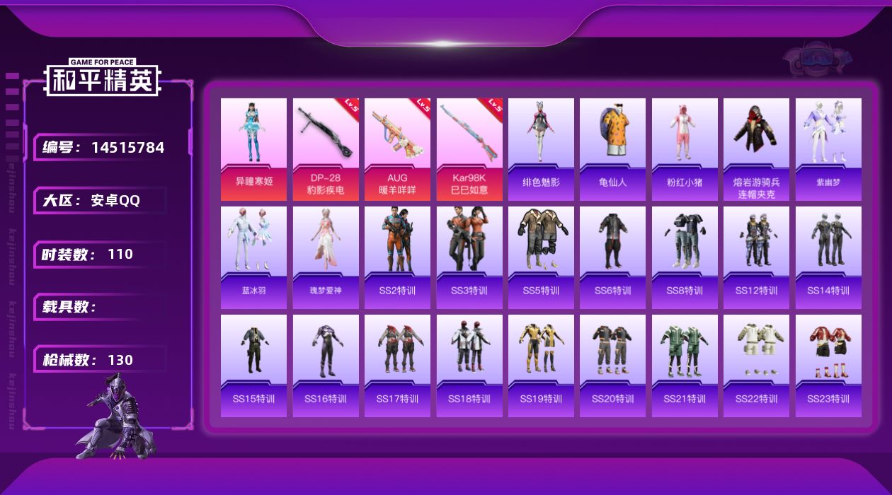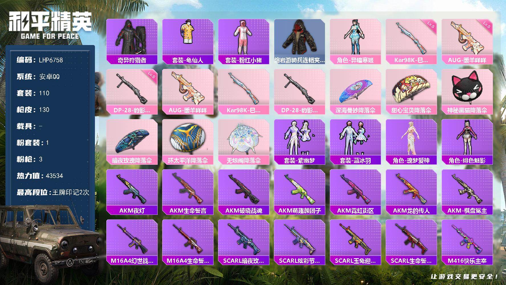 [14515784]可二次【店主推荐捡漏号!可直接换绑】 安卓 手Q-1粉装-3特效枪-4.3w热力值-2王牌印记-110套装-130枪皮【热门品类】:套装-奇异狩猎者,套装-龟仙人,套装-粉红小猪,熔岩游骑兵连帽夹克【粉色套装】:角色-异瞳寒姬【粉色枪皮等级】:AUG-暖羊咩咩(五级),Kar98K-巳巳如意(五级),DP-28-豹影疾电(五级)
