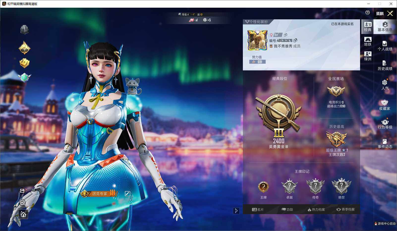 - PX_2089837-实名: 可修改 贵族等级: V5 英雄数: 103 皮肤数: 71 传说皮: 一念神魔 限定皮: 李小龙,梁祝,时雨天司,朱雀志