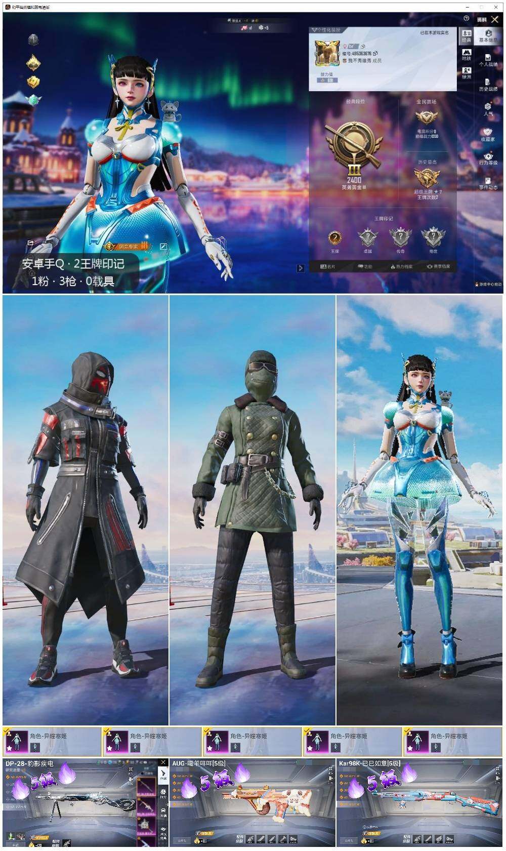 - [15657449]【特价出售/店主推荐】安卓 微信-1神装-6粉装-3特效枪-0载具-3粉色飞行器-50960热力值-5王牌印记-152套装-156枪皮【红色神装等级】:镜域双华-欧若拉(一级)【红色角色神装】:镜域双华-欧若拉【热门品类】:粉装-梦幻火箭,套装-小丑鱼,套装-沙漠守护者,套装-浪漫波比【粉色套装】:粉装-蝶舞迷情,粉装-梦幻火箭,粉装-智能音符,粉装-古堡领主,粉装-蜜语绒猫,角色-异瞳寒姬【粉色枪皮等级】:Kar98K-巳巳如意(五级),M24-镜域双华(三级),DP-28-豹影疾电(五级)【粉色枪皮】:Kar98K-巳巳如意,M24-镜域双华,DP-28-豹影疾电【粉色飞行器】:梦幻火箭飞行器,镜域双华-灵镜之阶,极意拳锋飞行器