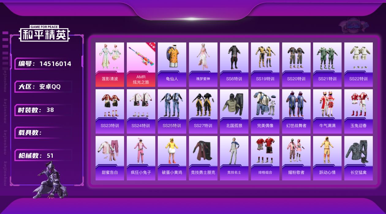 [14516014]可二次【店主推荐捡漏号!可直接换绑】安卓 手Q-1粉装-1特效枪-1.6w热力值-3王牌印记-38套装-51枪皮【热门品类】:套装-龟仙人【粉色套装】:粉装-莲影清波【粉色枪皮等级】:AMR-炫光之旅(六级)