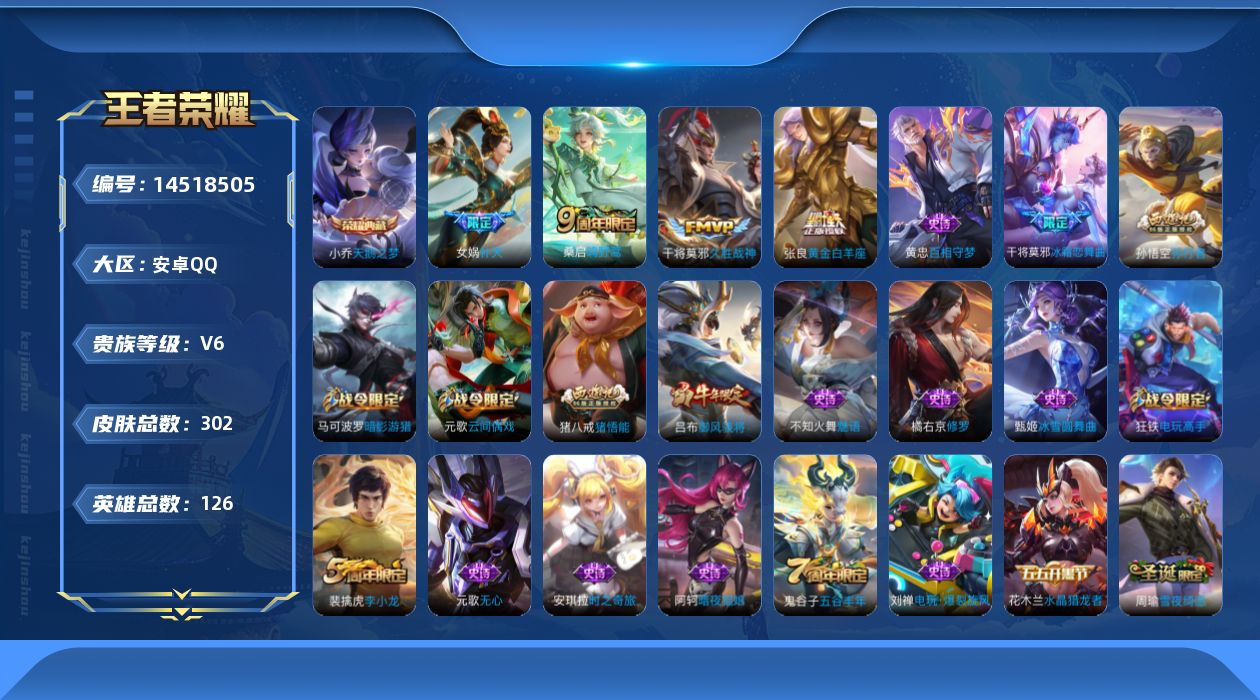 - [11657499]V8 2典藏 2珍品传说 31传说 125英雄 286皮肤 可修改实名 优质装备:九霄神辉(木兰典藏),神鉴启示录,江户川柯南,怪盗基德,冠军飞将,云鹰飞将(小将军),绛天战甲(鸡嘴战神),久胜战神,炽阳神光,一念神魔,零号·赤焰,地狱之眼,时之恋人-刘备(电焊工),超时空战士-狄仁杰,无双飞将,山海·炽霜斩(李信年限),山海·琳琅生(小乔年限),山海·苍雷引(电光曜子),浮生妄,妄想实况,霜月吟,澜逐花归海 传说皮:乘龙·淬吴钩(孙策年限),落雪白狼,九山相柳,幻光神枪 珍宝阁皮:万物之道,蔷薇恋人 限定皮:愿照·九州拓(澜年限),愿照·山河定(司空震年限),陌上桑,鸣野蒿,傲雪梅枪,补天,飞衡(韩信年限),山海·碧波行(瑶年限),无限倾心-项羽,影龙天霄,诗剑行,五谷丰年,梁祝,御风骁将(吕布年限),龙胆,岱宗(典韦年限),逐梦之音,默契交锋-兰陵王,孙行者,玉兔公主,神器·万象笔,山海·玄木吟(马可年限),冰霜神祇 史诗皮:化蝶舞,星界战将,龙之律动,雪豹·霜爪,茶境仙,怒海争锋,炽弈燎原,东方月初,蒙犽顽岩魄,芈月浮光幕影,琥珀纪元伽罗,蔬乡物语(鲁班七号),紫霞仙子,千年之狐,永昼,江河有灵,匿光侦查者,鹤归松栖(赵怀真),雪夜绮愿(周瑜),真我赫兹(百里守约),魅语,百解令(蒙犽),高渐离燃音魔法,蒙恬荣光圣徽,匿光破解者,冰冠公主,偶像歌手,百相守梦(刘备),暗夜猫娘,猫狗日记-大乔,节奏热浪,修罗,女仆咖啡,水果甜心,星夜王子,心灵骇客,功夫厨神,暗隐猎兽者,幽灵船长,鬼剑武藏,暗渊魔法,天秀·启明,舞动绿茵,诗语江南,纤云弄巧,拒霜思,乘风破浪,逐浪之夏,水晶猎龙者,金属风暴,圣诞狂欢,圣诞恋歌,鹰眼统帅,暗夜贵公子,无心,未来纪元-赵云