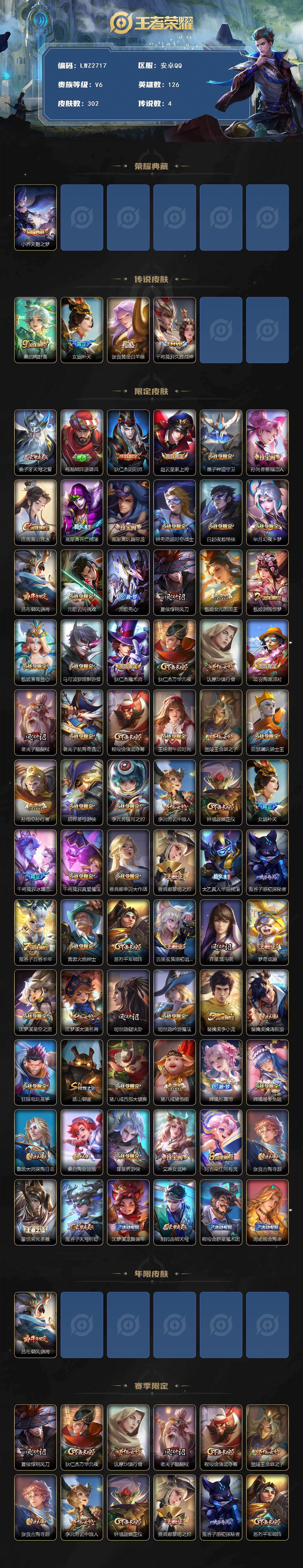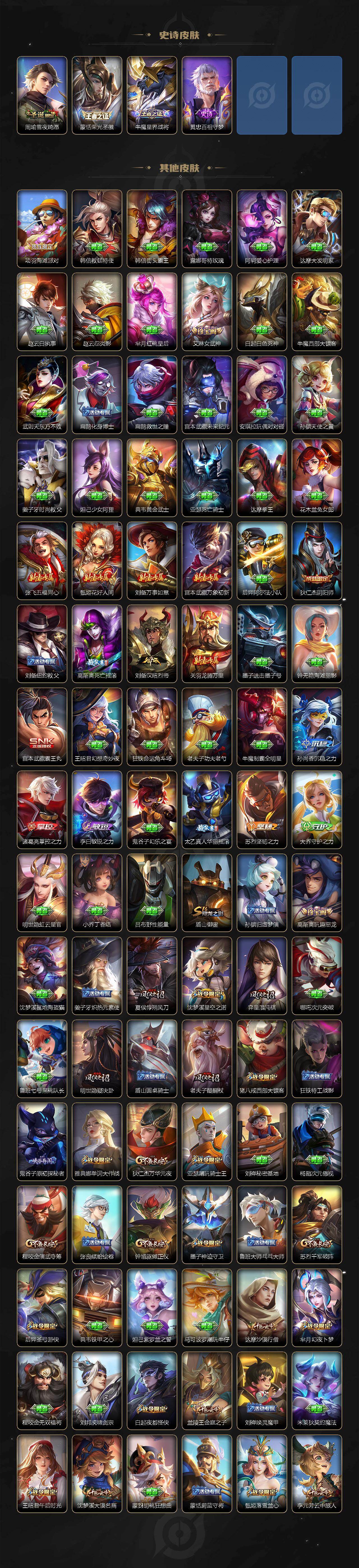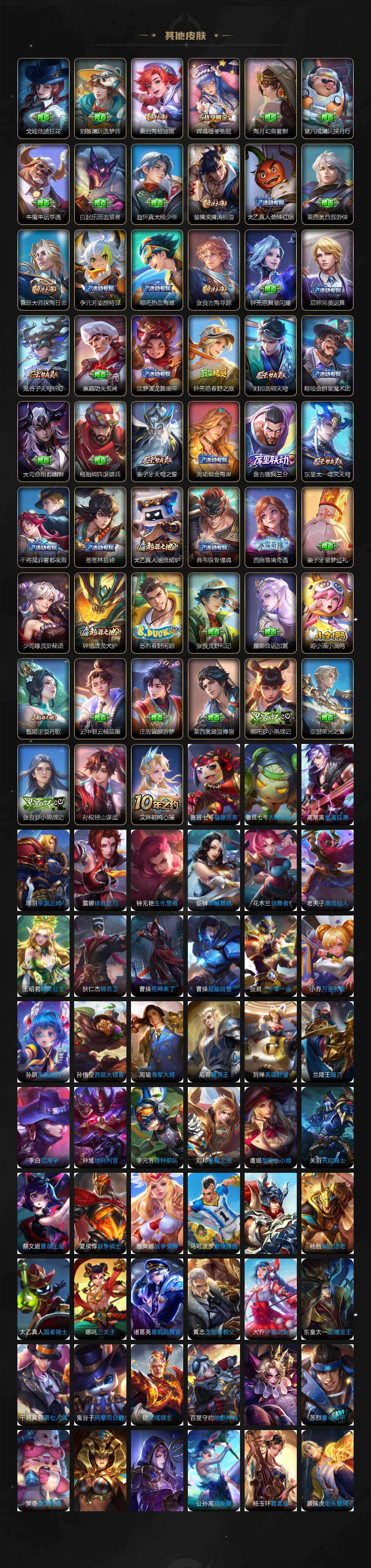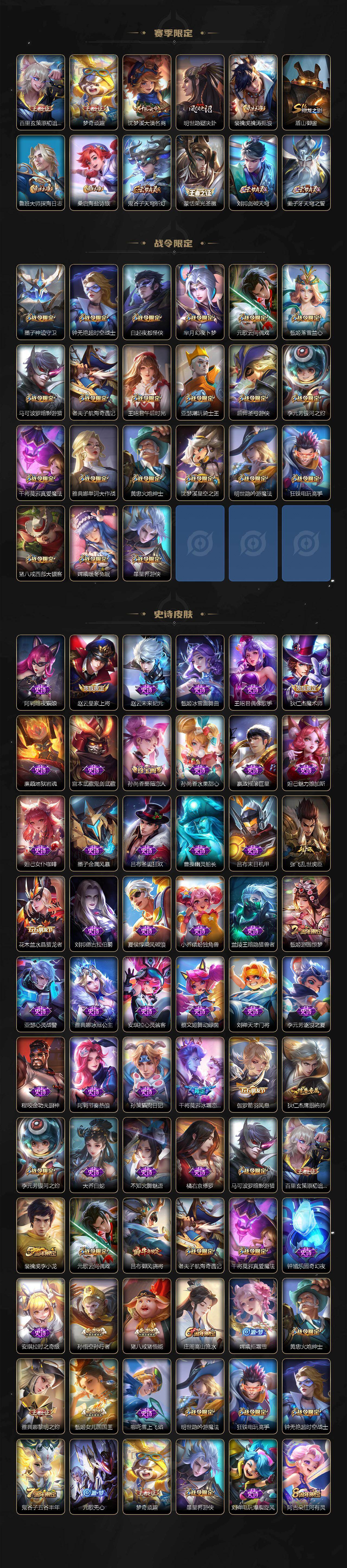 【限定皮肤】:姜子牙天穹之誓,杨戬破阵退雄兵,狄仁杰阴阳师,赵云皇家上将,墨子神迹守卫,孙尚香蔷薇恋人,庄周高山流水,高渐离死亡摇滚,高渐离玩趣恶龙,钟无艳超时空战士,白起夜都怪侠,芈月幻夜卜梦,吕布御风骁将,元歌云间偶戏,元歌无心,夏侯惇朔风刀,甄姬女儿国国王,甄姬游园惊梦,甄姬落雪兰心,马可波罗暗影游猎,狄仁杰魔术师,狄仁杰万华元夜,达摩沙漠行僧,项羽海滩派对,老夫子醍醐杖,老夫子航海奇遇记,程咬金演武夺筹,王昭君午后时光,兰陵王金庭之子,亚瑟潮玩骑士王,孙悟空孙行者,后羿圣弓游侠,李元芳银河之约,李元芳云中旅人,钟馗驱傩正仪,女娲补天,干将莫邪冰霜恋舞曲,干将莫邪真爱魔法,雅典娜单词大作战,雅典娜黎明之约,太乙真人华丽摇滚,鬼谷子原初探秘者,鬼谷子五谷丰年,黄忠火炮绅士,苏烈千军破阵,百里玄策原初追逐者,弈星混沌棋,梦奇顽趣,沈梦溪星空之诺,沈梦溪大漠名商,明世隐疑决卦,明世隐吟游魔法,裴擒虎李小龙,裴擒虎擒涛扼浪,狂铁电玩高手,盾山御銮,猪八戒西部大镖客,猪八戒猪悟能,嫦娥拒霜思,嫦娥暖冬兔眠,鲁班大师探海日志,桑启海盐诗旅,暃星界游侠,艾琳女武神,阿古朵江河有灵,张良古海寻踪,蒙恬荣光圣徽,鬼谷子天穹祈灯,沈梦溪龙舞盛年,刘邦剑破天穹,程咬金群星魔术团,周瑜熔金海岸