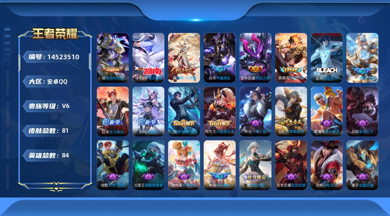 [14523510]按键5 安卓Q-81皮肤-1典藏皮肤-1珍品传说-5传说-23史诗 【荣耀典藏】:铠银白咏叹调 【珍品传说】:马可波罗怪盗基德 【传说皮肤】:后羿神树通天,澜愿照九州拓,裴擒虎祥瑞亨通,宫本武藏地狱之眼,吕布天魔缭乱 【限定皮肤】:姜子牙天穹之誓,赵云皇家上将,吕布天魔缭乱,狄仁杰魔术师,项羽海滩派对,干将莫邪胡桃夹子,刘邦剑破天穹,程咬金群星魔术团,关羽决胜骁骑,镜青焰无极,项羽苍威无极,芈月浮光幕影,周瑜熔金海岸 【赛季限定】:刘邦剑破天穹,姜子牙天穹之誓 【战令限定】:镜青焰无极,项羽苍威无极 【史诗皮肤】:赵云皇家上将,狄仁杰魔术师,宫本武藏鬼剑武藏,孙尚香水果甜心,妲己魅力维加斯,墨子金属风暴,吕布圣诞狂欢,李白千年之狐,花木兰水晶猎龙者,夏侯惇乘风破浪,兰陵王暗隐猎兽者,铠曙光守护者,蔡文姬舞动绿茵,白起星夜王子,狄仁杰鹰眼统帅,杨戬天秀启明,镜青焰无极,关羽决胜骁骑,芈月浮光幕影,阿轲化蝶舞,狂铁龙之律动,老夫子藏狐褐绒,后羿石田雨龙 【其他皮肤】:项羽海滩派对,韩信街头霸王,露娜哥特玫瑰,赵云忍炎影,白起白色死神,典韦黄金武士,亚瑟死亡骑士,达摩拳王,花木兰兔女郎,张飞五福同心,关羽龙腾万里,老夫子功夫老勺,诸葛亮掌控之力,哪吒次元突破,鲁班大师乓乓大师,干将莫邪胡桃夹子,蒙恬蔚蓝守将,刘邦剑破天穹,程咬金群星魔术团,项羽苍威无极,大司命暗都幽影,姜子牙天穹之誓,周瑜熔金海岸,东皇太一噬灭天穹,吕布逐霄战戟,苍苍林狼骑,太乙真人谧流熔炉,典韦铁骨偃魂,西施雪境奇遇,东皇太一金福满堂,达摩爆裂喵拳,明世隐景韶洛都,戈娅玫蓝誓约,刘备浪漫序章,钟馗虚灵犬护,苏烈春野闲踪,张良灵野札记,阿古朵布丁狗之约,露娜命运加冕,雅典娜潮玩士官长,姬小满小满鸭,艾琳鹤鸣心笺,李白范海辛,杨戬埃及法老,铠龙域领主,女娲尼罗河女神,明世隐占星师,李信灼热之刃,马超幸存者,澜孤猎,云缨赤焰之缨 【内测皮肤】:干将莫邪胡桃夹子 【营地ID】:1668015791