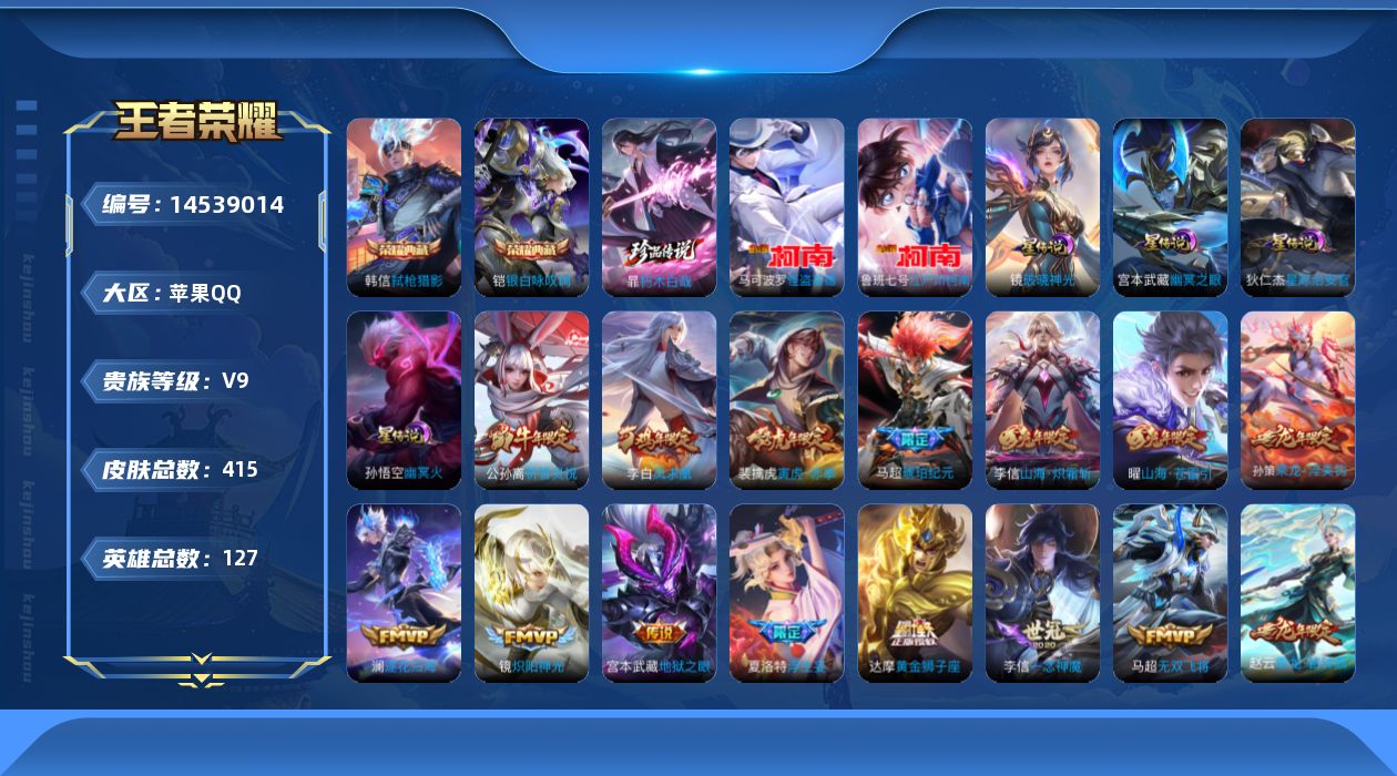 - [12113732]V6 1珍品传说 5传说 116英雄 114皮肤 可修改实名 优质装备:怪盗基德,涂山容容 传说皮:乘龙·问璇玑(孙尚香年限),云诺千山 限定皮:愿照·岁时盈(虞姬年限),鸣野蒿,枫霜尽 史诗皮:星界战将,石田雨龙,琥珀纪元伽罗,百相守梦-黄忠,织梦人,特工魅影,江河有灵,蒙恬荣光圣徽,偶像歌手,水果甜心,星夜王子,心灵骇客,暗隐猎兽者,鬼剑武藏,拒霜思,缤纷独角兽,箭羽风息,圣诞狂欢,鹰眼统帅,黎明之约