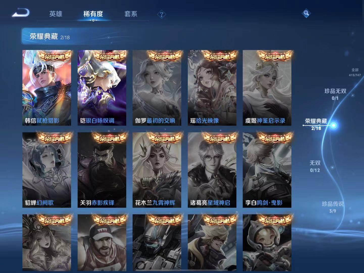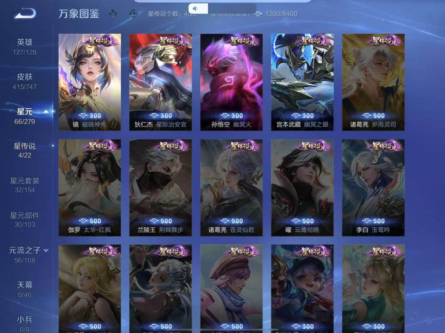 庄周蜃楼王,孙膑妖精王,扁鹊炼金王,虞姬凯尔特女王,白起狰,太乙真人饕餮,曹操烛龙,芈月重明,典韦穷奇,狂铁御狮,米莱狄御霄,牛魔御旌,盾山御銮,夏侯惇朔风刀,明世隐疑决卦,鬼谷子原初探秘者,狄仁杰万华元夜,程咬金演武夺筹,钟馗驱傩正仪,苏烈千军破阵,吕布猎兽之王,嬴政白昼王子,女娲朔望之晖,典韦蓝屏警告,钟馗神迹守卫,鲁班七号狮舞东方,沈梦溪星空之诺,李元芳银河之约,刘邦夺宝奇兵,元歌云间偶戏,弈星混沌棋,达摩沙漠行僧,兰陵王金庭之子,沈梦溪大漠名商,李元芳云中旅人,桑启海盐诗旅,裴擒虎擒涛扼浪,鲁班大师探海日志,张良古海寻踪,项羽苍威无极,镜青焰无极