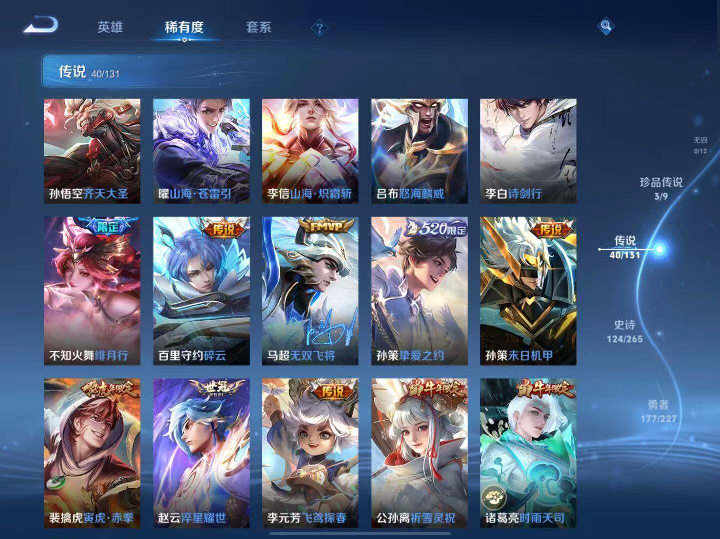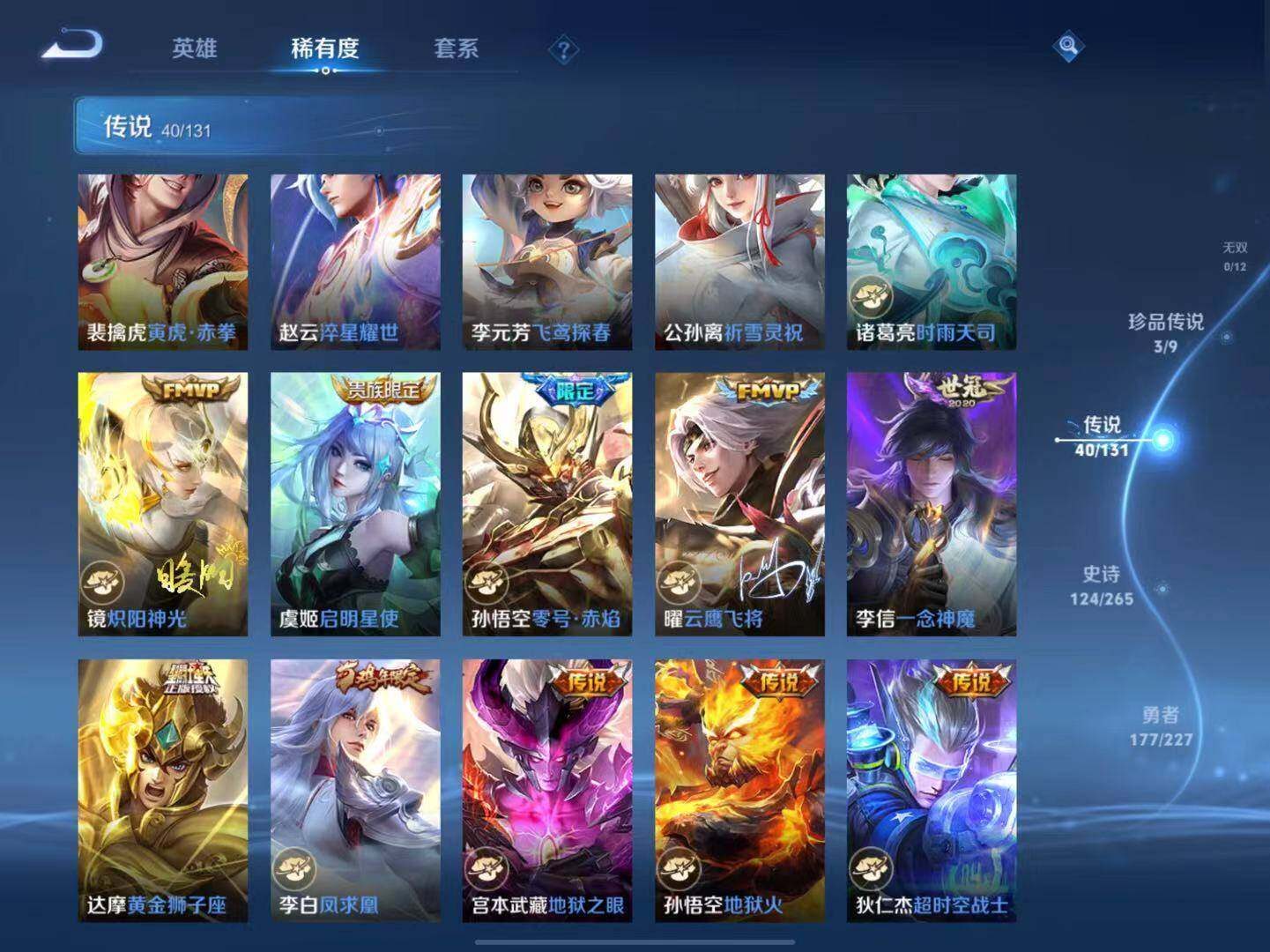 【传说皮肤】:后羿神树通天,云缨幻光神枪,桑启鸣野蒿,吕布曦玄引,典韦战鼓燎原,孙策乘龙淬吴钩,赵云乘龙铭钟鼎,马超琥珀纪元,澜逐花归海,东皇太一灼幽烈阳,诸葛亮鹤羽星尊,澜电玩雷克斯,公孙离记忆之芯,夏洛特浮生妄,花木兰燃星之曲,孙悟空齐天大圣,曜山海苍雷引,李信山海炽霜斩,吕布怒海麟威,李白诗剑行,不知火舞绯月行,百里守约碎云,马超无双飞将,孙策挚爱之约,孙策末日机甲,裴擒虎寅虎赤拳,赵云淬星耀世,李元芳飞鸢探春,公孙离祈雪灵祝,诸葛亮时雨天司,镜炽阳神光,虞姬启明星使,孙悟空零号赤焰,曜云鹰飞将,李信一念神魔,达摩黄金狮子座,李白凤求凰,宫本武藏地狱之眼,孙悟空地狱火,狄仁杰超时空战士