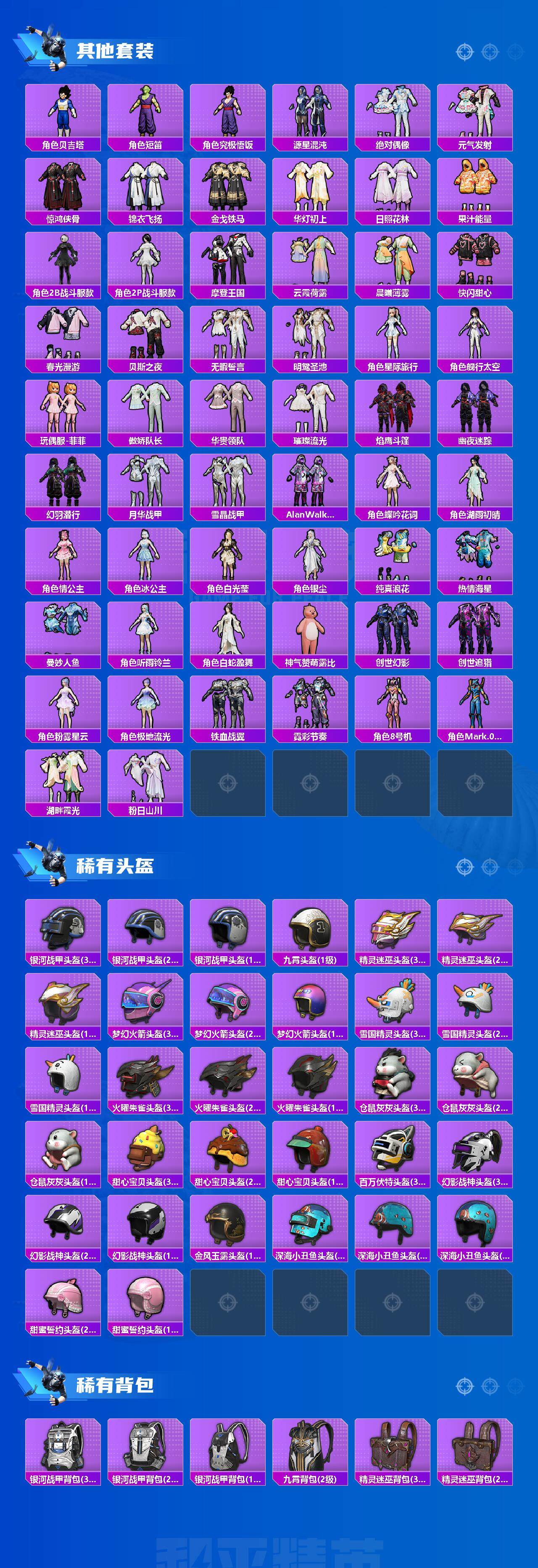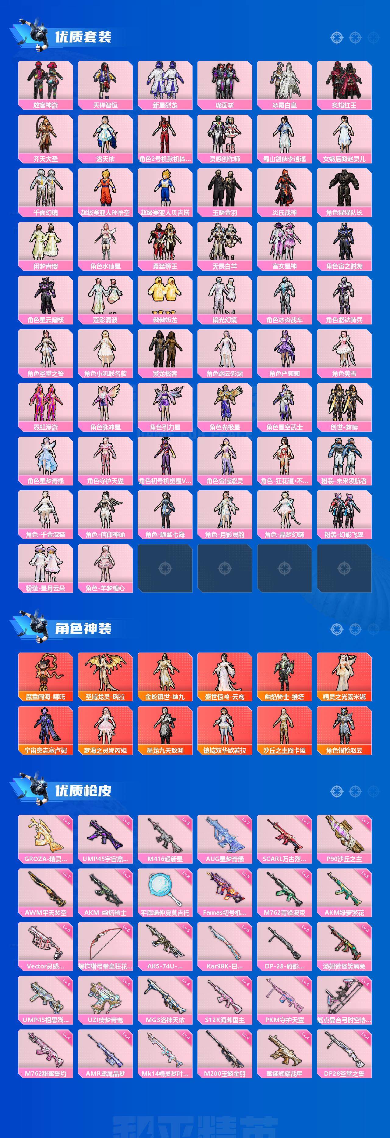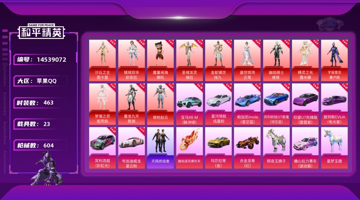 [14539072]苹果 手Q-12神装-74粉装-63特效枪-23载具-29粉色飞行器-348850热力值-18王牌印记-463套装-604枪皮 【红色载具】:路特斯EVIJA(电光紫)(二级),宾利添越(彩虹光)(二级),宾利欧陆GT敞篷(深空蓝)(四级),布加迪威龙(星云粉)(一级),仰望U7(雷霆紫)(二级),星河领航(炫晶粉)(四级),帕加尼imola(星空蓝)(四级),宝马X6 M(脉冲绿)(五级) 【红色神装等级】:魔童闹海-哪吒(一级),圣域龙灵-瑞拉(一级),金蛇镇世-烛九(一级),盛世惊鸿-云鸾(一级),幽焰骑士-维塔(一级),精灵之光-露米娜(一级),宇宙意志-塞卢姆(一级),梦海之灵-妮芮妲(一级),墨龙九天-敖渊(一级),镜域双华-欧若拉(二级),沙丘之主-图卡盟(七级),角色-银枪赵云(一级) 【红色角色神装】:魔童闹海-哪吒,圣域龙灵-瑞拉,金蛇镇世-烛九,盛世惊鸿-云鸾,幽焰骑士-维塔,精灵之光-露米娜,宇宙意志-塞卢姆,梦海之灵-妮芮妲,墨龙九天-敖渊,镜域双华-欧若拉,沙丘之主-图卡盟,角色-银枪赵云 【热门品类】:粉装-怪诞乔克,粉装-雪国幻梦,粉装-梦幻火箭,粉装-缤纷油彩,粉装-繁龙极客,绝对防御上衣,套装-浪漫天命,套装-赤蝎幽灵,套装-火箭少女101,套装-都市猎人,套装-冥河战士,套装-派对舞王,套装-深海小丑鱼,套装-小丑鱼,套装-胖达团团,套装-天网终结者,套装-沙漠守护者,套装-忍者信条,套装-星河浪客,套装-AG战队服,角色-2B战斗服款,角色-2P战斗服款,角色-忠猛周仓,角色-忠真马岱,角色-忠义严颜,套装-六号树人,套装-龟仙人,套装-暗影哥特,套装-浪漫波比,套装-萌熊伴侣,角色-8号机,角色-Mark.06,M416-星际漫游,大砍刀-青龙偃月刀,撬棍-龙胆亮银枪,套装-红熊茄茄 【粉色载具】:路特斯EVIJA(电光紫),玛莎拉蒂Ghibli(金),宾利欧陆GT敞篷(深空蓝),宾利添越(彩虹光),仰望U7(雷霆紫),宝马X6 M(脉冲绿),布加迪威龙(星云粉),帕加尼imola(星空蓝),星河领航(炫晶粉),合金龙骨(红),糖心拉力赛车(波动紫),疾风龙骑,幽焰风驰摩托车,盛世惊鸿摩托车,踏焰逐风摩托车,鬼马风驰,空客H135-蔚蓝之翼,僚机-圣域龙宝,快艇-塞莎KL27(霓虹粉),赤兔,照夜玉狮子,星梦玉骢,护世瑞兽