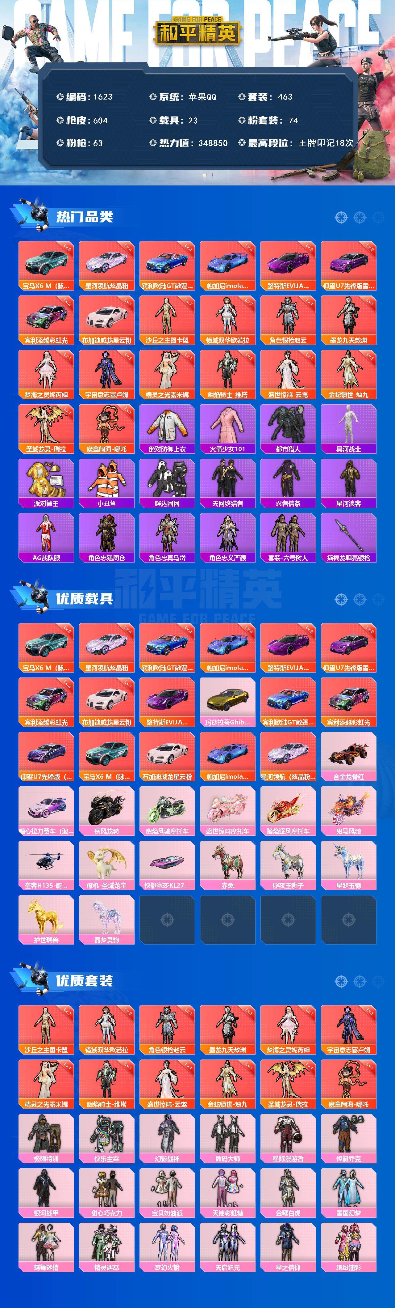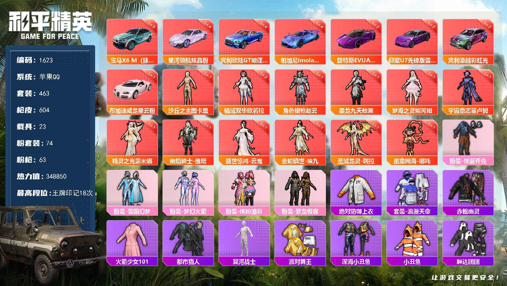 [14539072]苹果 手Q-12神装-74粉装-63特效枪-23载具-29粉色飞行器-348850热力值-18王牌印记-463套装-604枪皮