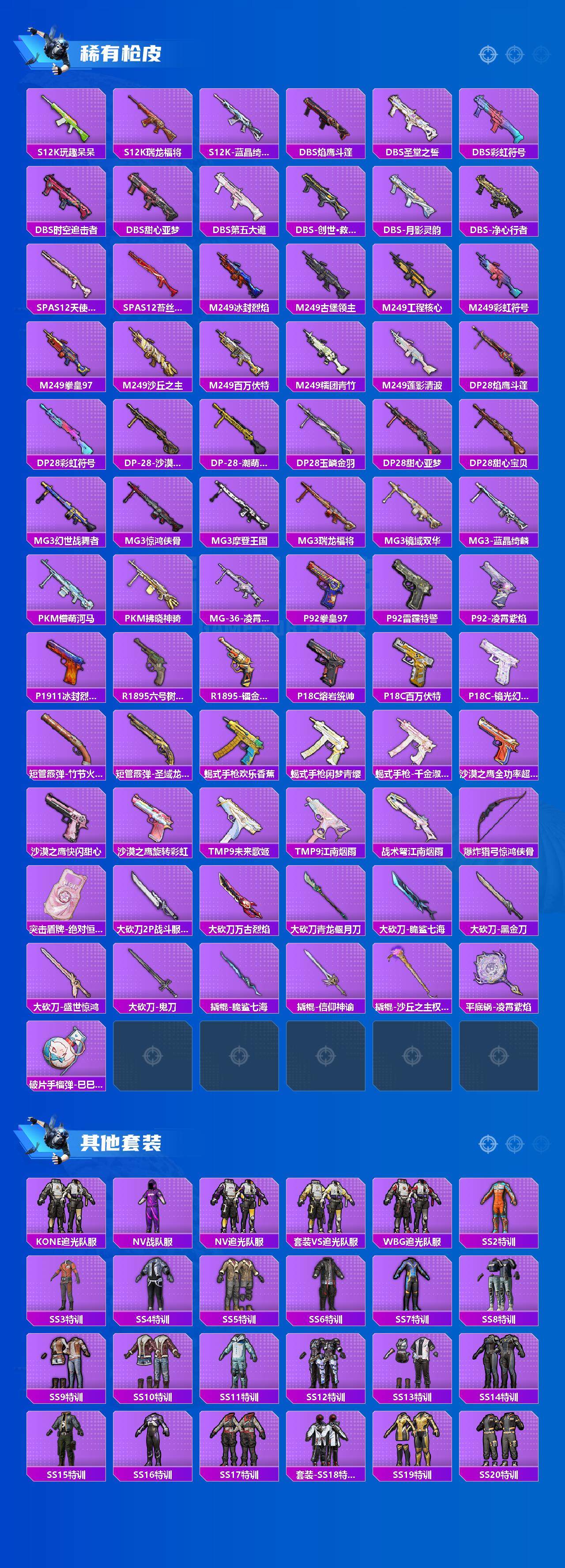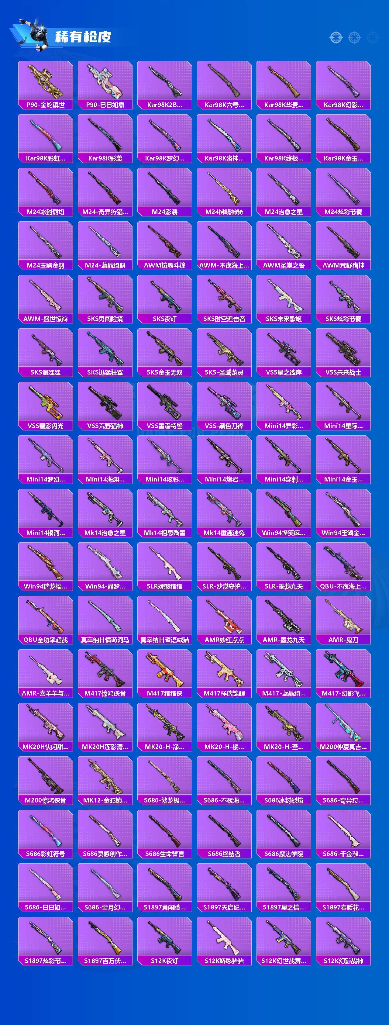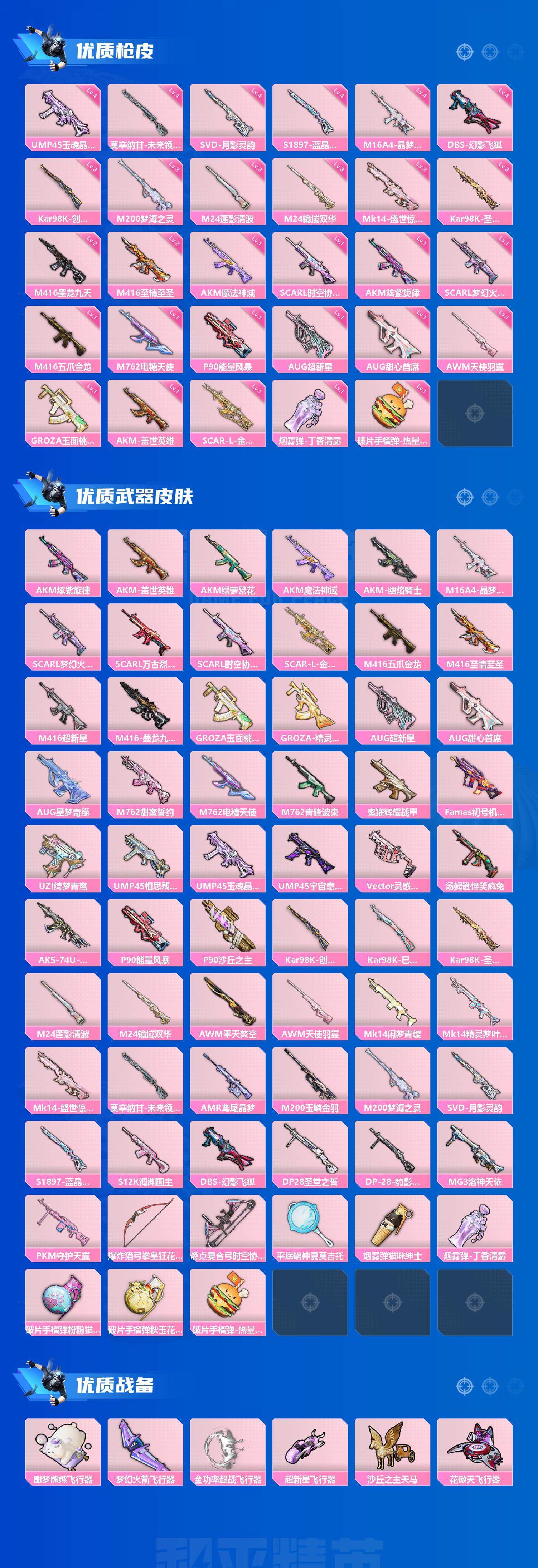 AKM-炫紫旋律,AKM-盖世英雄,AKM-绿萝繁花,AKM-魔法神域,AKM-幽焰骑士,M16A4-晶梦幻蝶,SCAR-L-梦幻火箭,SCAR-L-时空协奏,SCAR-L-金蛇镇世,M416-五爪金龙,M416-至情至圣,M416-超新星,M416-墨龙九天,GROZA-玉面桃花,GROZA-精灵之光,AUG-超新星,AUG-甜心首席,AUG-星梦奇缘,M762-甜蜜誓约,M762-电糖天使,M762-青锋波束,蜜獾-辉耀战甲,Famas-觉醒初号机,UZI-绮梦青鸾,UMP45-相思残雪,UMP45-玉魂晶魄,UMP45-宇宙意志,Vector-灵感创作师,汤姆逊-怪笑疯兔,AKS-74U-信仰神谕,P90-能量风暴,P90-沙丘之主,Kar98K-创世·救赎,Kar98K-巳巳如意,Kar98K-圣域龙灵,M24-莲影清波,M24-镜域双华,AWM-平天焚空,AWM-天使羽翼,Mk14-闲梦青缨,Mk14-精灵梦叶罗丽,Mk14-盛世惊鸿,莫辛纳甘-未来领航者,AMR-鸢尾晶梦,M200-玉鳞金羽,M200-梦海之灵,SVD-月影灵韵,S12K-海渊国主,DP-28-圣堂之誓,MG3-洛神天依,PKM-守护天翼,爆炸猎弓-拳皇·狂花道,平底锅-仲夏莫吉托,烟雾弹-猫咪绅士,烟雾弹-丁香清露,破片手榴弹-粉粉猫爪,破片手榴弹-秋玉花灯,破片手榴弹-热量炸弹