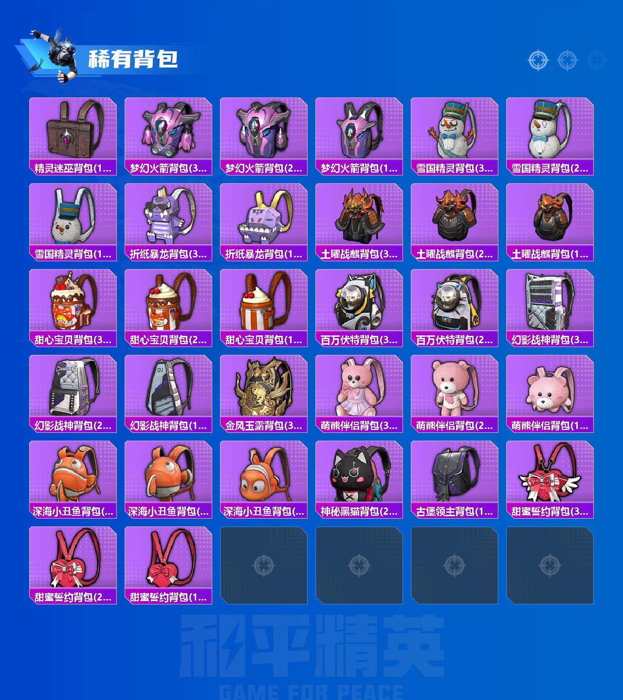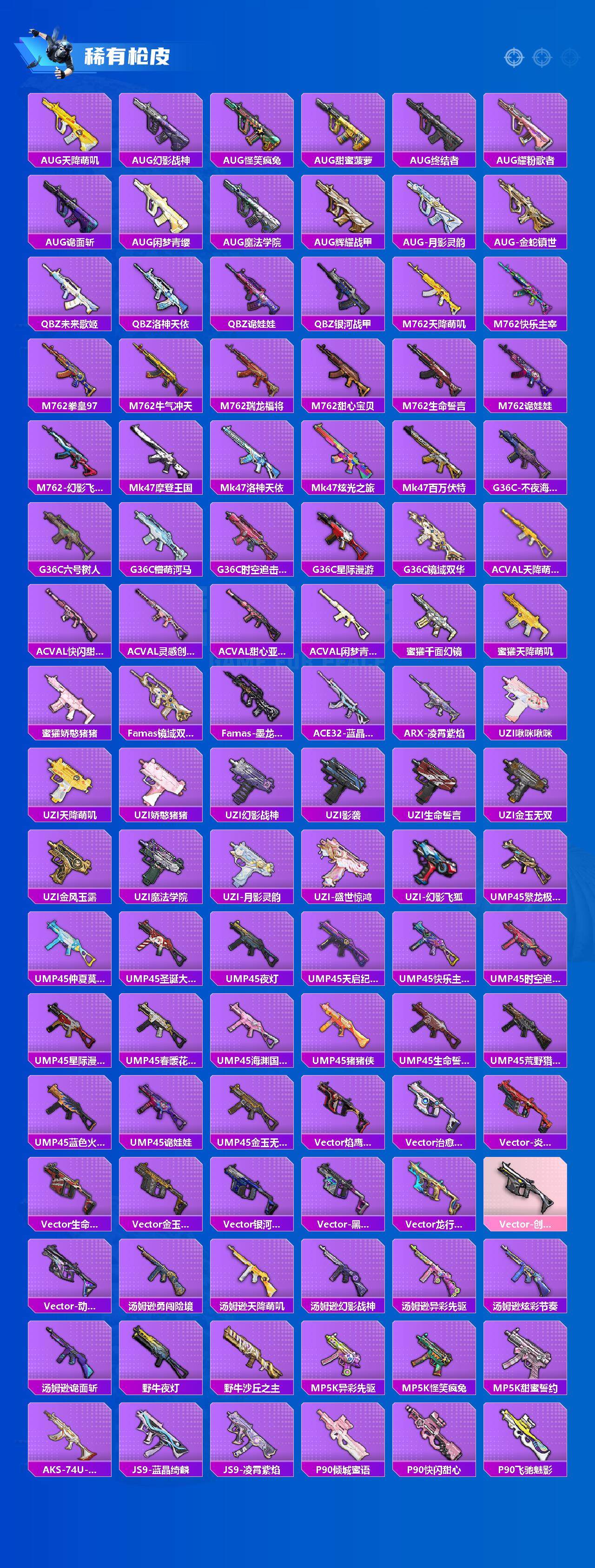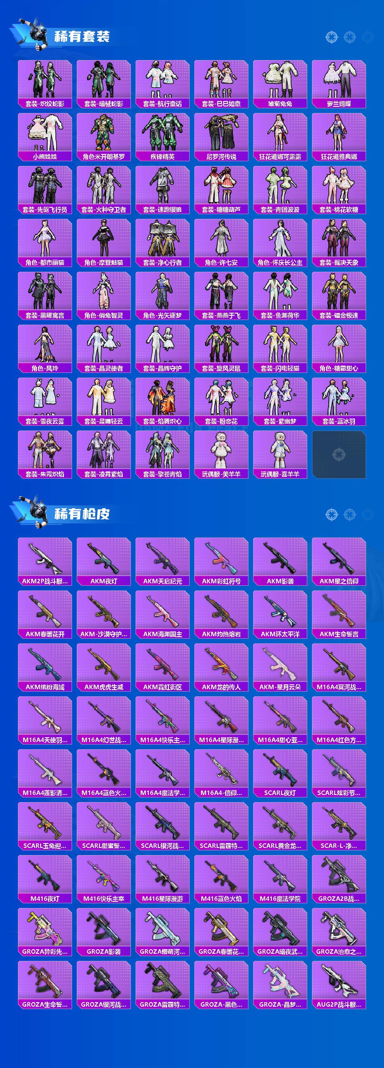 AKM-炫紫旋律,AKM-盖世英雄,AKM-绿萝繁花,AKM-魔法神域,AKM-幽焰骑士,M16A4-晶梦幻蝶,SCAR-L-梦幻火箭,SCAR-L-时空协奏,SCAR-L-金蛇镇世,M416-五爪金龙,M416-至情至圣,M416-超新星,M416-墨龙九天,GROZA-玉面桃花,GROZA-精灵之光,AUG-超新星,AUG-甜心首席,AUG-星梦奇缘,M762-甜蜜誓约,M762-电糖天使,M762-青锋波束,蜜獾-辉耀战甲,Famas-觉醒初号机,UZI-绮梦青鸾,UMP45-相思残雪,UMP45-玉魂晶魄,UMP45-宇宙意志,Vector-灵感创作师,汤姆逊-怪笑疯兔,AKS-74U-信仰神谕,P90-能量风暴,P90-沙丘之主,Kar98K-创世·救赎,Kar98K-巳巳如意,Kar98K-圣域龙灵,M24-莲影清波,M24-镜域双华,AWM-平天焚空,AWM-天使羽翼,Mk14-闲梦青缨,Mk14-精灵梦叶罗丽,Mk14-盛世惊鸿,莫辛纳甘-未来领航者,AMR-鸢尾晶梦,M200-玉鳞金羽,M200-梦海之灵,SVD-月影灵韵,S12K-海渊国主,DP-28-圣堂之誓,MG3-洛神天依,PKM-守护天翼,爆炸猎弓-拳皇·狂花道,平底锅-仲夏莫吉托,烟雾弹-猫咪绅士,烟雾弹-丁香清露,破片手榴弹-粉粉猫爪,破片手榴弹-秋玉花灯,破片手榴弹-热量炸弹