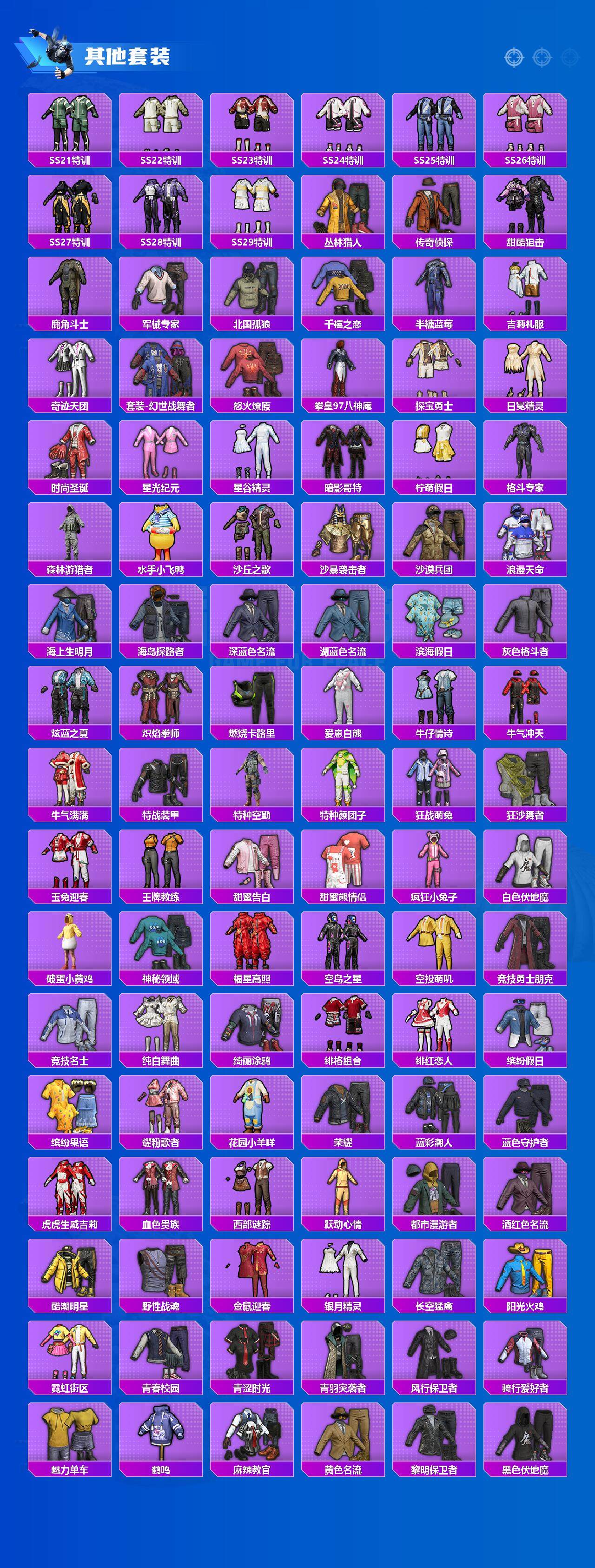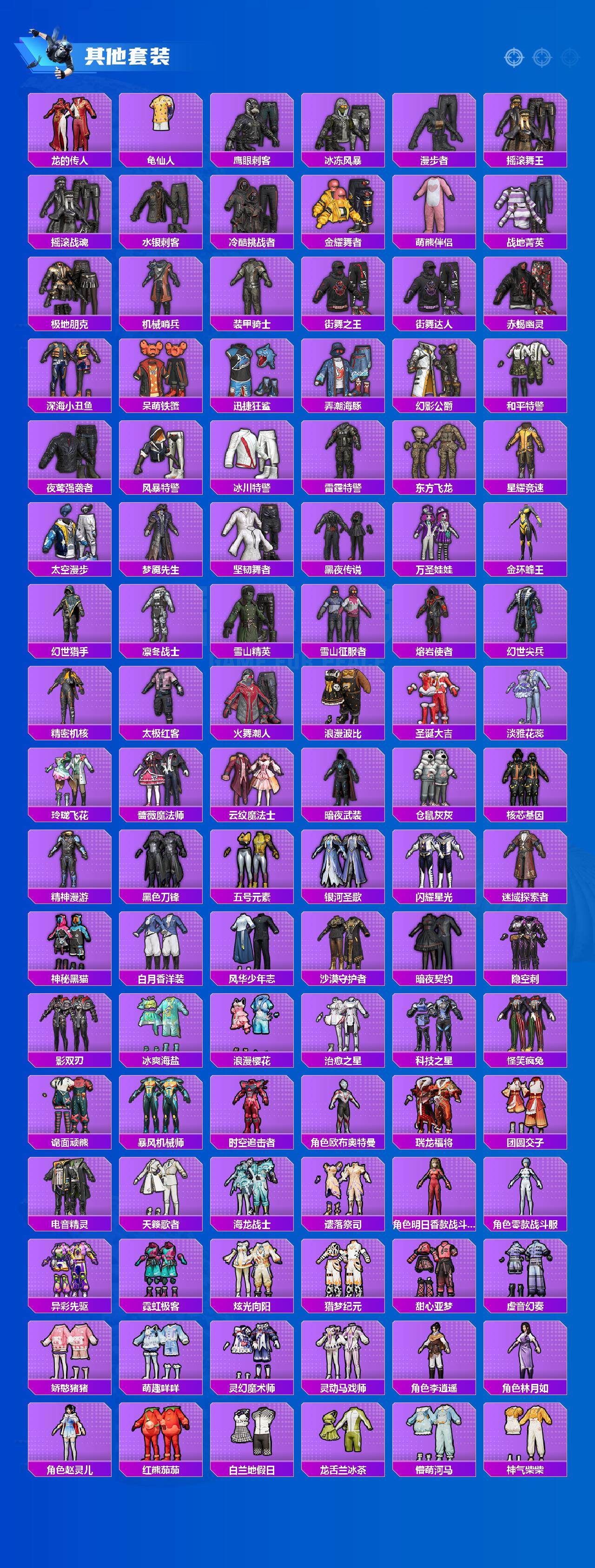 套装-浪漫天命,忍者信条套装,套装-星河浪客,套装-六号树人,套装-龟仙人,套装-暗影哥特,角色-8号机,角色-Mark.06,套装-KONE追光队服,套装-NV追光队服,套装-VS追光队服,套装-WBG追光队服,套装-狂沙舞者,套装-破蛋小黄鸡,套装-漫步者,套装-水银刺客,套装-弄潮海豚,套装-雪山精英,套装-黑色刀锋,白月香洋装套装,风华少年志套装,套装-暗夜契约,套装-影双刃,套装-冰爽海盐,套装-怪笑疯兔,套装-诡面顽熊,套装-瑞龙福将,套装-团圆交子