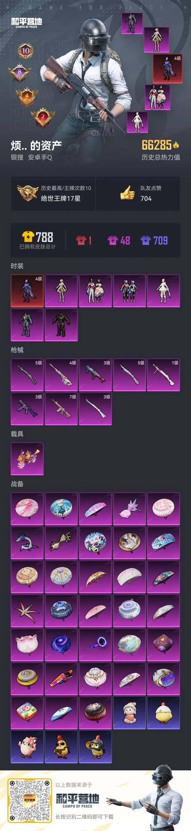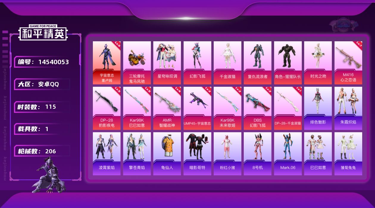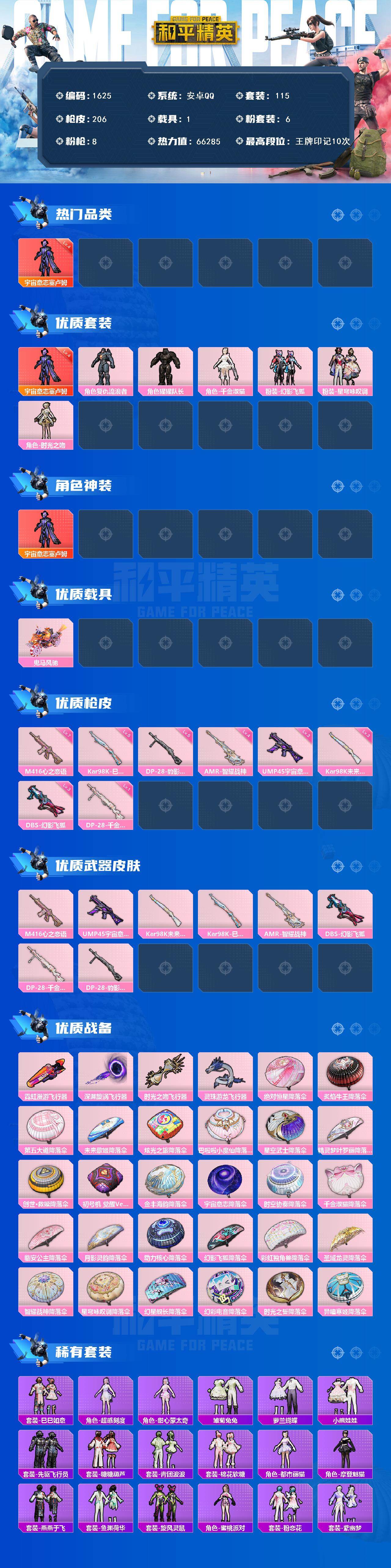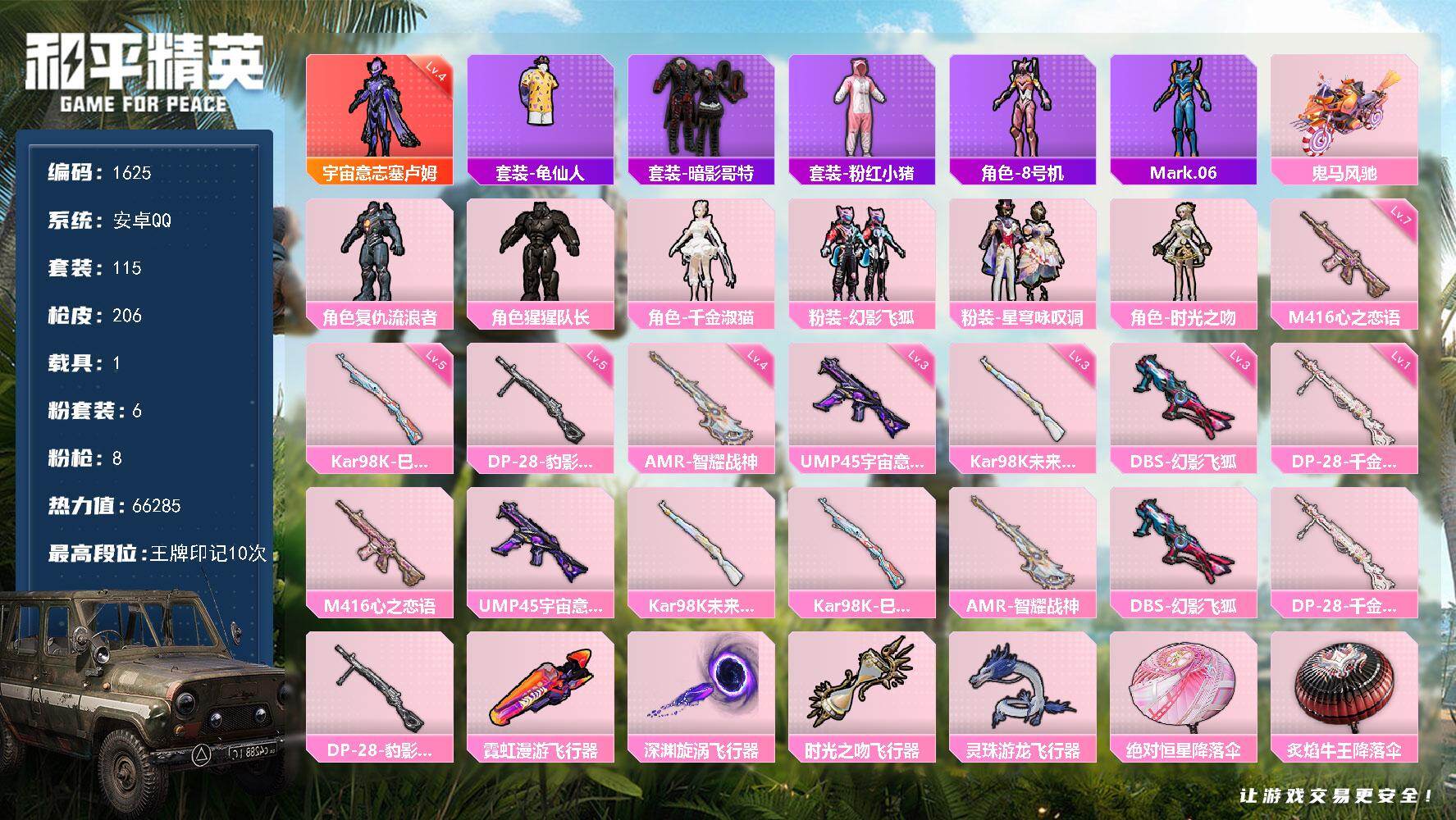 [14540053]安卓 手Q-1神装-6粉装-8特效枪-1载具-6粉色飞行器-66285热力值-10王牌印记-115套装-206枪皮