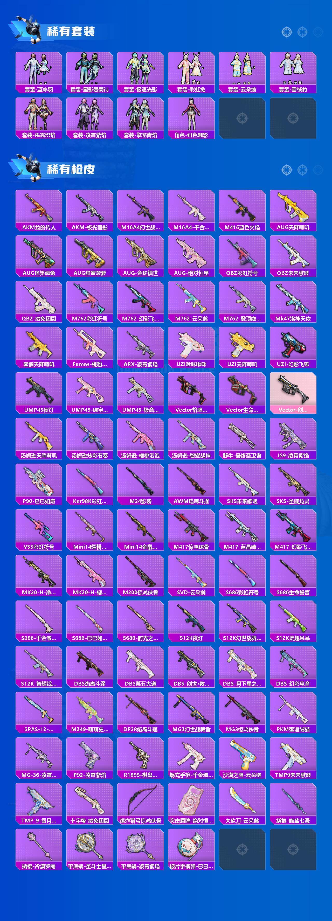 【稀有枪皮】:AUG-冰晶雪宝,AKM-龙的传人,AKM-极光猎影,M16A4-幻世战舞者,M16A4-千金