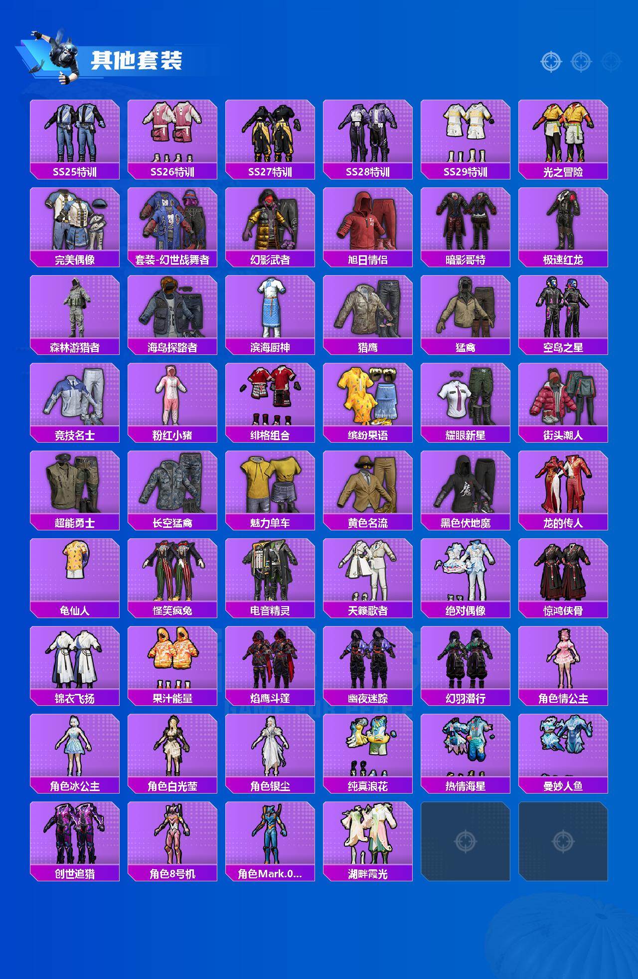 【稀有套装】:套装-龟仙人,套装-巳巳如意,角色-超感刻度,角色-甜心蒙太奇,套装-雏菊兔兔,套装-萝兰蝴蝶,套装-小熊娃娃,套装-先驱飞行员,套装-糖糖葫芦,套装-青团波波,套装-棉花软糖,角色-都市丽猫,角色-摩登魅猫,套装-燕燕于飞,套装-鱼渊荷华,套装-旋风灵鼠,角色-蜜桃派对,套装-粉恋花,套装-紫幽梦,套装-蓝冰羽,套装-星影赞美诗,套装-极速光影,套装-彩虹兔,套装-云朵鹅,套装-雪绒豹,套装-朱霞炽焰,套装-凌霄紫焰,套装-擎苍青焰,角色-绯色魅影,套装-炫彩糖果