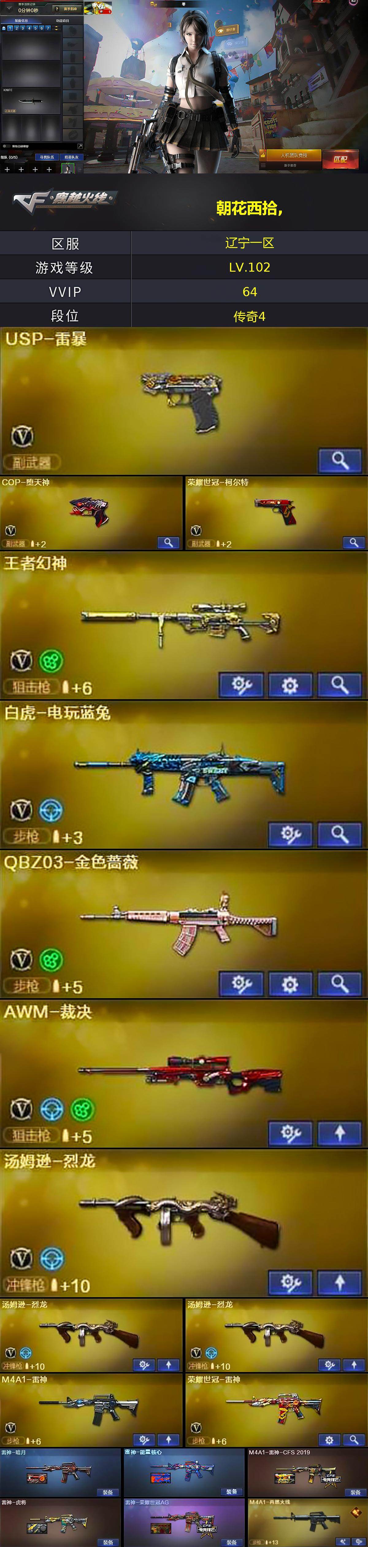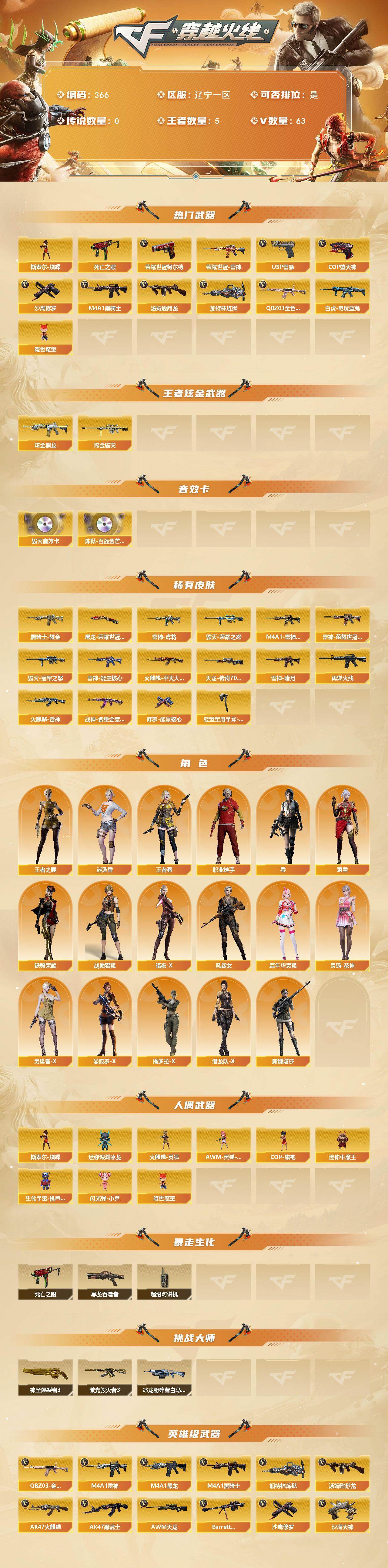[14539379]辽宁一区-63V-5王者-2炫金 【热门武器】:QBZ03-金色蔷薇,死亡之眼,荣耀世冠-雷神,白虎-电玩蓝兔,荣耀世冠-柯尔特,M4A1-黑骑士,汤姆逊-烈龙*3,加特林-炼狱,斯泰尔-蝴蝶,降世魔童,USP-雷暴,COP-堕天神,沙鹰-修罗*5 【王者炫金武器】:炫金黑龙,炫金毁灭 【音效卡】:Barrett-毁灭音效卡,炼狱-百战金芒-庆典舞曲音效卡 【皮肤】:雷神-暗月,雷神-能量核心,M4A1-雷神-CFS 2019,雷神-虎将,雷神-荣耀世冠AG,M4A1-再燃火线,火麒麟-雷神,火麒麟-平天大圣,毁灭-荣耀之怒,毁灭-冠军之怒,黑骑士耀金皮肤,战神-紫绶金章皮肤,AWM-天龙-传奇70KG,修罗-能量核心,屠龙-荣耀世冠AG,轻型军用手斧-再燃火线 【角色】:零,迷迭香,战地猎狐,王者之瞳,王者春,暗夜-X,风暴女,嘉年华灵狐,灵狐-花神,灵狐者-X,曼陀罗-X,潘多拉-X,潜龙队-X,蜀雪,铁骑荣耀,新娜塔莎,职业选手 【人偶武器】:火麒麟-灵狐,斯泰尔-蝴蝶,AWM-灵狐-15周年嘉年华,COP-旗袍,迷你深渊冰龙*5,迷你牛魔王,生化手雷-机甲核心*2,闪光弹-小乔,降世魔童 【暴走生化】:黑龙吞噬者,死亡之眼,超级对讲机 【挑战大师】:神圣爆裂者III*2,冰龙粉碎者-白马银枪,激光毁灭者III 【英雄级武器】:AK47-火麒麟,M4A1-黑龙,M4A1-雷神,M4A1-黑骑士,AK47-黑武士,M4A1-武圣,AK47-机械迷城,无影-神兵利器,QBZ03-金色蔷薇,AK47-B-战神,白虎-电玩蓝兔,荣耀世冠-雷神,AWM-天龙,Barrett-毁灭*3,AWM-裁决,王者幻神-觉醒版,加特林-炼狱,炼狱-百战金芒,炼狱-悦蓝-觉醒版,汤姆逊-烈龙*3,沙鹰-修罗*5,沙鹰-天神,USP-雷暴,COP-堕天神,荣耀世冠-柯尔特,王者之魂-觉醒版,屠龙*4,龙啸,擎天*2,斩神刀-雷暴,麒麟刺-百战金芒,高爆手雷-雷暴*4,高爆手雷-夜魔,闪光弹-雷暴*4,闪光弹-夜魔,闪光弹-竞技荣光,烟雾弹-雷暴*4,烟雾弹-夜魔,M4A1-赤狱骑士 【道具】:AG战队炫彩背包,BS战队炫彩背包,Q9战队炫彩背包,亚洲杯纪念炫彩背包,炫彩背包,百战金芒炫彩背包,超级背包*2,绿色巨人,灵魂忍者*2,迷雾幽灵*2,夺命之镰,防化服*2,金色流光-枪王排位