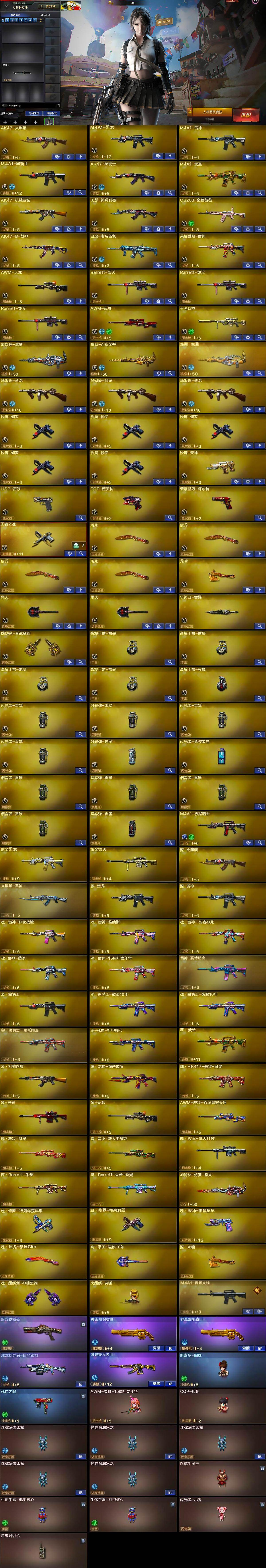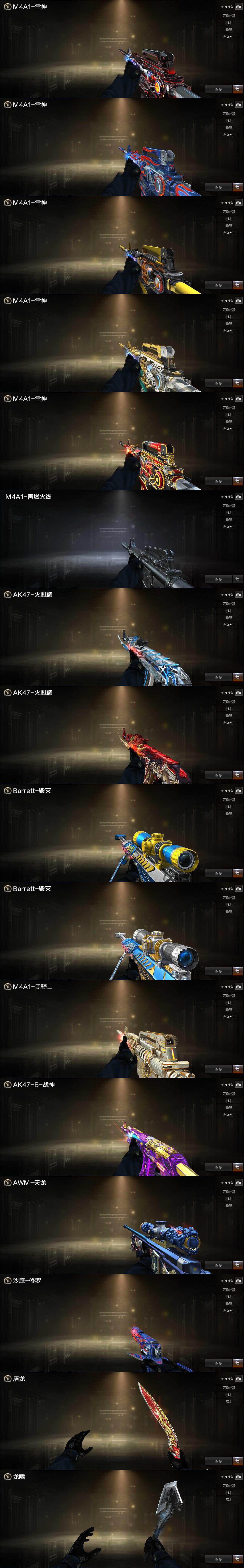【英雄级武器】:AK47-火麒麟,M4A1-黑龙,M4A1-雷神,M4A1-黑骑士,AK47-黑武士,M4A1-武圣,AK47-机械迷城,无影-神兵利器,QBZ03-金色蔷薇,AK47-B-战神,白虎-电玩蓝兔,荣耀世冠-雷神,AWM-天龙,Barrett-毁灭*3,AWM-裁决,王者幻神-觉醒版,加特林-炼狱,炼狱-百战金芒,炼狱-悦蓝-觉醒版,汤姆逊-烈龙*3,沙鹰-修罗*5,沙鹰-天神,USP-雷暴,COP-堕天神,荣耀世冠-柯尔特,王者之魂-觉醒版,屠龙*4,龙啸,擎天*2,斩神刀-雷暴,麒麟刺-百战金芒,高爆手雷-雷暴*4,高爆手雷-夜魔,闪光弹-雷暴*4,闪光弹-夜魔,闪光弹-竞技荣光,烟雾弹-雷暴*4,烟雾弹-夜魔,M4A1-赤狱骑士