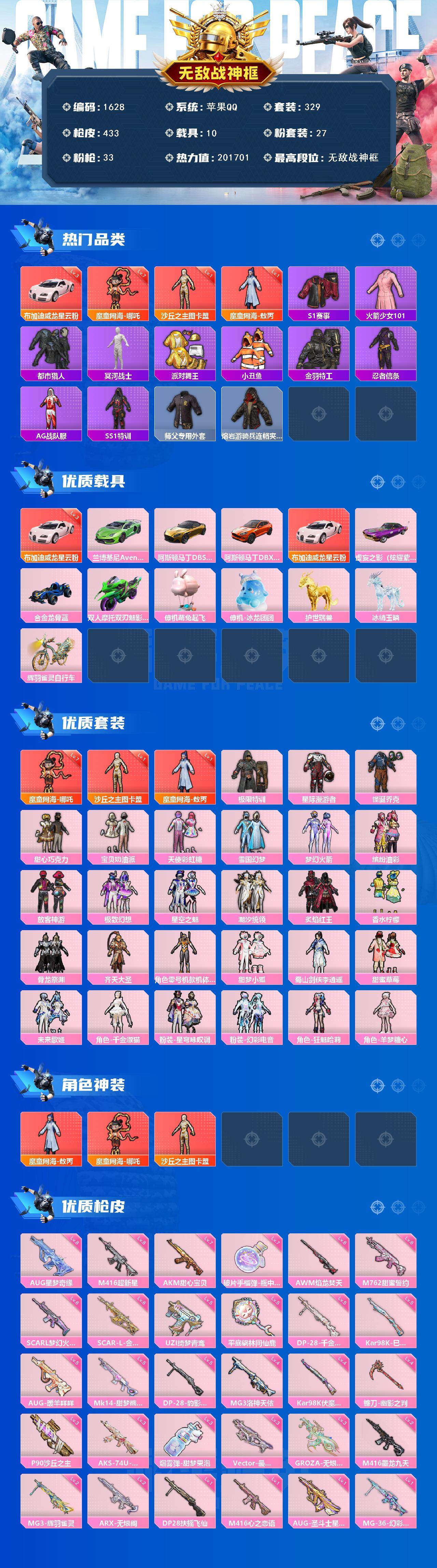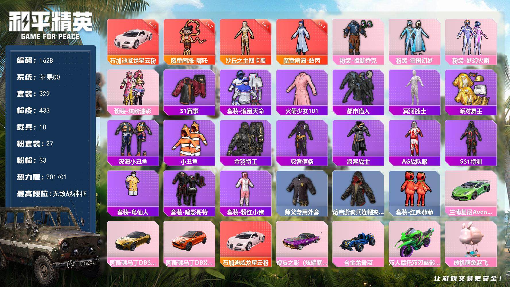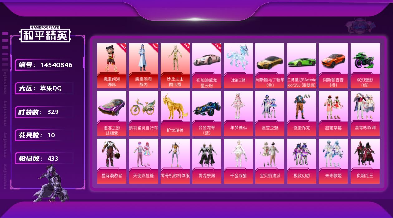 [14540846]苹果 手Q-无敌战神框-3神装-27粉装-33特效枪-10载具-16粉色飞行器-201701热力值-22王牌印记-329套装-433枪皮