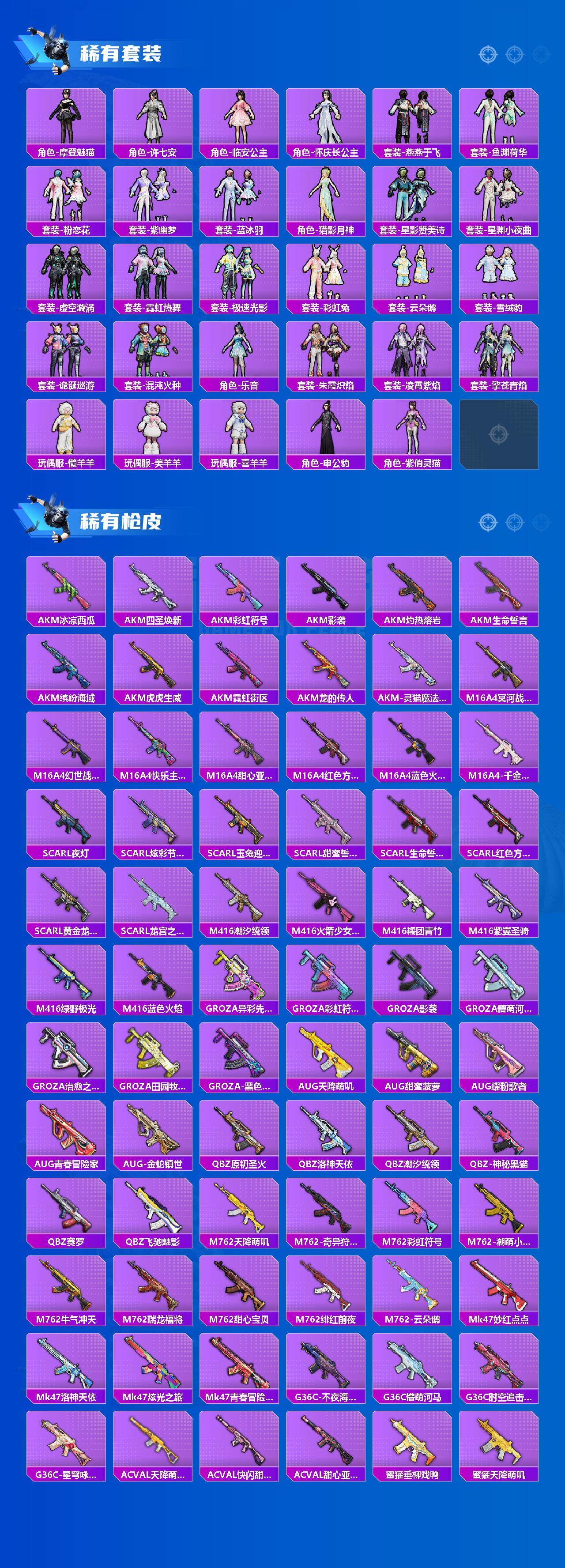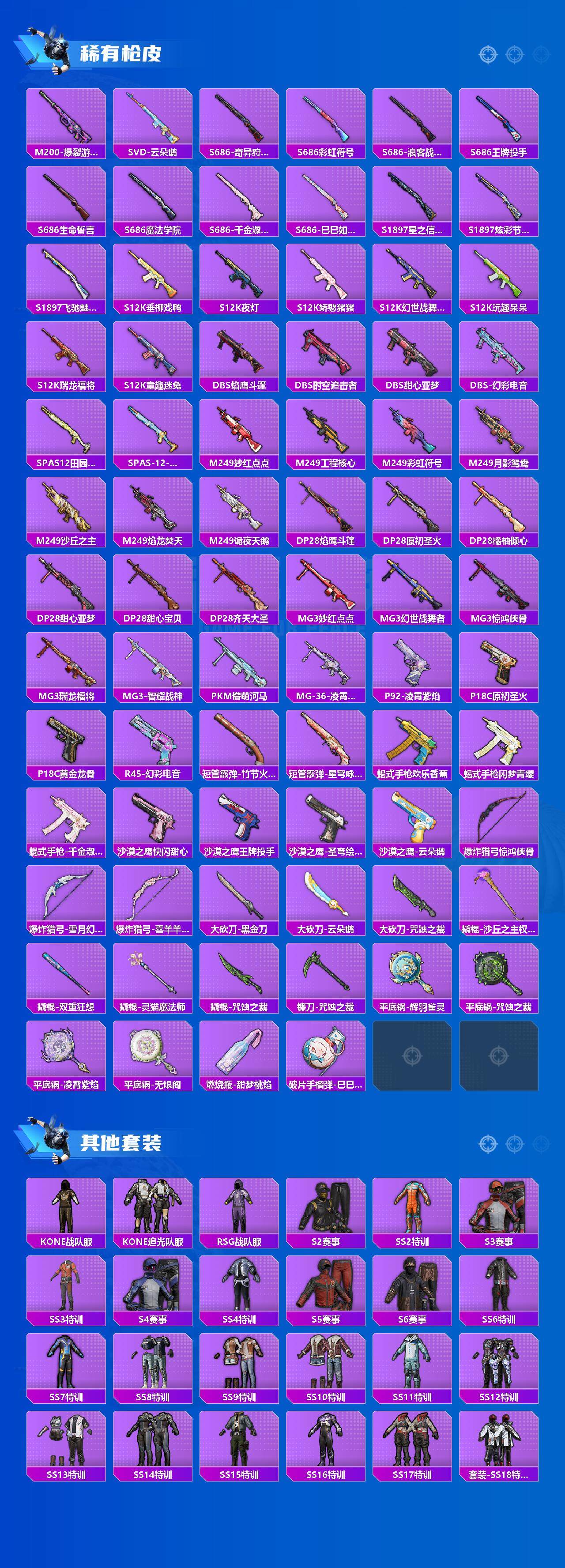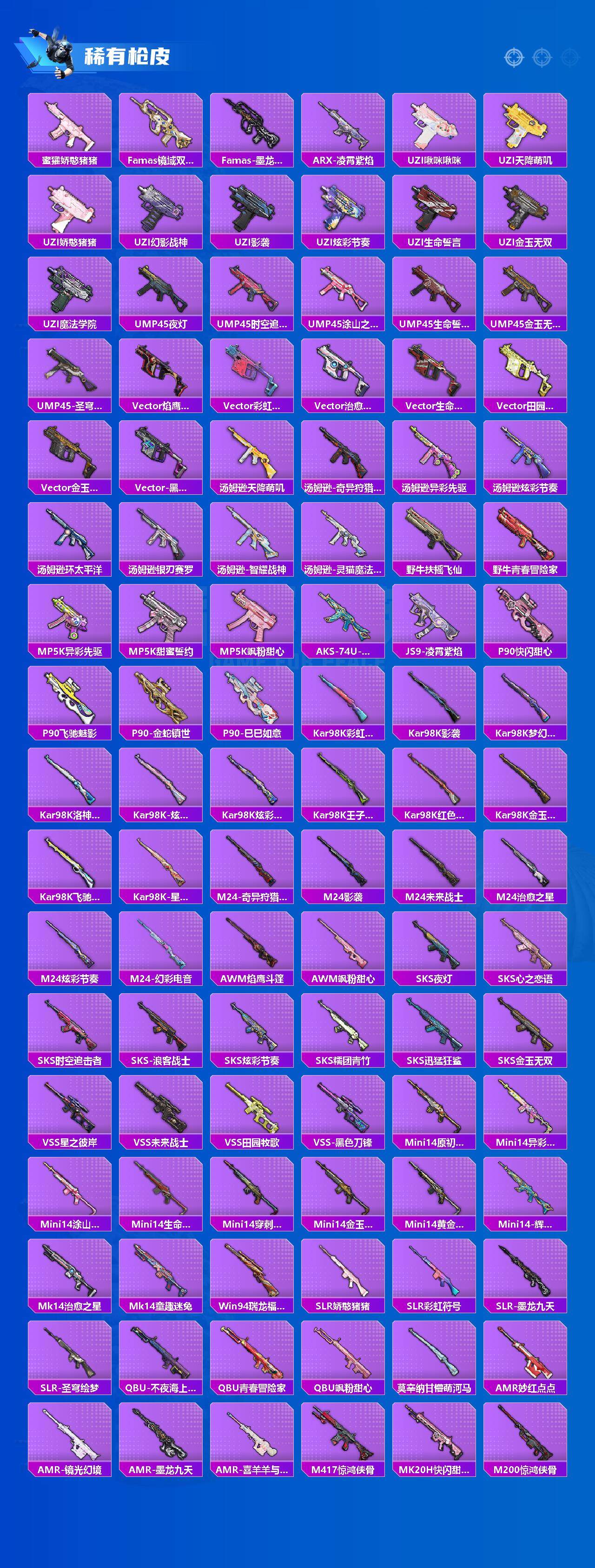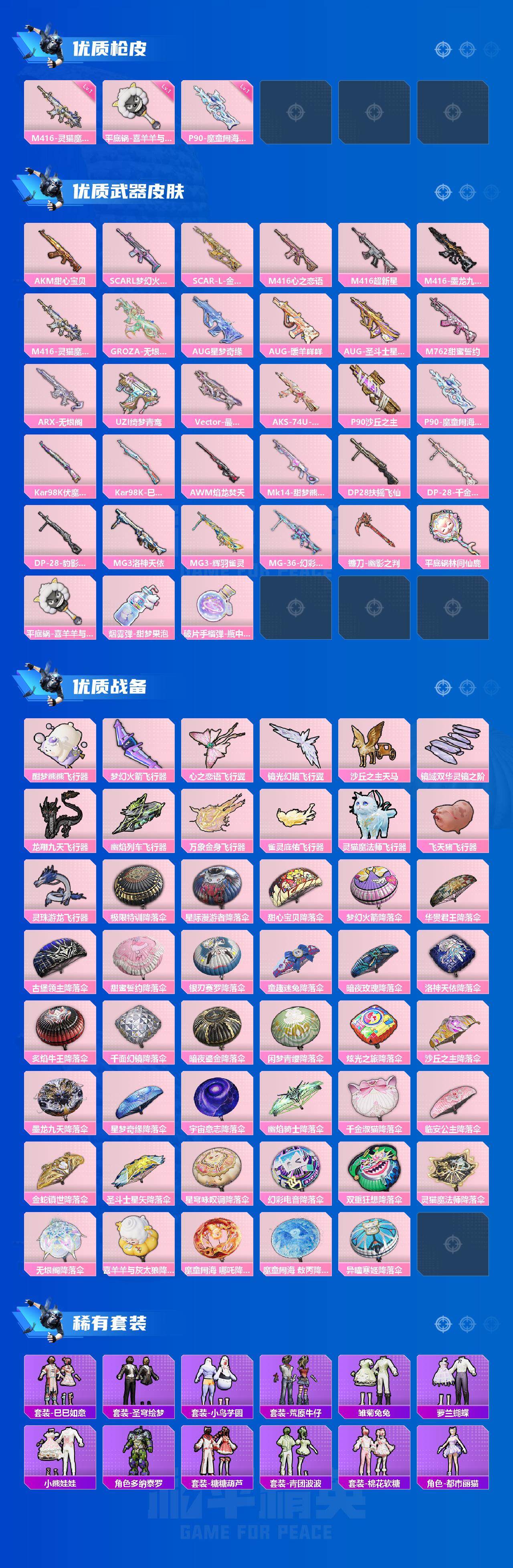 AKM-甜心宝贝,SCAR-L-梦幻火箭,SCAR-L-金蛇镇世,M416-心之恋语,M416-超新星,M416-墨龙九天,AUG-星梦奇缘,AUG-暖羊咩咩,M762-甜蜜誓约,UZI-绮梦青鸾,P90-沙丘之主,Kar98K-伏魔团,Kar98K-巳巳如意,AWM-焰龙焚天,DP-28-扶摇飞仙,DP-28-千金淑猫,MG3-洛神天依,平底锅-林间仙鹿