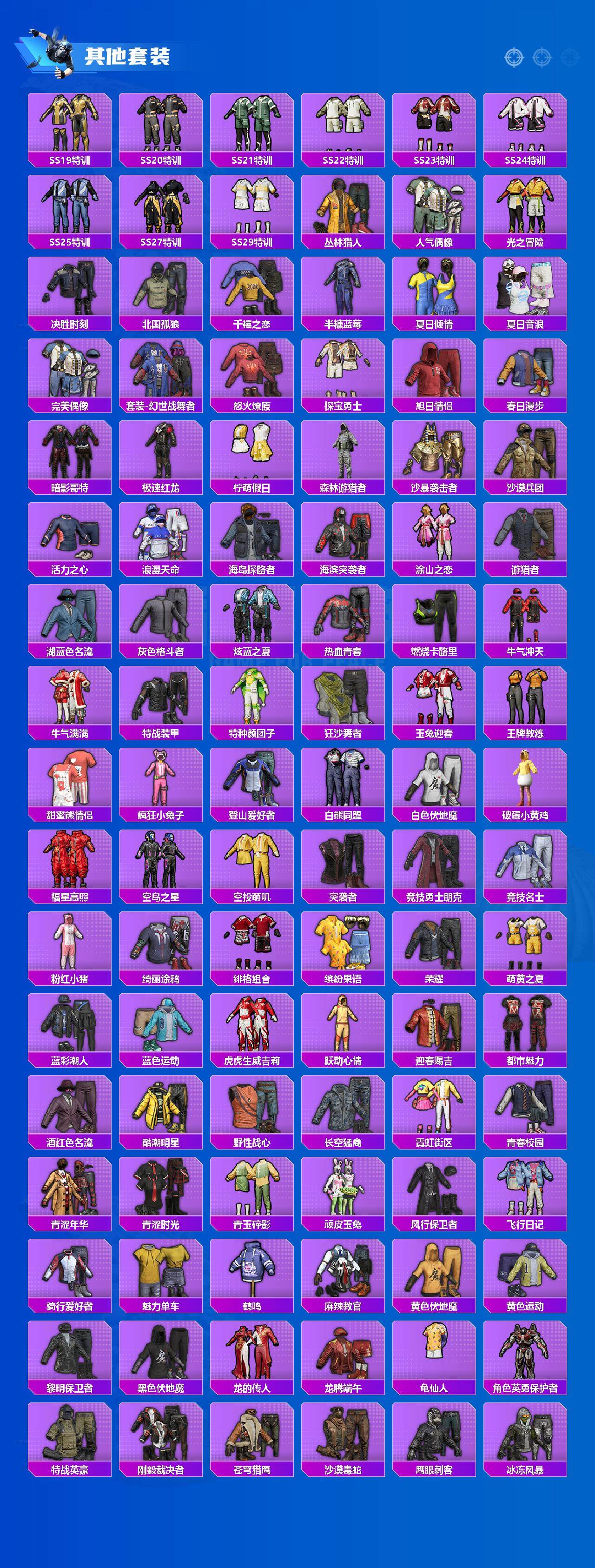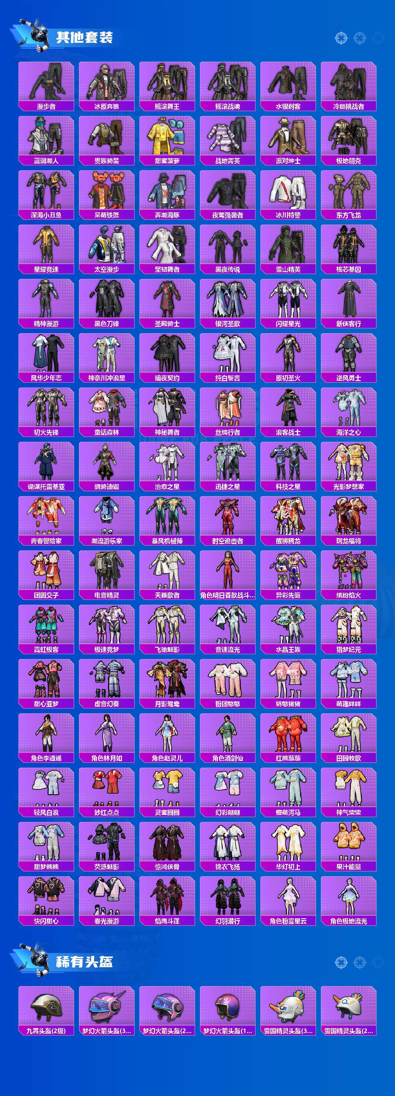 【粉色套装】:粉装-极限特训,粉装-星际漫游者,粉装-怪诞乔克,粉装-甜心巧克力,粉装-宝贝奶油派,粉装-天使彩虹糖,粉装-雪国幻梦,粉装-梦幻火箭,粉装-缤纷油彩,粉装-放客神游,粉装-极致幻想,粉装-星空之魅,粉装-潮汐统领,粉装-炙焰红王,粉装-香水柠檬,粉装-骨龙祭渊,粉装-齐天大圣,角色-零号机款机体服,粉装-甜梦小狐,蜀山剑侠-李逍遥,粉装-甜蜜草莓,粉装-未来歌姬,角色-千金淑猫,粉装-星穹咏叹调,粉装-幻彩电音,角色-狂魅哈莉,角色-羊梦糖心
