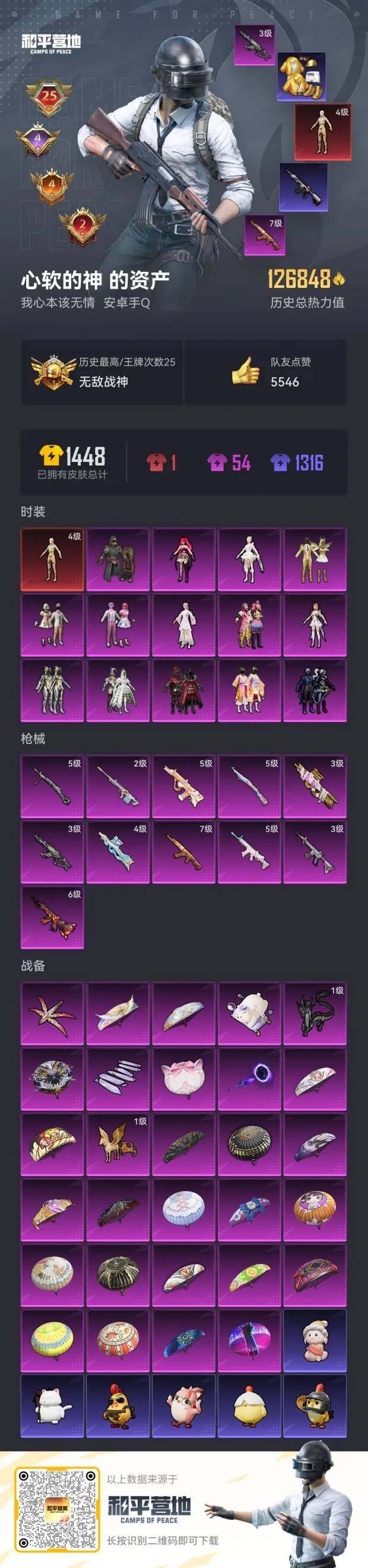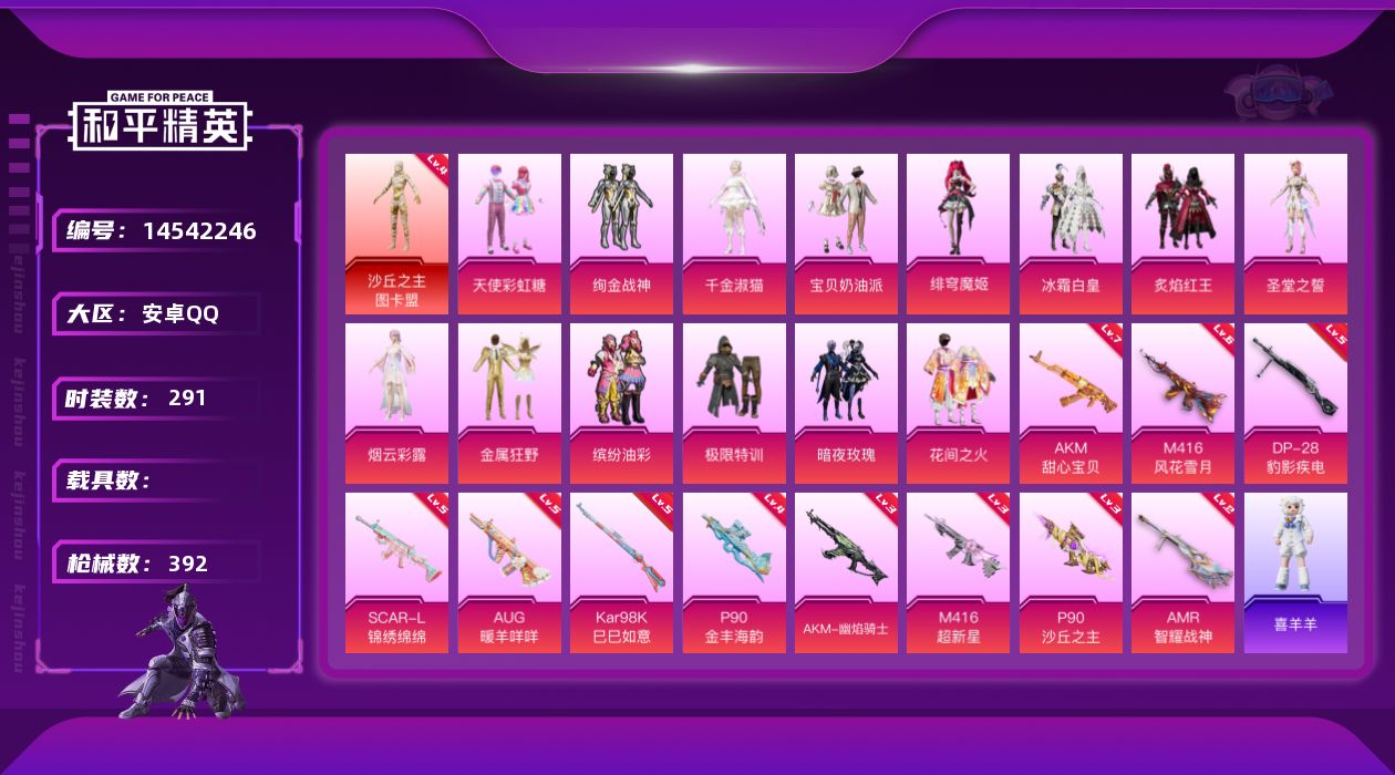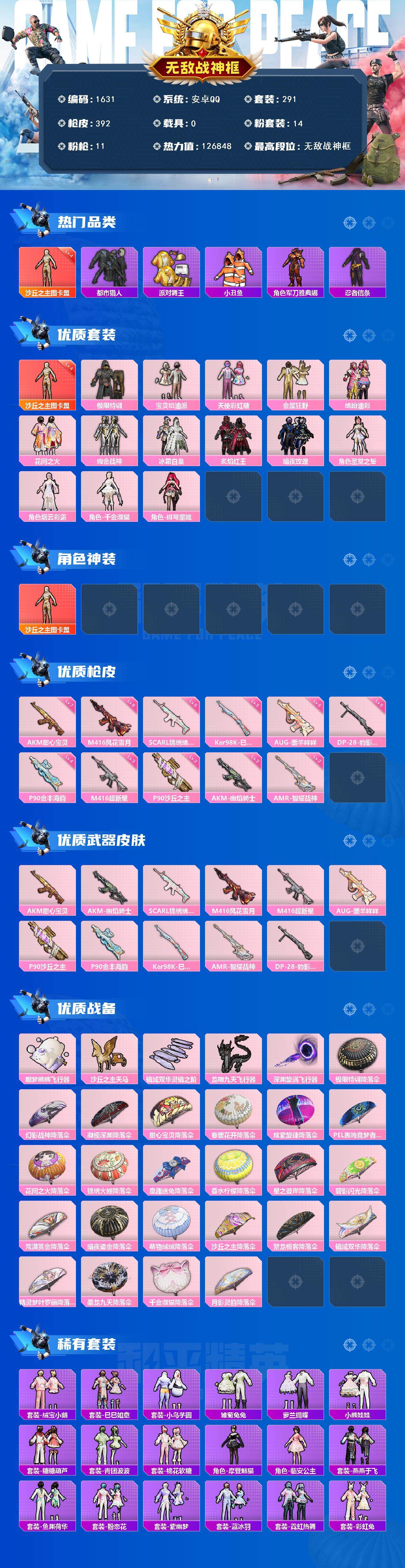 [14542246]安卓 手Q-无敌战神框-1神装-14粉装-11特效枪-0载具-6粉色飞行器-126848热力值-25王牌印记-291套装-392枪皮