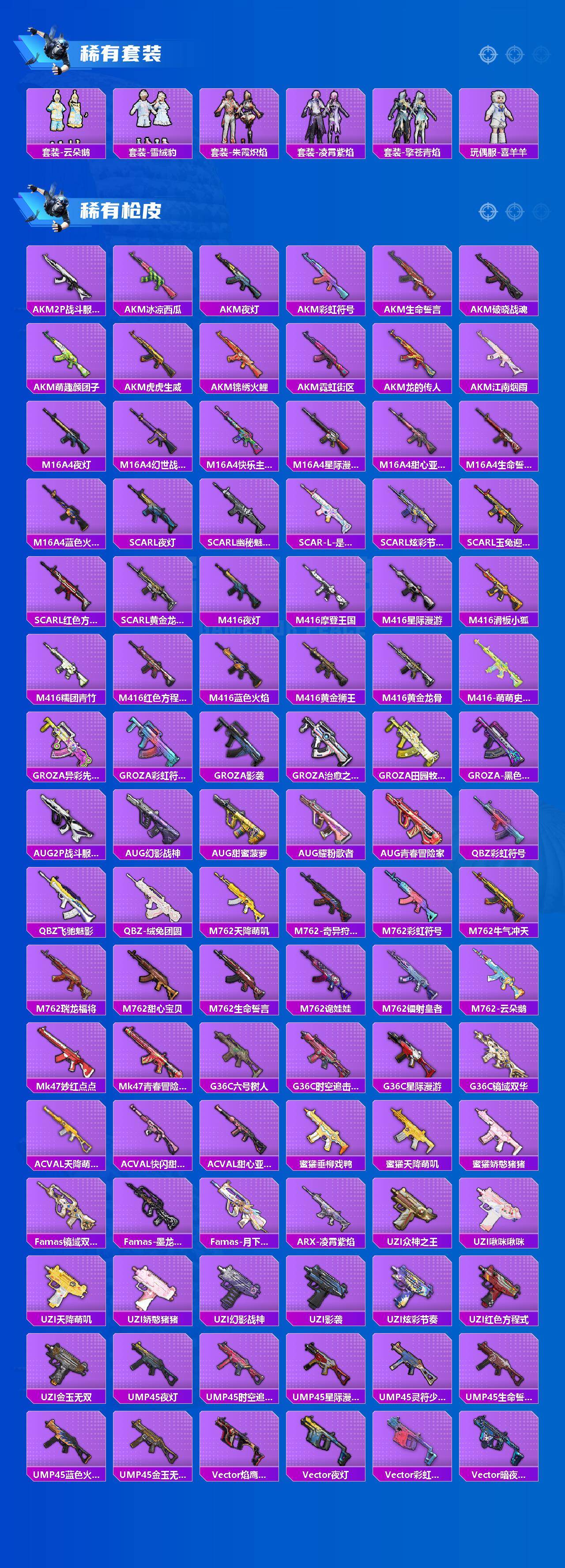 - [12583918]安卓 手Q-1神装-7粉装-8特效枪-3载具-10粉色飞行器-47295热力值-2王牌印记-91套装-128枪皮 【红色神装等级】:幽焰骑士-维塔(三级) 【红色角色神装】:幽焰骑士-维塔 【粉色载具】:幽焰风驰摩托车,星梦玉骢,护世瑞兽 【粉色套装】:角色-星梦奇缘,角色-狂花道·不知火舞,角色-千金淑猫,角色-萨利娅,粉装-雪月幻音,粉装-幻彩电音 【粉色枪皮等级】:AKM-幽焰骑士(三级),GROZA-镜光银凌(五级),AUG-许七安(五级),AUG-暖羊咩咩(五级),Kar98K-巳巳如意(五级),SVD-月影灵韵(一级),DP-28-千金淑猫(一级),爆炸猎弓-拳皇·狂花道(四级) 【粉色枪皮】:AKM-幽焰骑士,GROZA-镜光银凌,AUG-许七安,AUG-暖羊咩咩,Kar98K-巳巳如意,SVD-月影灵韵,DP-28-千金淑猫,爆炸猎弓-拳皇·狂花道 【粉色飞行器】:酣梦熊熊飞行器,星梦奇缘飞行器,英伦信使飞行器,BEARBRICK飞行器,幽焰列车飞行器,凤舞九天飞行器,圣域金龙飞行器,幻星舰长飞行器,时光之誓飞行器 【粉色降落伞】:精灵梦叶罗丽降落伞,星梦奇缘降落伞,拳皇·狂花道降落伞,未来领航者降落伞,幽焰骑士降落伞,千金淑猫降落伞,临安公主降落伞,月影灵韵降落伞,动力核心降落伞,智耀战神降落伞 【稀有套装】:套装-巳巳如意,套装-雏菊兔兔,套装-萝兰蝴蝶,套装-小熊娃娃,角色-狂花道·娜可露露,角色-狂花道·雅典娜,套装-火种守卫者,套装-糖糖葫芦,套装-青团波波,套装-棉花软糖,角色-都市丽猫,角色-摩登魅猫,角色-许七安,角色-临安公主,角色-怀庆长公主,套装-裁决天象,角色-俏兔智灵,角色-光矢逐梦,套装-燕燕于飞,套装-鱼渊荷华,套装-闪电轻猫,套装-焰舞炽心,套装-粉恋花,套装-紫幽梦,套装-蓝冰羽,套装-星渊小夜曲,套装-雪绒豹 【稀有枪皮】:AKM-彩虹符号,AKM-灼热熔岩,M16A4-幻世战舞者,M16A4-千金淑猫,SCAR-L-炫彩节奏,SCAR-L-玉兔迎春,AUG-甜蜜菠萝,AUG-月影灵韵,M762-天降萌叽,M762-云朵鹅,AC-VAL-天降萌叽,AC-VAL-圣辉之星,AC-VAL-时光之吻,UZI-天降萌叽,UZI-月影灵韵,UMP45-电音之王,P90-金蛇镇世,P90-巳巳如意,M24-炫彩节奏,AWM-