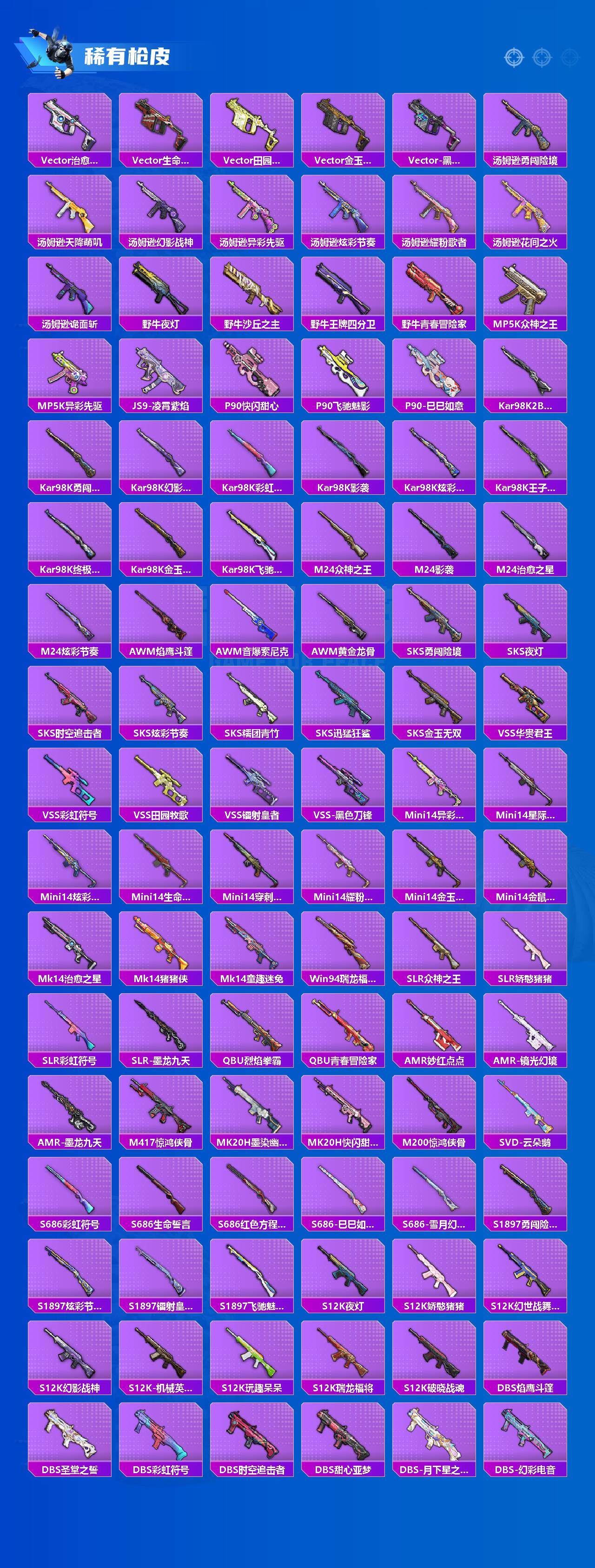 【粉色枪皮】:AKM-甜心宝贝,AKM-幽焰骑士,SCAR-L-锦绣绵绵,M416-风花雪月,M416-超新星,AUG-暖羊咩咩,P90-沙丘之主,P90-金丰海韵,Kar98K-巳巳如意,AMR-智耀战神,DP-28-豹影疾电