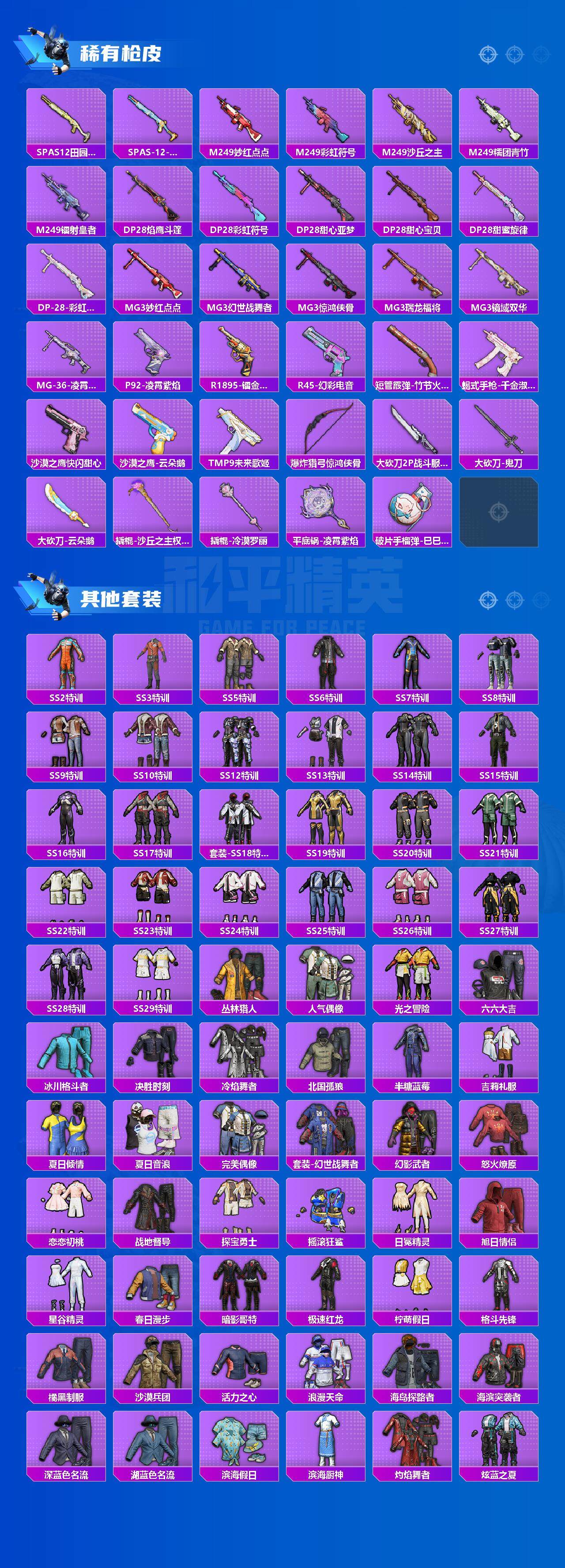 - [12810943]安卓 手Q-8粉装-6特效枪-2载具-2粉色飞行器-88062热力值-19王牌印记-206套装-280枪皮 【热门品类】:套装-浪漫天命,套装-赤蝎幽灵,套装-都市猎人,套装-天网终结者,套装-金羽特工,套装-龟仙人,套装-暗影哥特,套装-粉红小猪 【粉色载具】:特斯拉Roadster(水滴蓝),特斯拉Roadster(沁心粉),空客H135-蔚蓝之翼 【粉色套装】:粉装-精灵迷巫,粉装-翡翠骑士,粉装-绚金战神,粉装-王牌四分卫,粉装-碧影闪光,粉装-未来歌姬,角色-千金淑猫,角色-绯穹魔姬 【粉色枪皮等级】:M416-五爪金龙(七级),AUG-暖羊咩咩(五级),M762-青锋波束(五级),Kar98K-巳巳如意(五级),AMR-智耀战神(七级),PKM-江南烟雨(七级) 【粉色枪皮】:M416-五爪金龙,AUG-暖羊咩咩,M762-青锋波束,Kar98K-巳巳如意,AMR-智耀战神,PKM-江南烟雨 【粉色飞行器】:终极赛罗飞行器,王牌四分卫飞行器 【粉色降落伞】:甜心宝贝降落伞,夏日绵绵冰降落伞,银刃赛罗降落伞,王牌四分卫降落伞,暗夜玫瑰降落伞,蓝莓炮弹降落伞,绿意幻情降落伞,炙焰牛王降落伞,垂柳戏鸭降落伞,第五大道降落伞,猪猪侠降落伞,精灵梦叶罗丽降落伞,金丰海韵降落伞 【稀有套装】:套装-龟仙人,套装-巳巳如意,套装-糖糖葫芦,套装-青团波波,套装-棉花软糖,角色-摩登魅猫,套装-燕燕于飞,套装-鱼渊荷华,角色-海琴烟,套装-闪电轻猫,角色-糖霜甜心,套装-粉恋花,套装-紫幽梦,套装-蓝冰羽,套装-星渊小夜曲,套装-霓虹热舞,套装-云朵鹅,套装-雪绒豹 【稀有枪皮】:AKM-冰凉西瓜,AKM-夜灯,AKM-彩虹符号,AKM-灼热熔岩,AKM-生命誓言,AKM-破晓战魂,AKM-萌趣颜团子,AKM-虎虎生威,AKM-霓虹街区,AKM-龙的传人,M16A4-幻世战舞者,M16A4-甜心亚梦,M16A4-红色方程式,M16A4-蓝色火焰,SCAR-L-夏日绵绵冰,SCAR-L-夜灯,SCAR-L-炫彩节奏,SCAR-L-玉兔迎春,SCAR-L-王牌四分卫,SCAR-L-红色方程式,M416-夜灯,M416-暗夜行者,M416-滑板小狐,M416-糯团青竹,M416-红色方程式,M416-蓝色火焰,GROZA-异彩先驱,GROZA-彩虹符号,GROZA-影袭,G