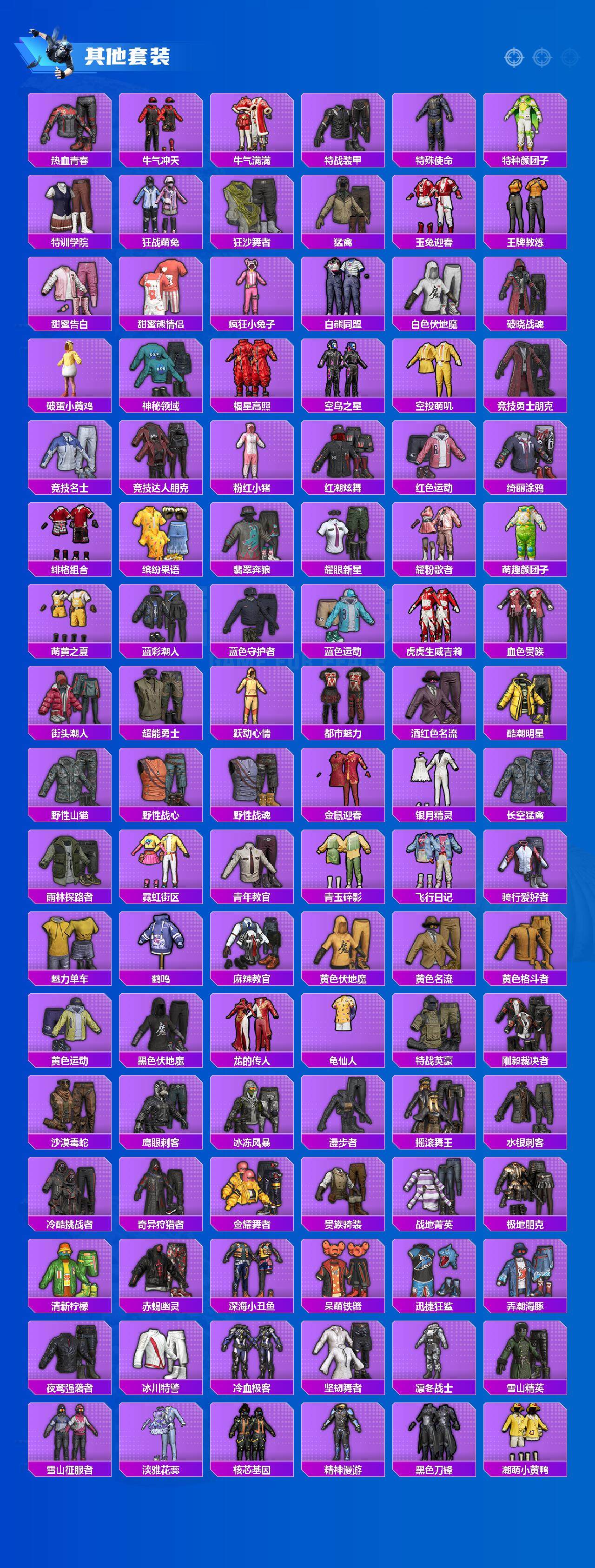 套装-浪漫天命,角色-军刀雅典娜,忍者信条套装,套装-龟仙人,套装-暗影哥特,套装-粉红小猪,角色-Mark.06,套装-极速红龙,套装-狂沙舞者,套装-破蛋小黄鸡,套装-漫步者,套装-水银刺客,套装-弄潮海豚,套装-雪山精英,套装-黑色刀锋,套装-瑞龙福将,套装-团圆交子
