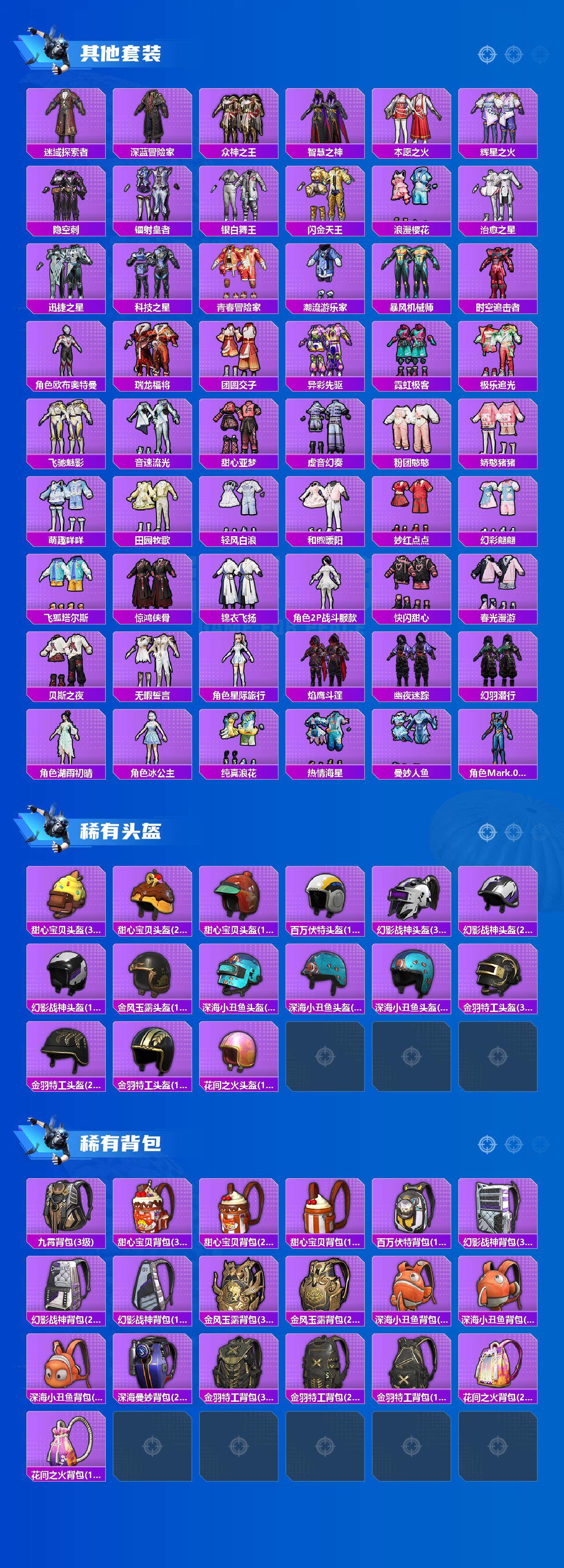 【热门品类】:粉装-缤纷油彩,套装-浪漫天命,套装-赤蝎幽灵,套装-都市猎人,套装-派对舞王,套装-深海小丑鱼,套装-小丑鱼,套装-奇异狩猎者,角色-军刀雅典娜,套装-忍者信条,角色-2P战斗服款,套装-龟仙人,套装-潮萌小黄鸭,套装-暗影哥特,套装-粉红小猪,角色-Mark.06,M416-星际漫游