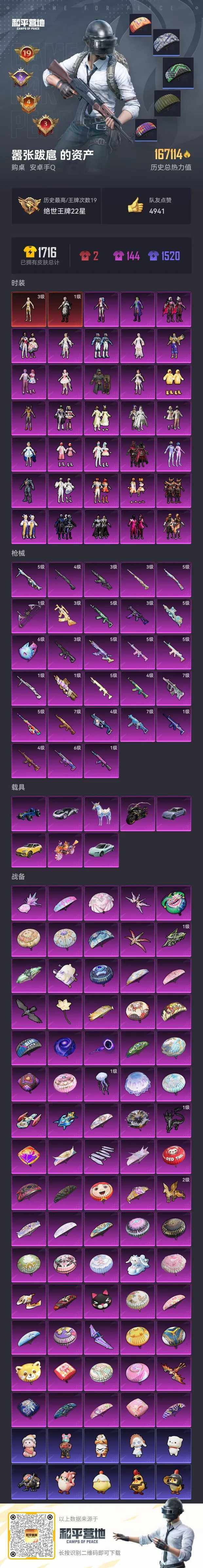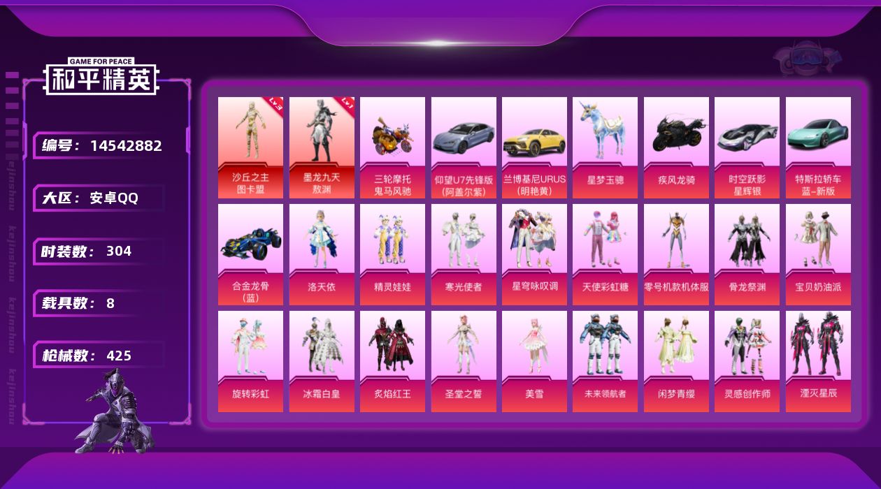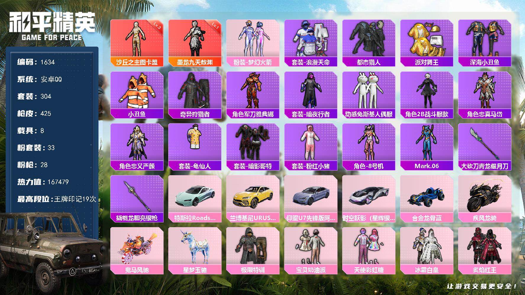[14542882]安卓 手Q-2神装-33粉装-28特效枪-8载具-18粉色飞行器-167479热力值-19王牌印记-304套装-425枪皮