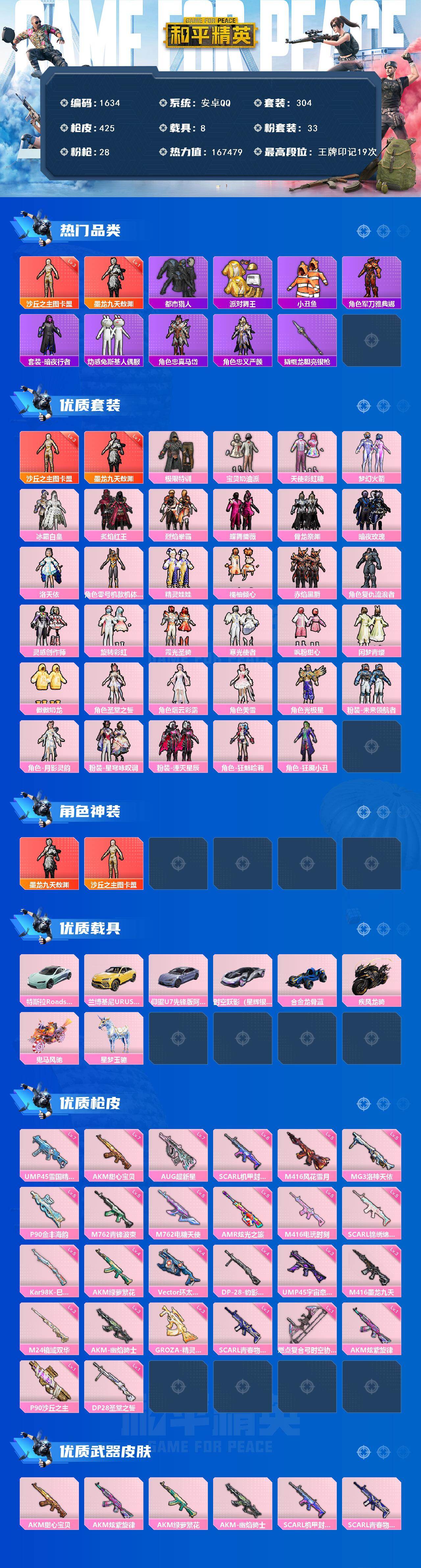 [14542882]安卓 手Q-2神装-33粉装-28特效枪-8载具-18粉色飞行器-167479热力值-19王牌印记-304套装-425枪皮 【红色神装等级】:墨龙九天-敖渊(一级),沙丘之主-图卡盟(三级) 【红色角色神装】:墨龙九天-敖渊,沙丘之主-图卡盟 【热门品类】:粉装-梦幻火箭,套装-浪漫天命,套装-都市猎人,套装-派对舞王,套装-深海小丑鱼,套装-小丑鱼,套装-奇异狩猎者,角色-军刀雅典娜,套装-暗夜行者,套装-动感兔斯基人偶服,角色-2B战斗服款,角色-忠真马岱,角色-忠义严颜,套装-龟仙人,套装-暗影哥特,套装-粉红小猪,角色-8号机,角色-Mark.06,大砍刀-青龙偃月刀,撬棍-龙胆亮银枪 【粉色载具】:特斯拉Roadster(水滴蓝),兰博基尼URUS(明艳黄),仰望U7(阿盖尔紫),时空跃影(星辉银),合金龙骨(蓝),疾风龙骑,鬼马风驰,星梦玉骢 【粉色套装】:粉装-极限特训,粉装-宝贝奶油派,粉装-天使彩虹糖,粉装-梦幻火箭,粉装-冰霜白皇,粉装-炙焰红王,粉装-烈焰拳霸,粉装-蝶舞蔷薇,粉装-骨龙祭渊,粉装-暗夜玫瑰,角色-洛天依,角色-零号机款机体服,粉装-精灵娃娃,粉装-橘柚倾心,粉装-赤焰黑爵,角色-复仇流浪者,粉装-灵感创作师,粉装-旋转彩虹,粉装-霞光圣骑,粉装-寒光使者,粉装-飒粉甜心,粉装-闲梦青缨,粉装-傲傲奶龙,角色-圣堂之誓,角色-烟云彩露,角色-美雪,角色-光极星,粉装-未来领航者,角色-月影灵韵,粉装-星穹咏叹调,粉装-湮灭星辰,角色-狂魅哈莉,角色-狂魇小丑 【粉色枪皮等级】:AKM-甜心宝贝(七级),AKM-炫紫旋律(一级),AKM-绿萝繁花(四级),AKM-幽焰骑士(三级),SCAR-L-机甲封神(六级),SCAR-L-青春物语(一级),SCAR-L-锦绣绵绵(五级),M416-风花雪月(五级),M416-电玩时刻(五级),M416-墨龙九天(三级),GROZA-精灵之光(三级),AUG-超新星(七级),M762-电糖天使(五级),M762-青锋波束(五级),UMP45-雪国精灵(七级),UMP45-宇宙意志(三级),Vector-环太平洋(四级),P90-沙丘之主(一级),P90-金丰海韵(五级),Kar98K-巳巳如意(五级),M24-镜域双华(三级),AMR-炫光之旅(五级),DP-28-圣堂之誓(一级),DP-28