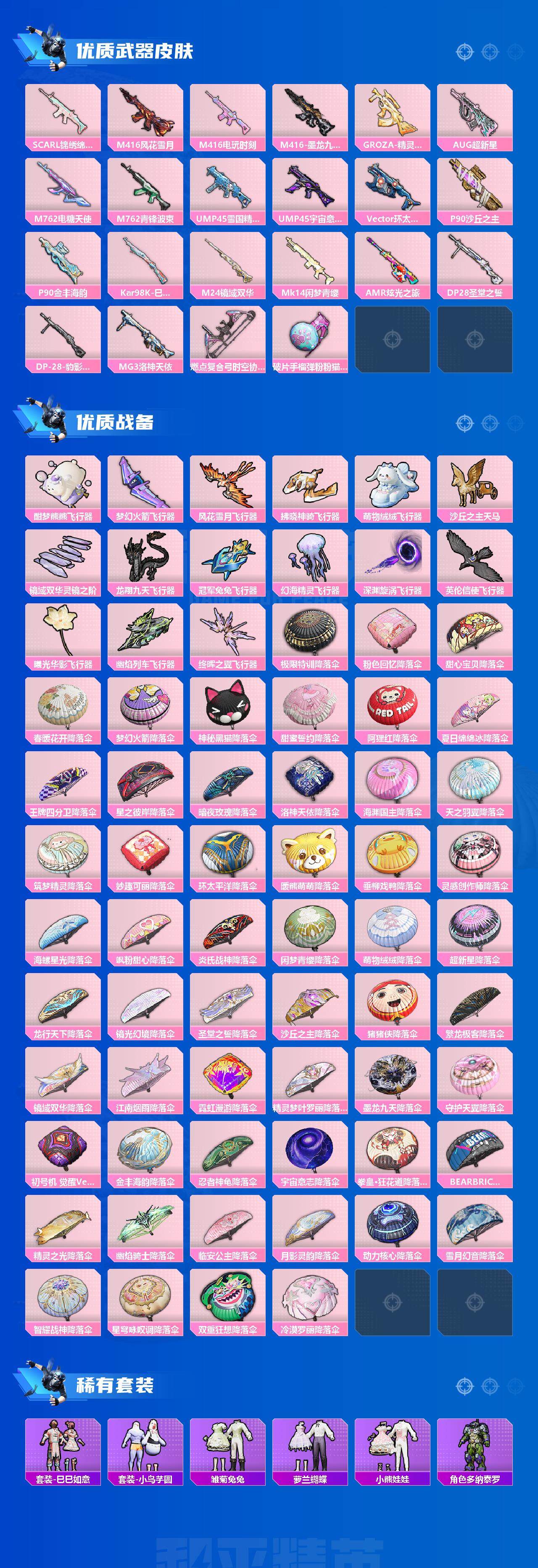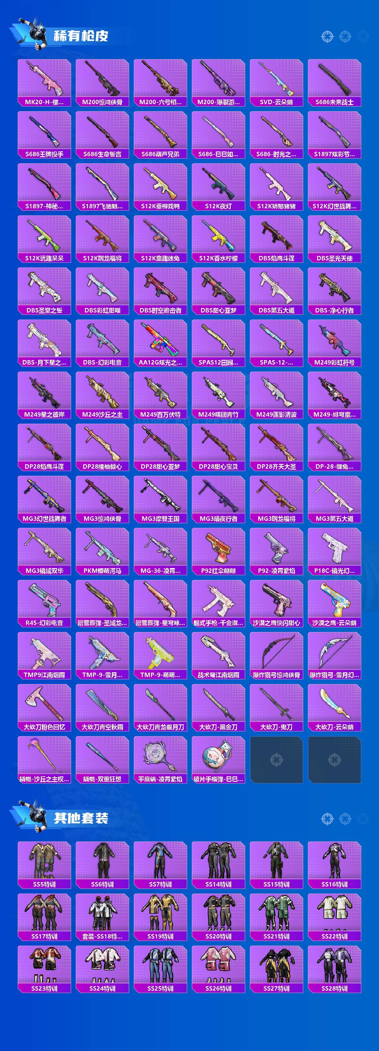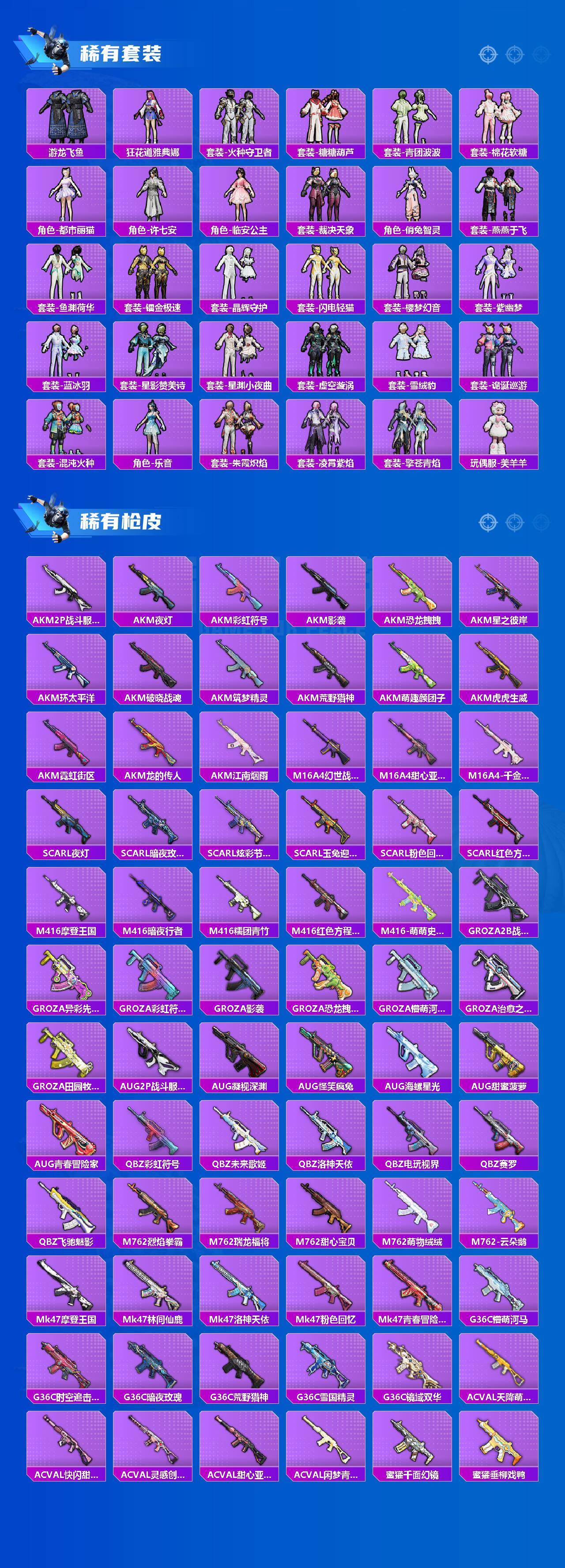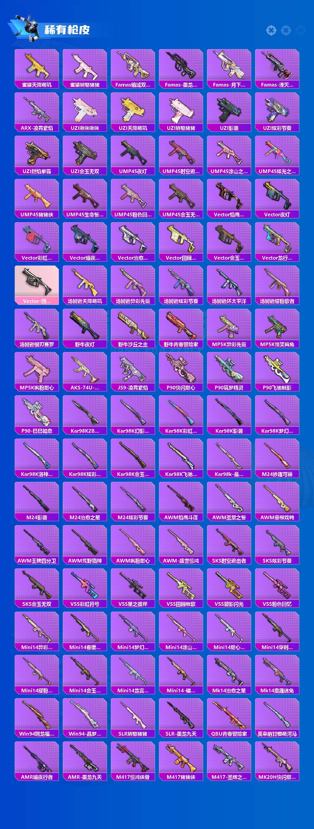 AKM-甜心宝贝,AKM-炫紫旋律,AKM-绿萝繁花,AKM-幽焰骑士,SCAR-L-机甲封神,SCAR-L-青春物语,M416-风花雪月,M416-电玩时刻,M416-墨龙九天,GROZA-精灵之光,AUG-超新星,M762-电糖天使,M762-青锋波束,UMP45-雪国精灵,UMP45-宇宙意志,Vector-环太平洋,P90-沙丘之主,P90-金丰海韵,Kar98K-巳巳如意,M24-镜域双华,Mk14-闲梦青缨,AMR-炫光之旅,DP-28-圣堂之誓,MG3-洛神天依,破片手榴弹-粉粉猫爪