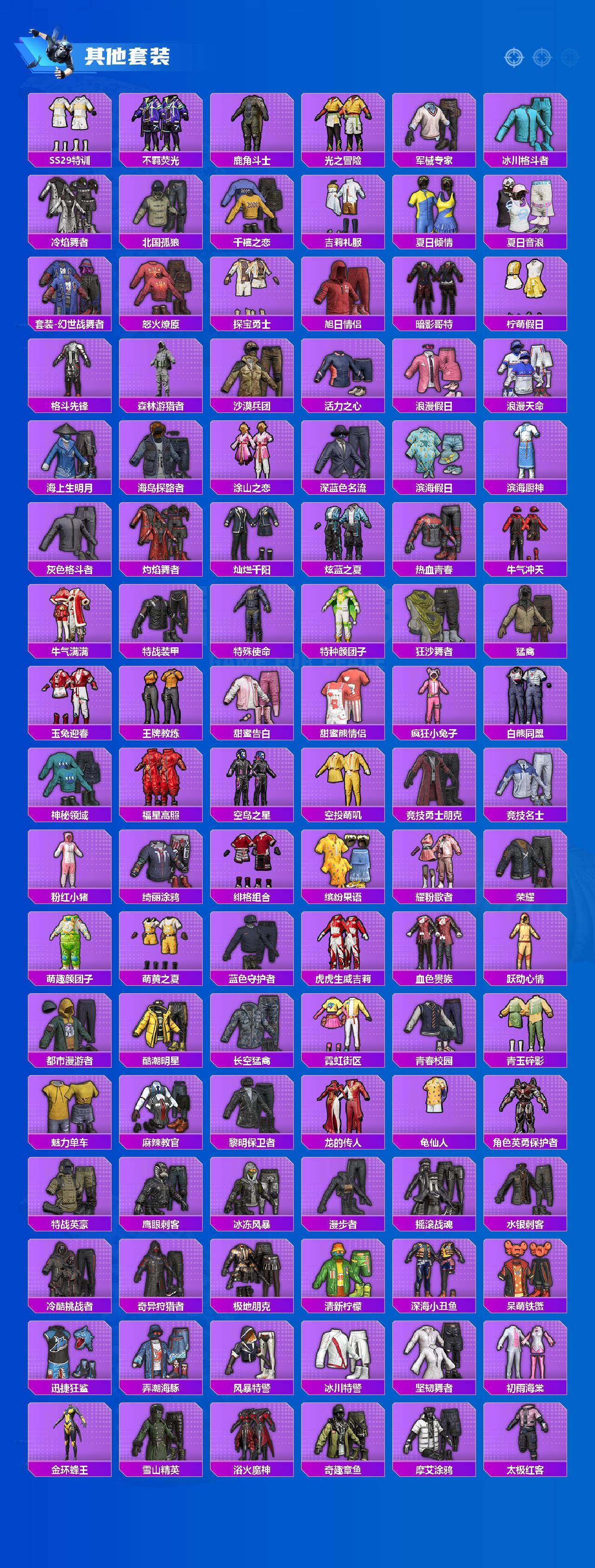 套装-浪漫天命,角色-军刀雅典娜,套装-龟仙人,套装-暗影哥特,套装-粉红小猪,角色-8号机,角色-Mark.06,套装-狂沙舞者,角色-英勇保护者,套装-漫步者,套装-水银刺客,套装-弄潮海豚,套装-雪山精英,套装-瑞龙福将,套装-团圆交子