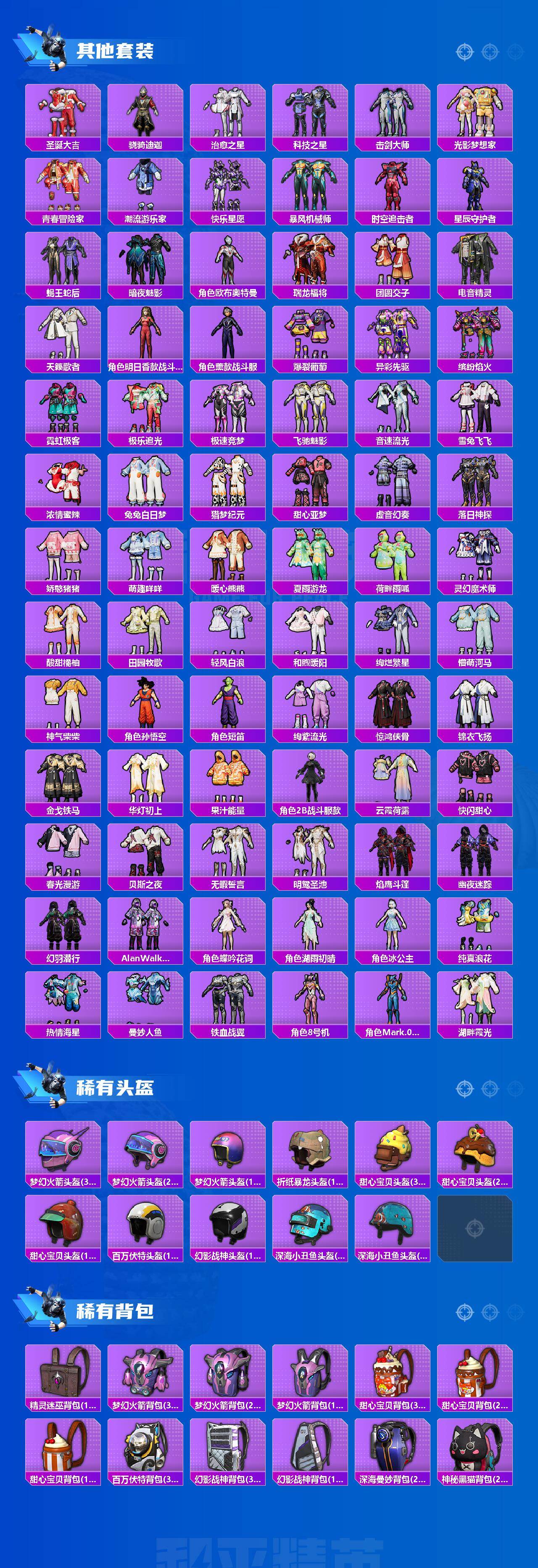 【粉色套装】:粉装-极限特训,粉装-宝贝奶油派,粉装-天使彩虹糖,粉装-梦幻火箭,粉装-冰霜白皇,粉装-炙焰红王,粉装-烈焰拳霸,粉装-蝶舞蔷薇,粉装-骨龙祭渊,粉装-暗夜玫瑰,角色-洛天依,角色-零号机款机体服,粉装-精灵娃娃,粉装-橘柚倾心,粉装-赤焰黑爵,角色-复仇流浪者,粉装-灵感创作师,粉装-旋转彩虹,粉装-霞光圣骑,粉装-寒光使者,粉装-飒粉甜心,粉装-闲梦青缨,粉装-傲傲奶龙,角色-圣堂之誓,角色-烟云彩露,角色-美雪,角色-光极星,粉装-未来领航者,角色-月影灵韵,粉装-星穹咏叹调,粉装-湮灭星辰,角色-狂魅哈莉,角色-狂魇小丑