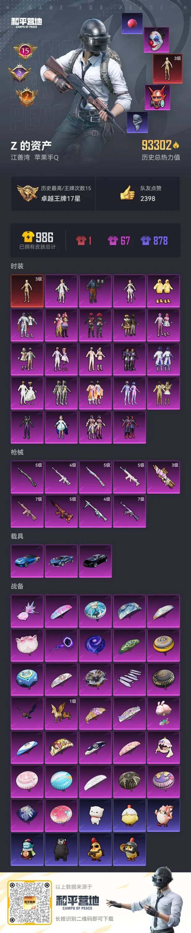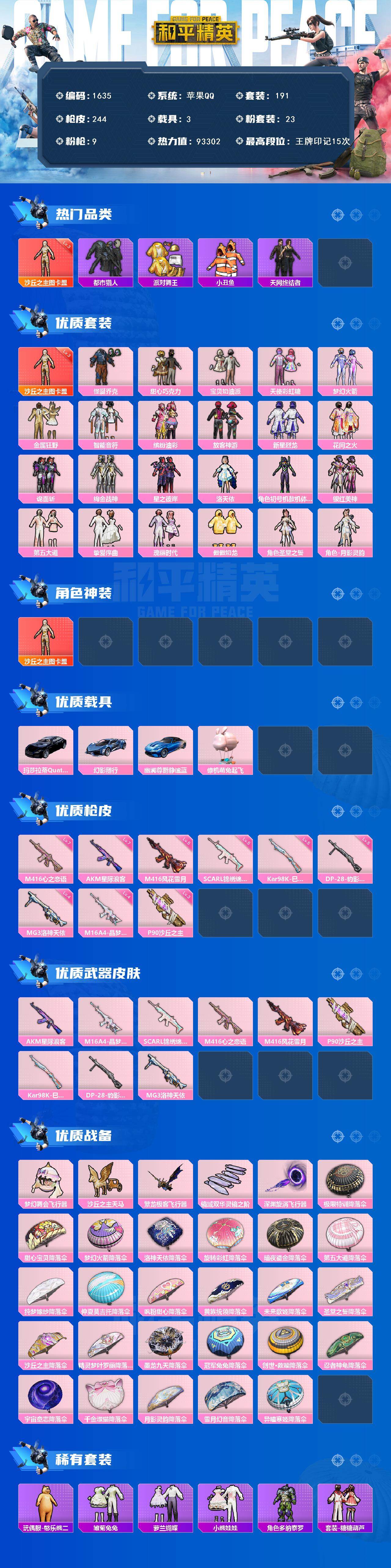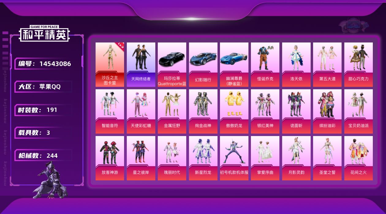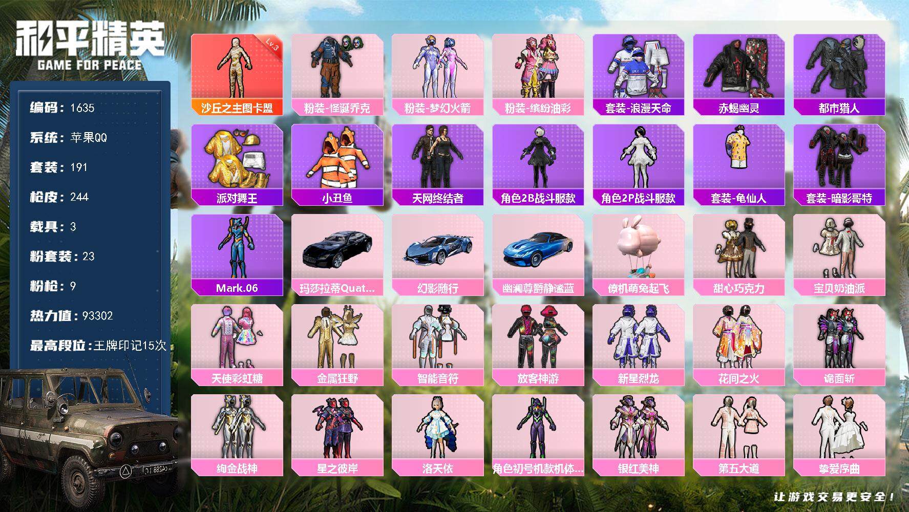 [14543086]苹果 手Q-1神装-23粉装-9特效枪-3载具-6粉色飞行器-93302热力值-15王牌印记-191套装-244枪皮
