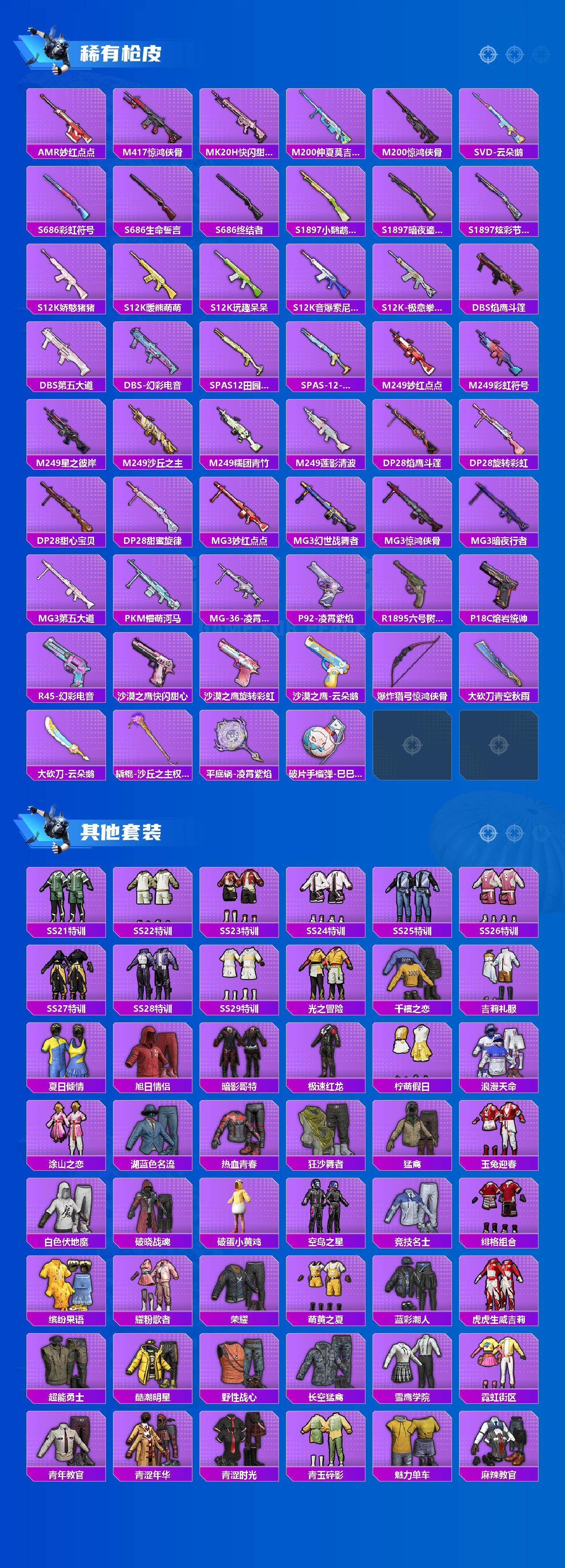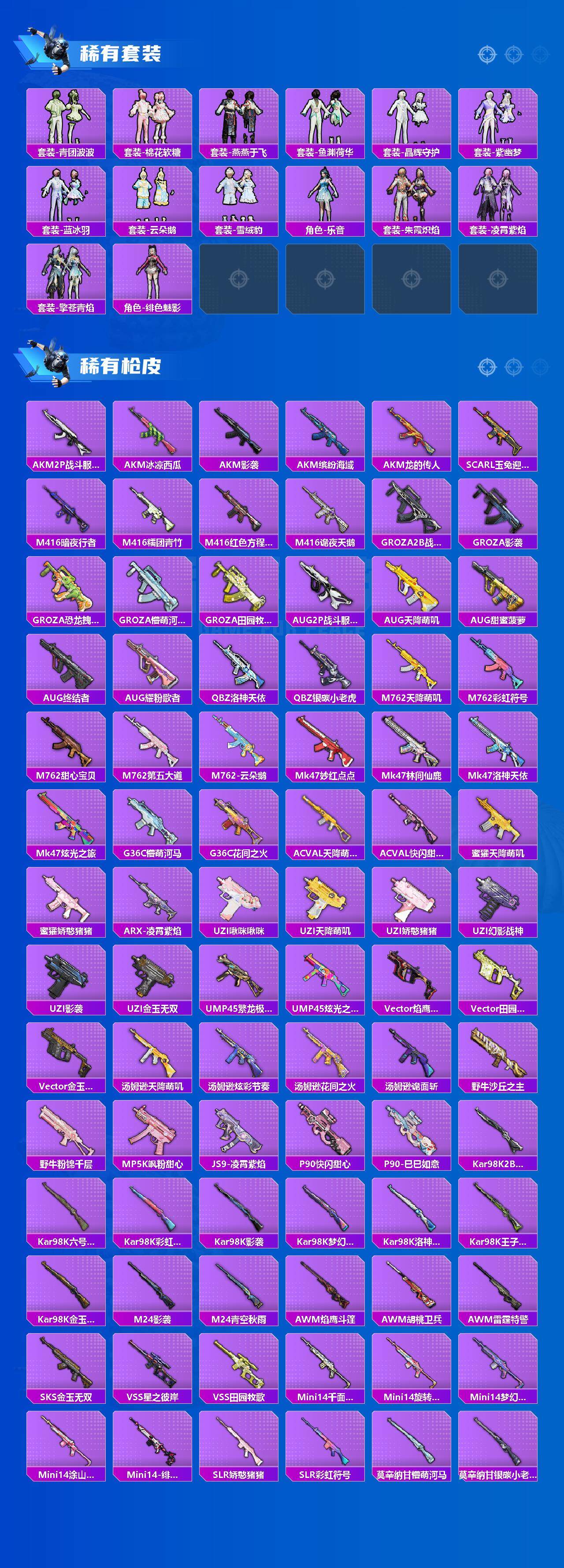 【粉色枪皮】:AKM-星际浪客,M16A4-晶梦幻蝶,SCAR-L-锦绣绵绵,M416-心之恋语,M416-风花雪月,P90-沙丘之主,Kar98K-巳巳如意,DP-28-豹影疾电,MG3-洛神天依